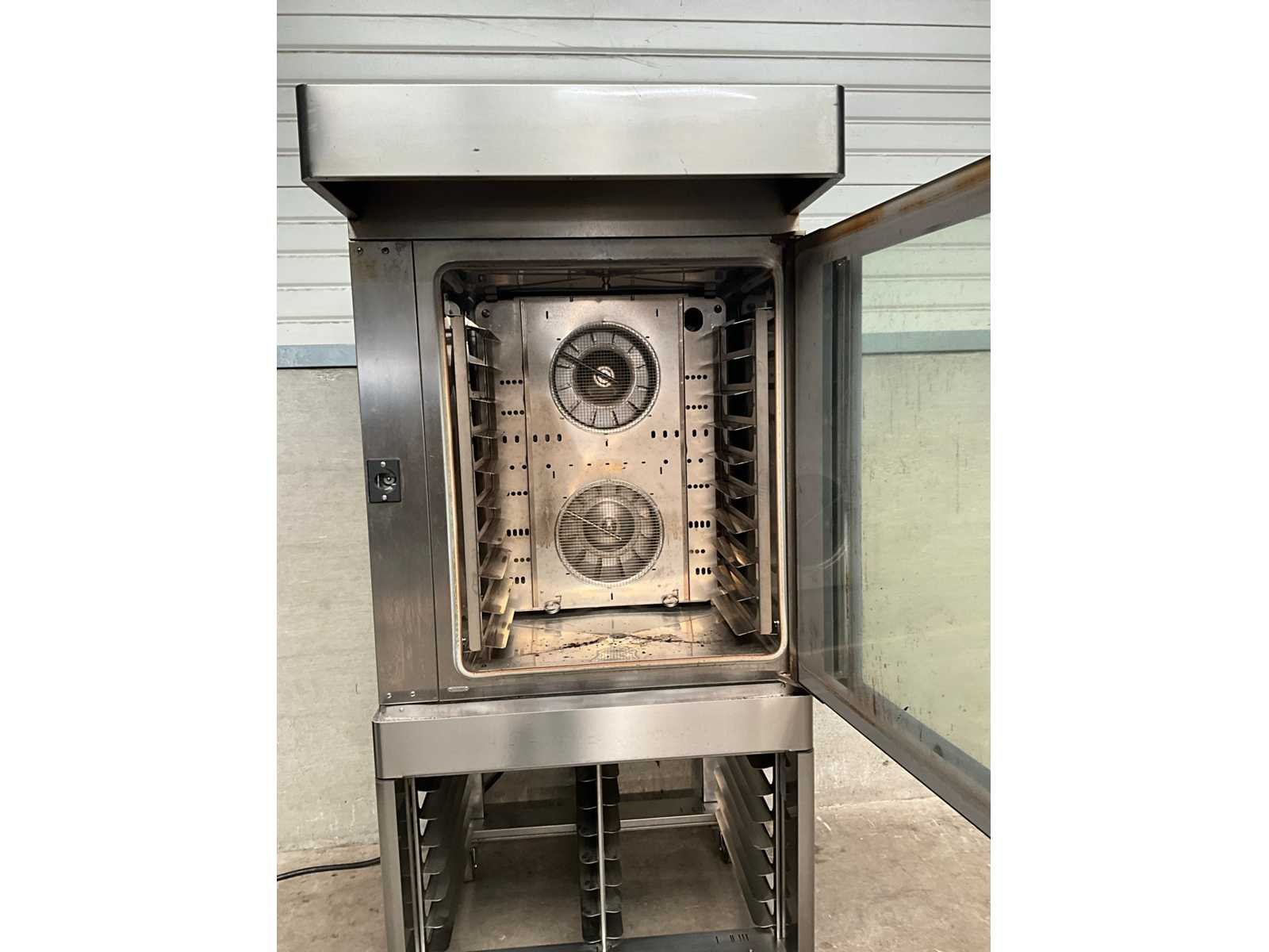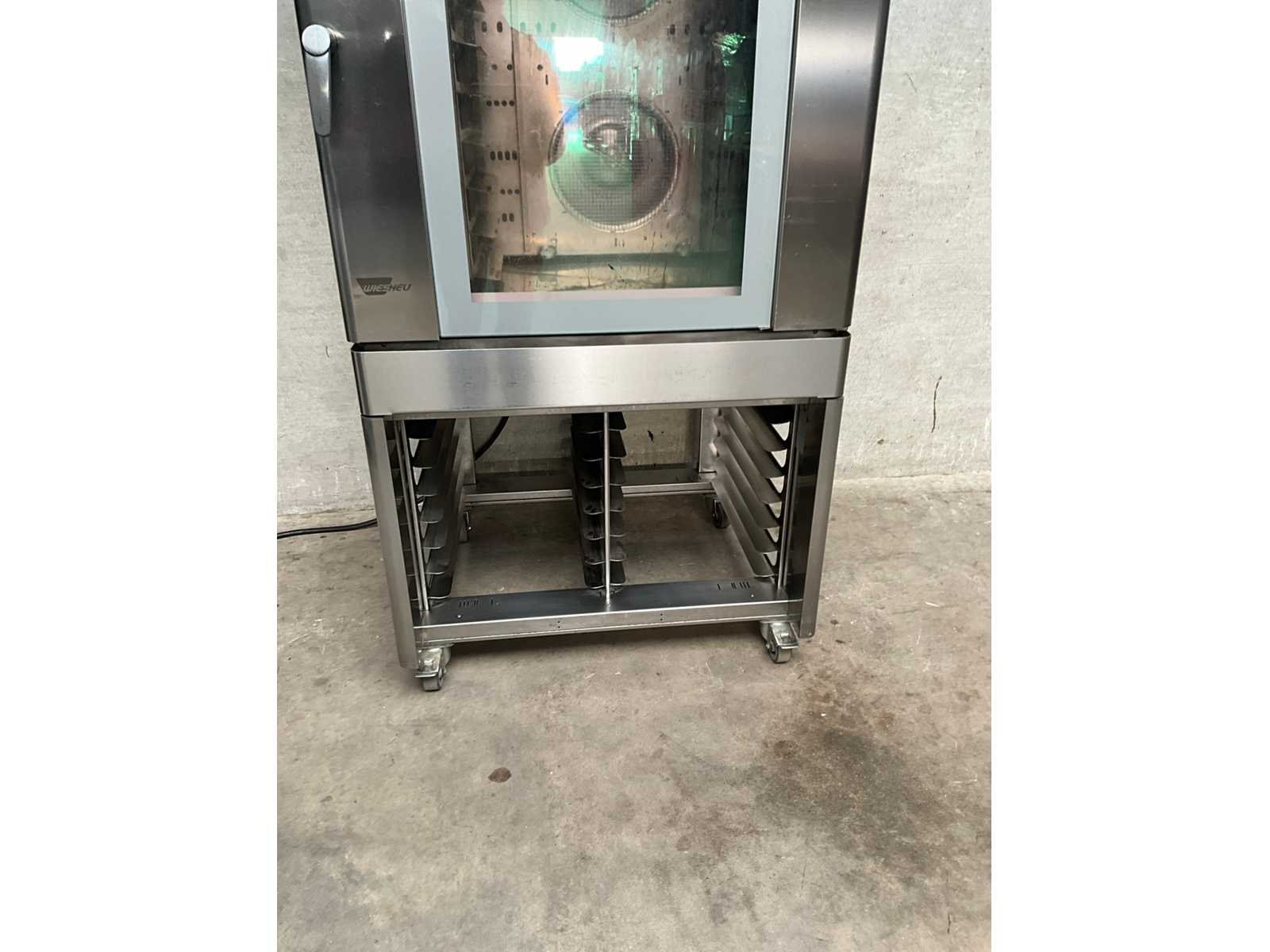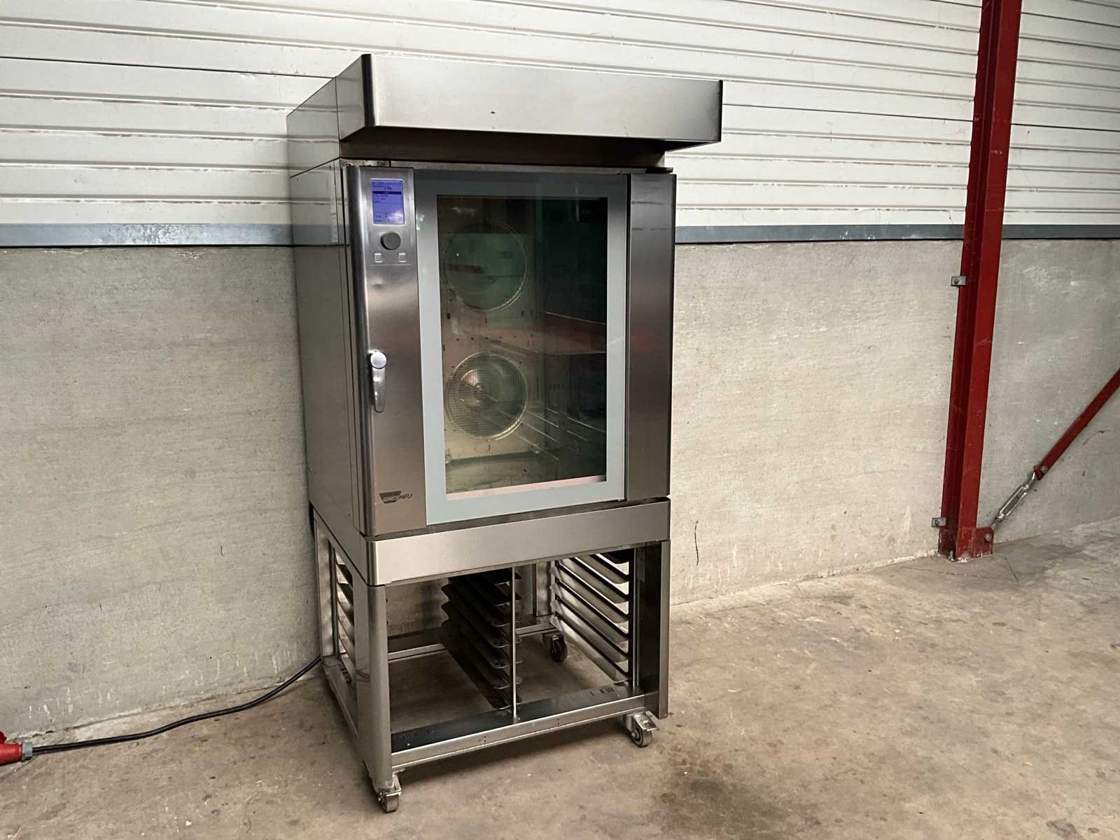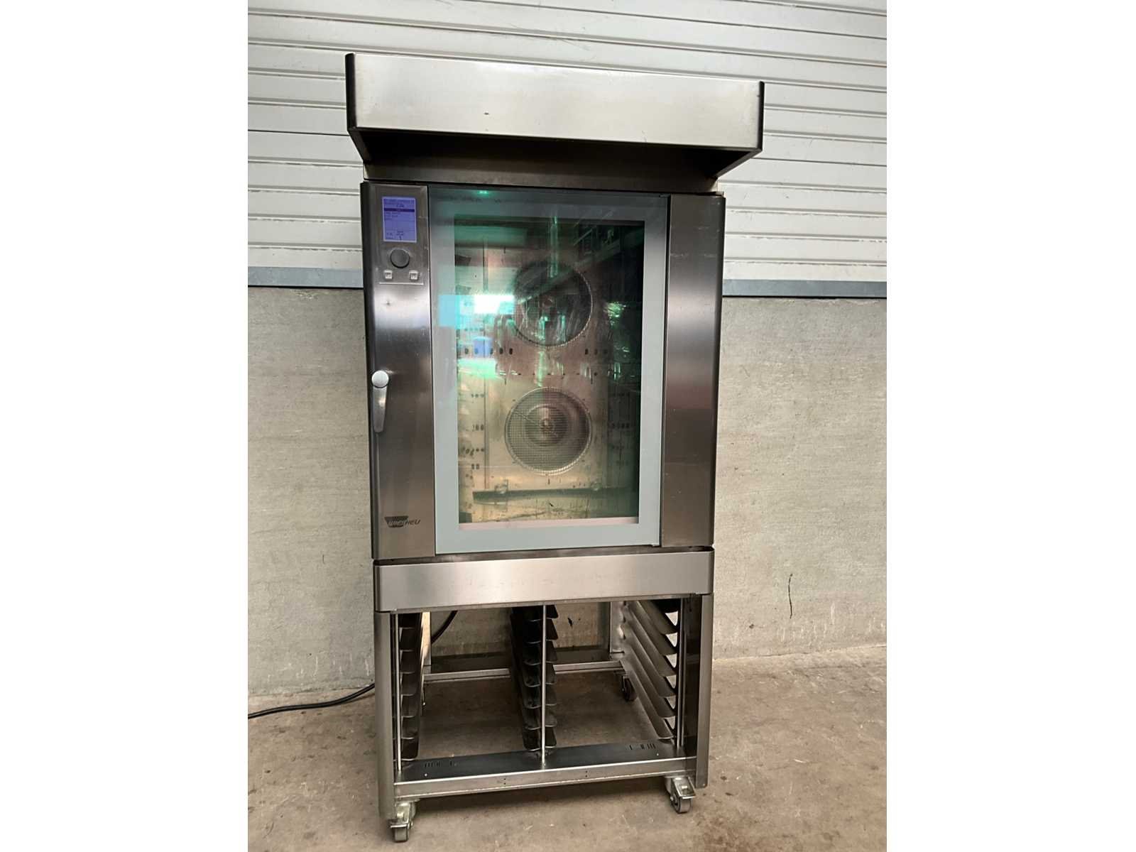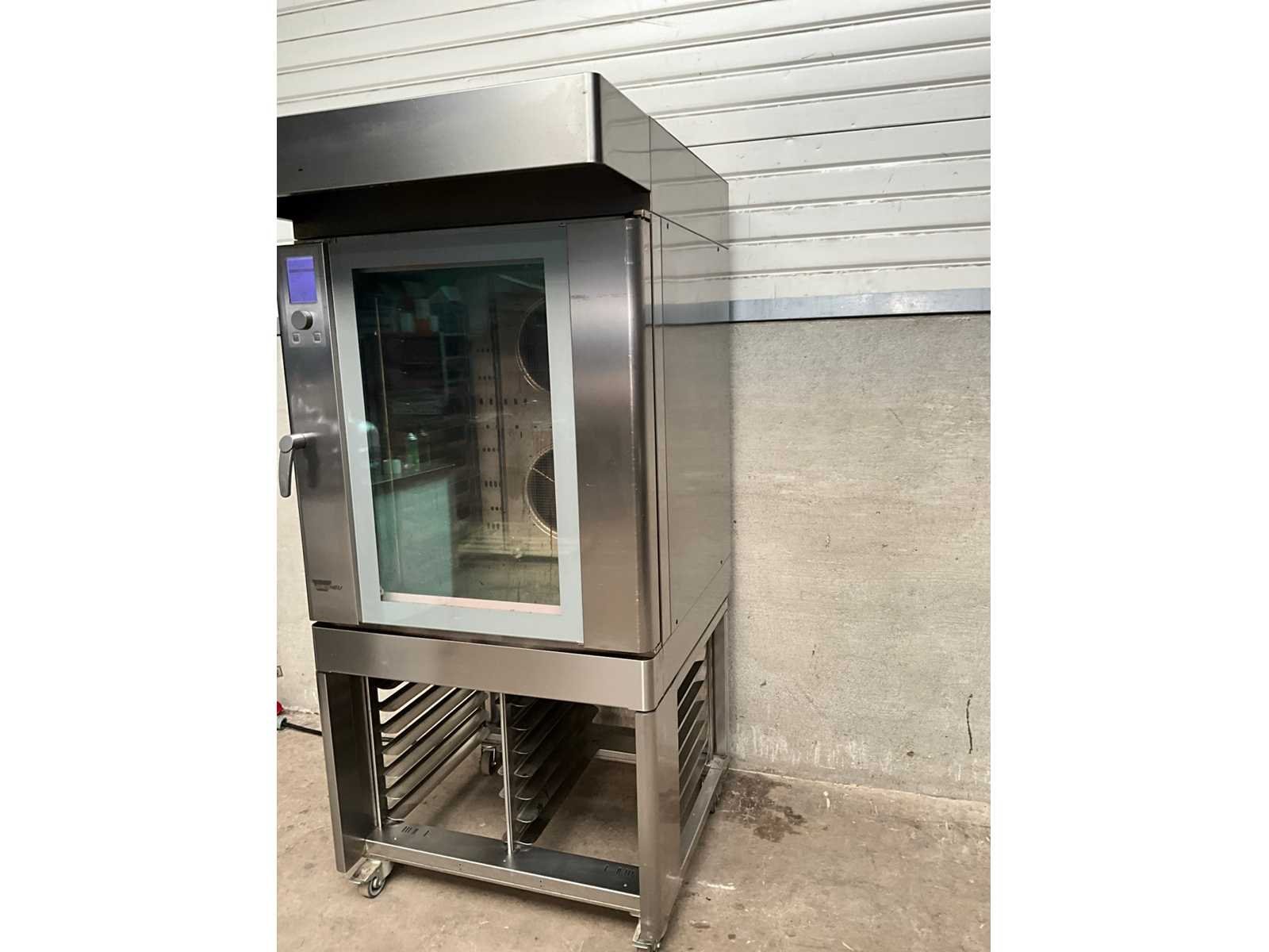 Rvs oven met 10 regalen op verrijdbaar rvs onderstel met 12 regalen en afzuigkap Merk: Wiesheu Digitale besturing: true Aansluiting: 400V Elektrisch: true Rvs: true Totale afmeting L: 94cm Totale afmeting Breedte: 112cm Totale afmeting Hoogte: 200cm Met onderstel: true