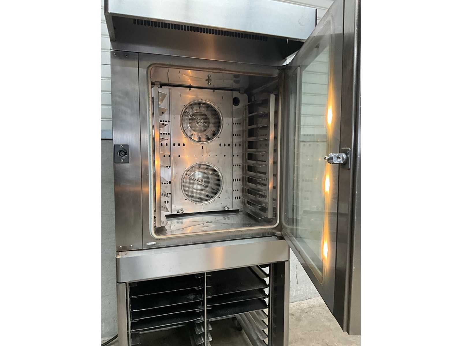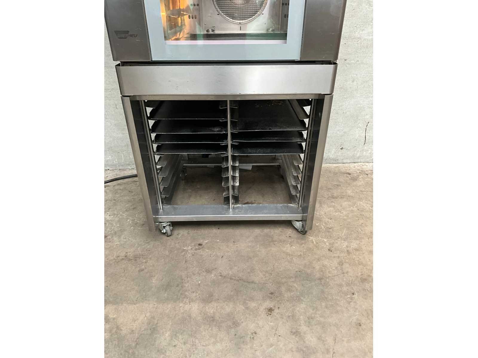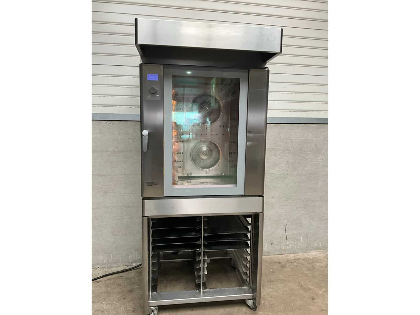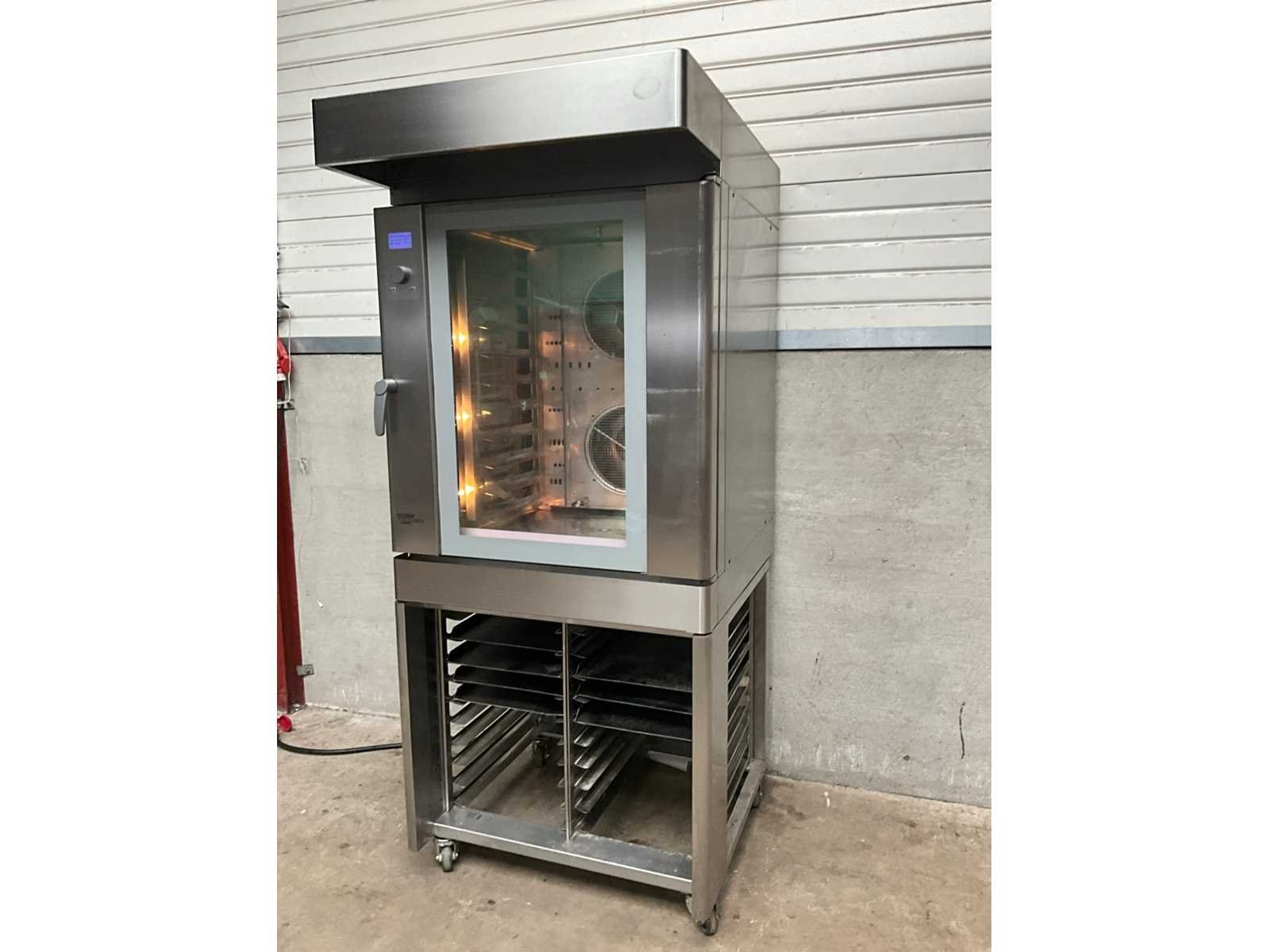 Heteluchtoven met 10 regalen op verrijdbaar onderstel met 20 regalen, voorzien van afzuigkap Merk: Wiesheu Aansluiting: 400V Elektrisch: true Rvs: true Totale afmeting L: 100cm Totale afmeting Breedte: 113cm Totale afmeting Hoogte: 224cm