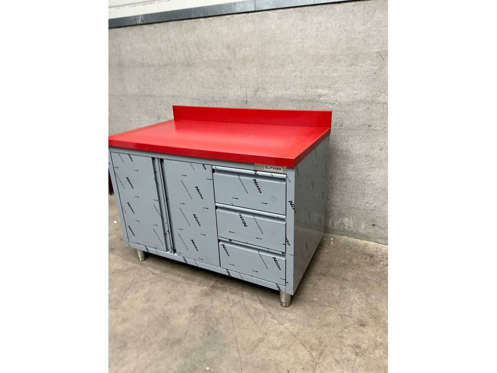 Rvs snijtafel met kunststof snijplank, 3 lades, 2 klapdeuren en 1 hoogte verstelbaar schap Merk: Elfinox Totale afmeting L: 1200mm Totale afmeting Breedte: 700mm Totale afmeting Hoogte: 880mm