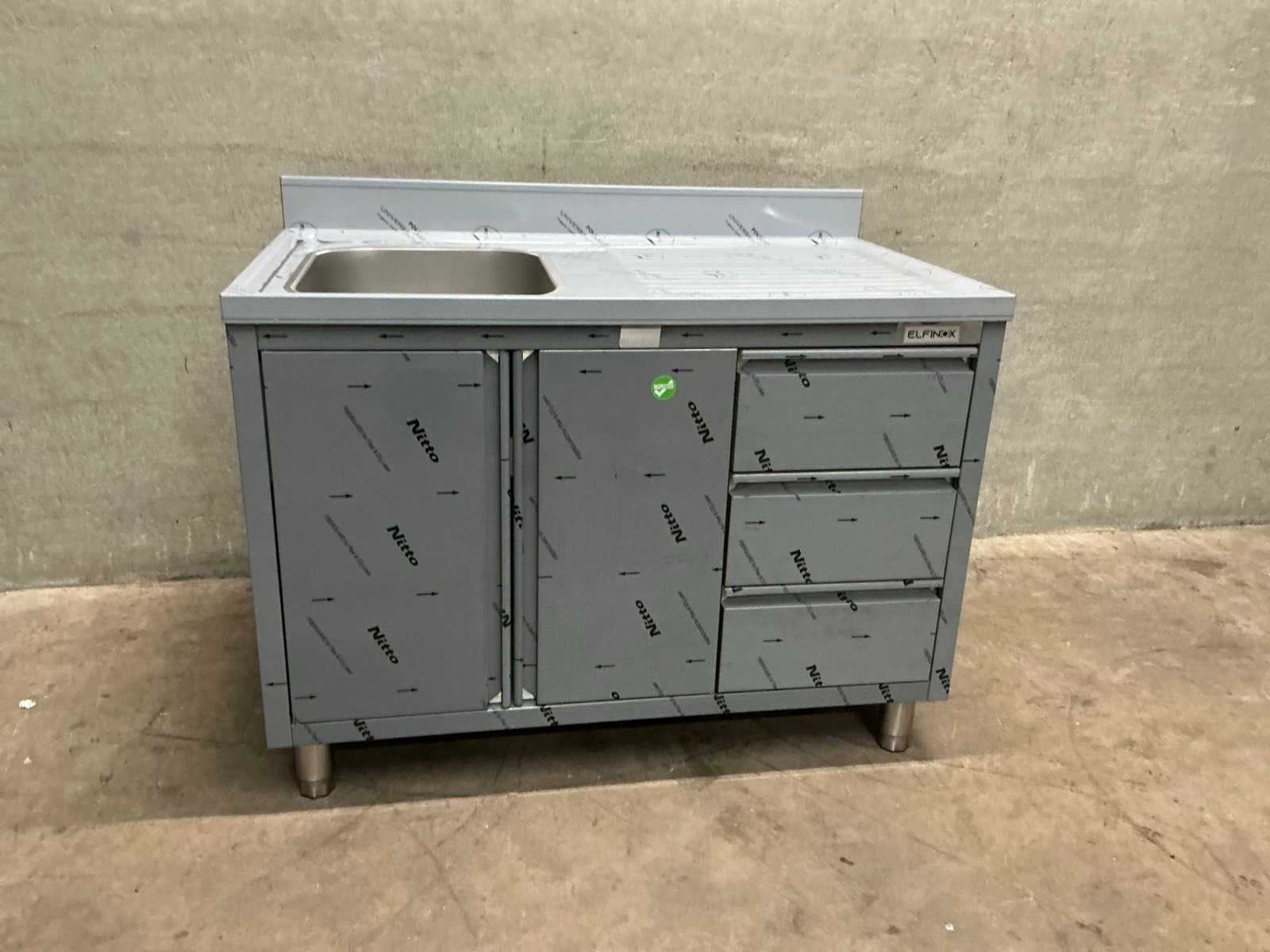 Rvs spoeltafel voorzien opstaande rand, drie lades, 2 klapdeuren en een spoelbak van lxbxd 50x40x23 cm. Merk: Elfinox Rvs: true Lengte: 120cm Breedte: 70cm Hoogte: 88cm