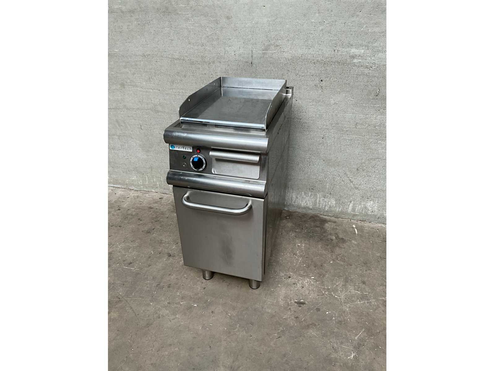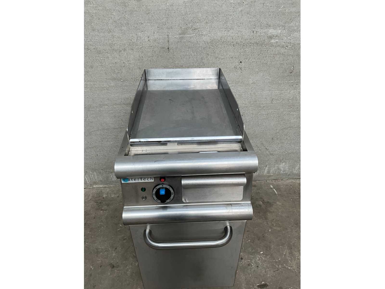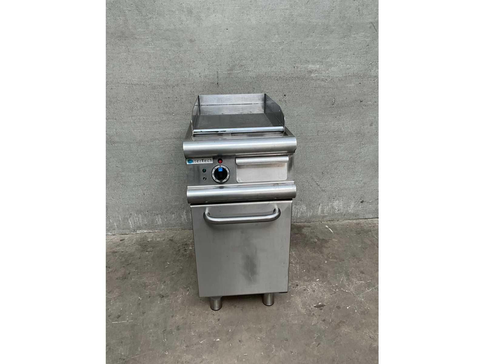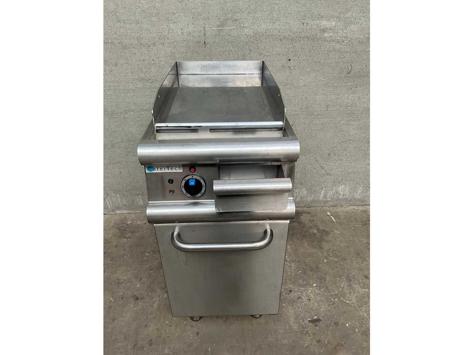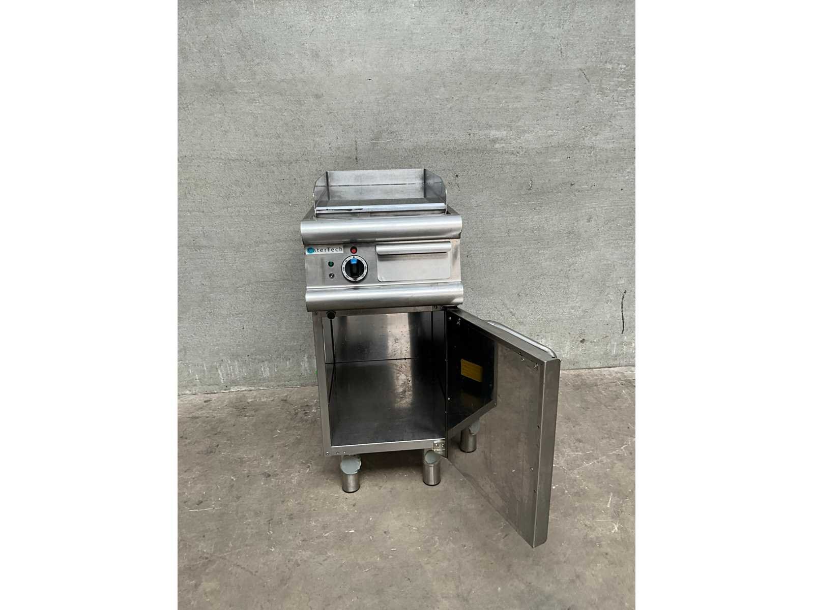 Spiegelbakplaat met opbergruimte en vet verwijderbak Merk: Baron Lengte: 40cm Breedte: 77cm Hoogte: 96cm Aansluiting: 400