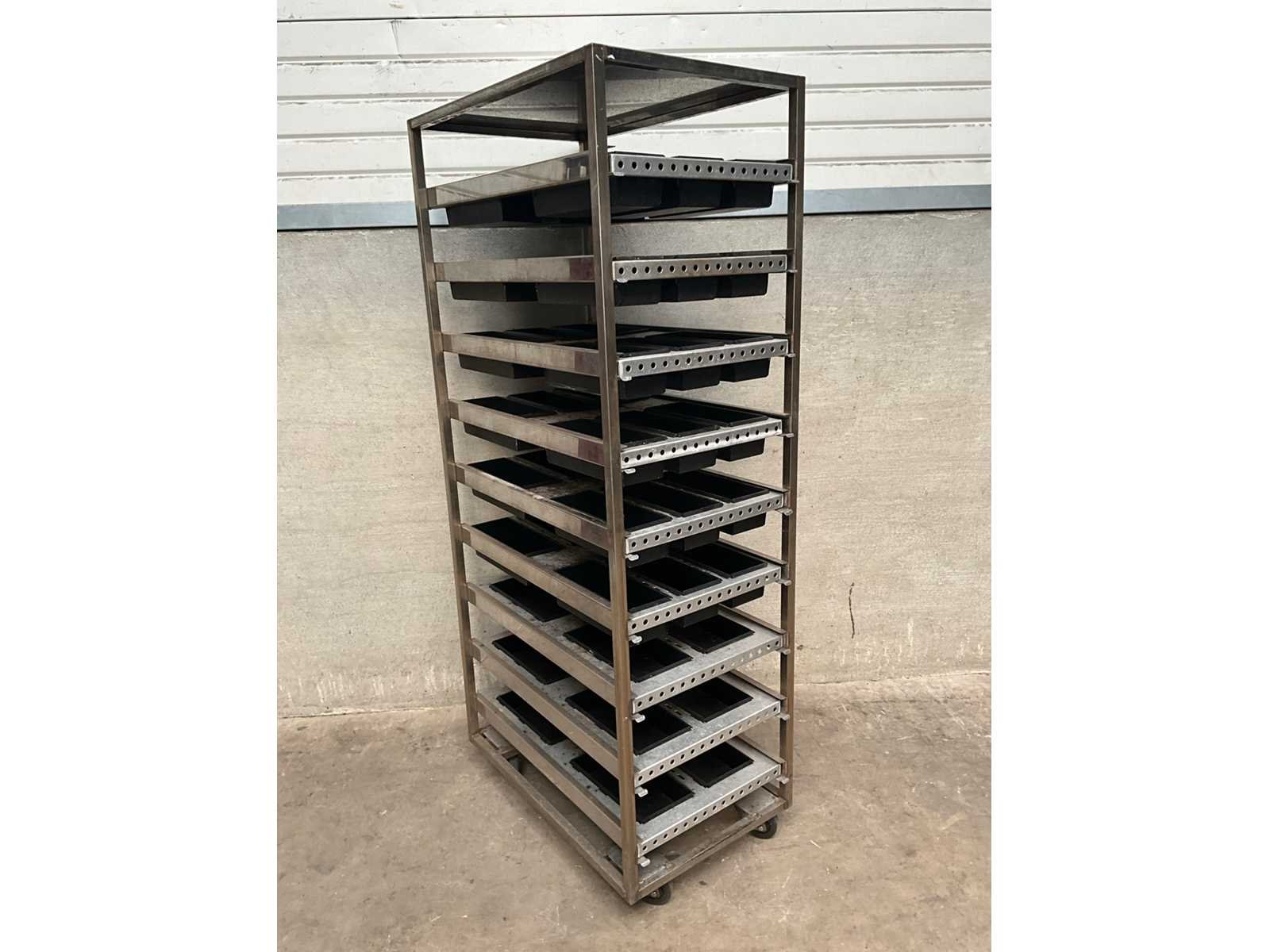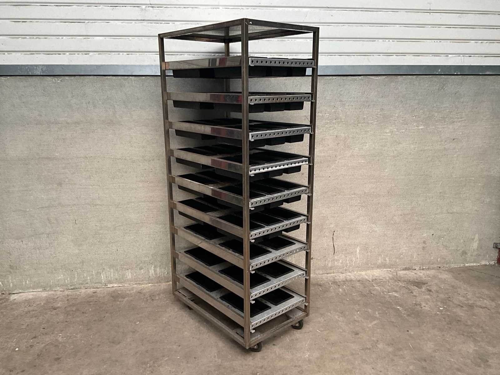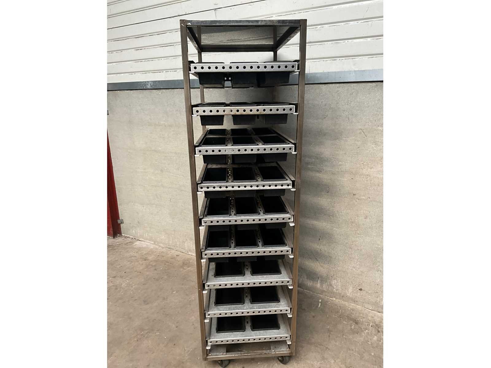 1 x verrijdbare rvs kar, geschikt voor platen van 46x80 cm. met daarin: 3 platen ten behoeve van vloerbrood, formaat van de vorm is 15x306 cm. 6 platen ten behoeve van busbrood, formaat van de vorm is 11x30x9 cm. Merk: KeyBake Totale afmeting L: 530mm Totale afmeting Breedte: 840mm Totale afmeting Hoogte: 1820mm