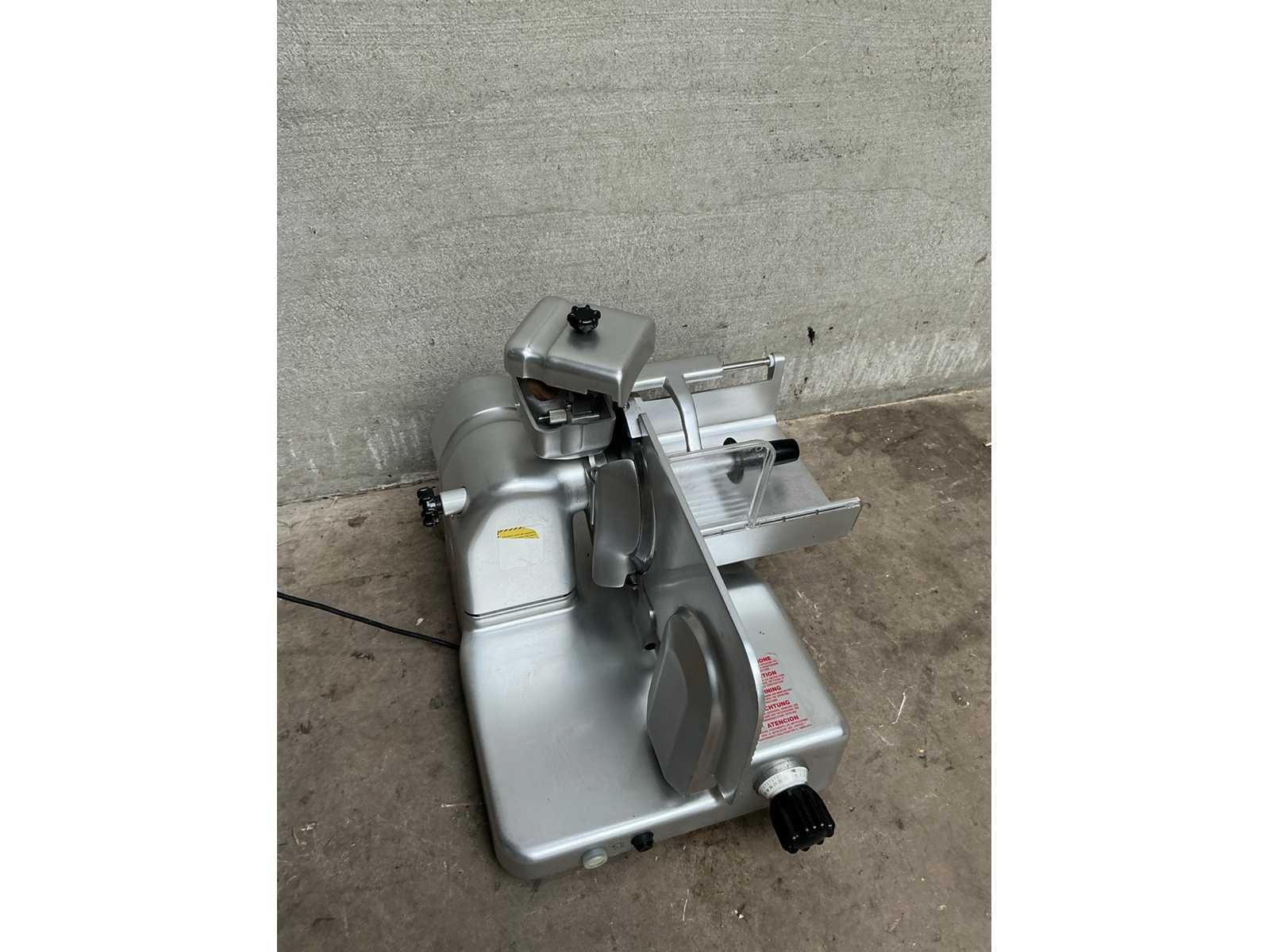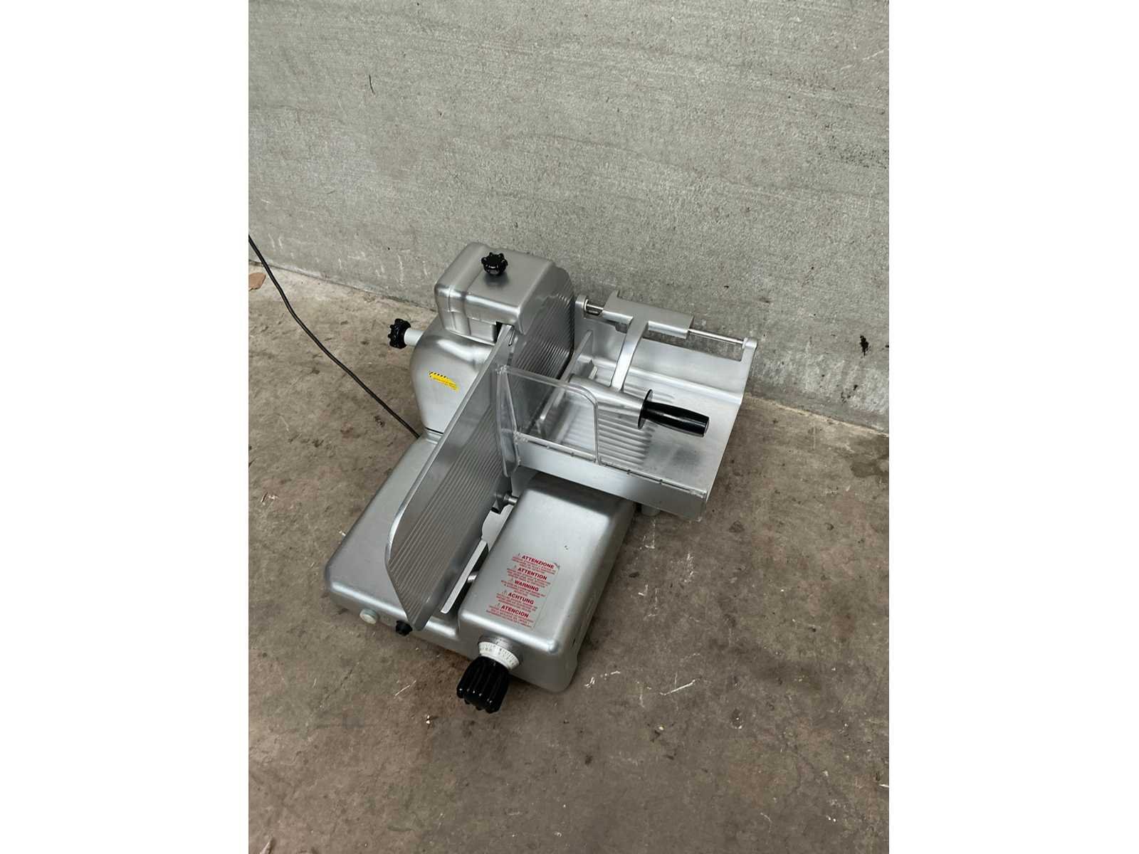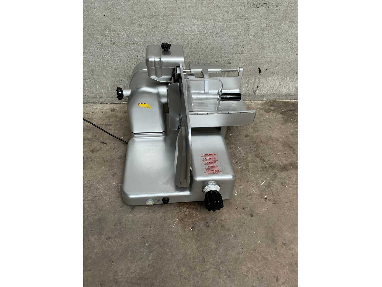 Snijmachine voorzien van messenslijper Merk: Kolossal Messlijper: true Aansluiting: 230V Totale afmeting L: 610mm Totale afmeting Breedte: 640mm Totale afmeting Hoogte: 520mm