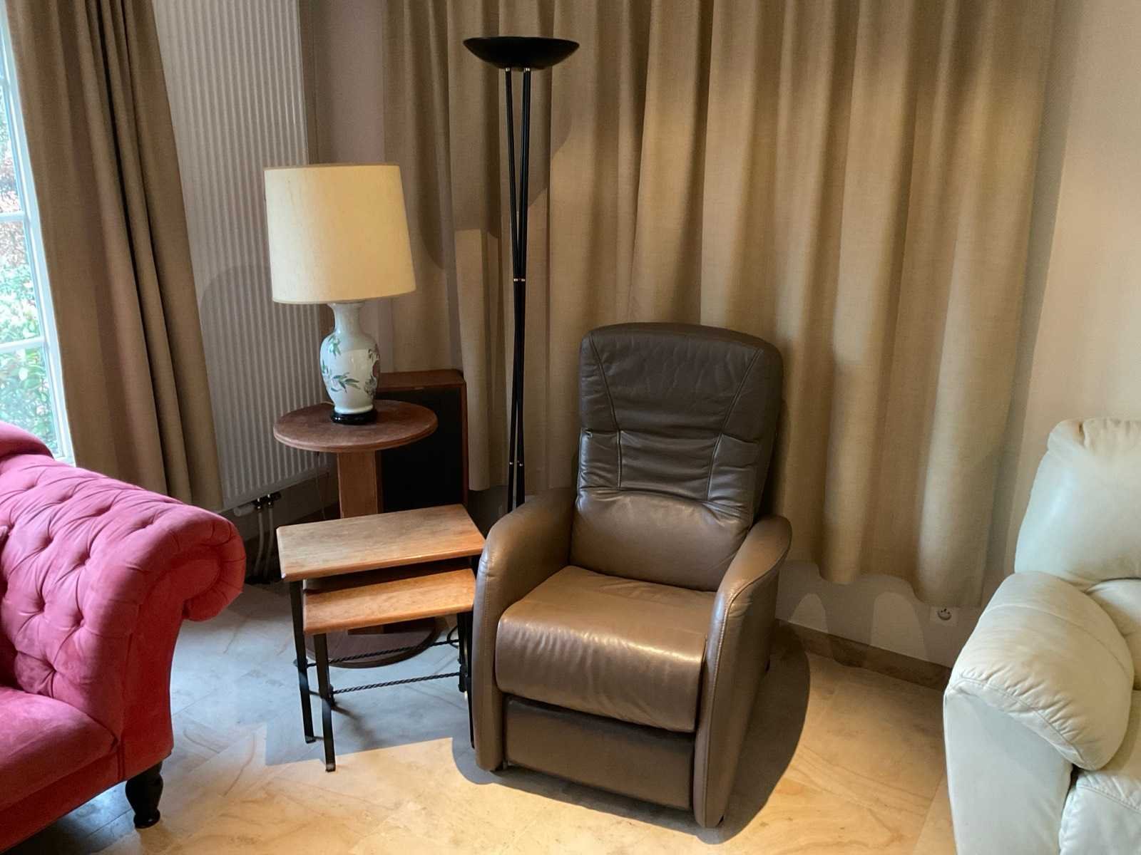 Elektrische fauteuil met koffietafels en lampen