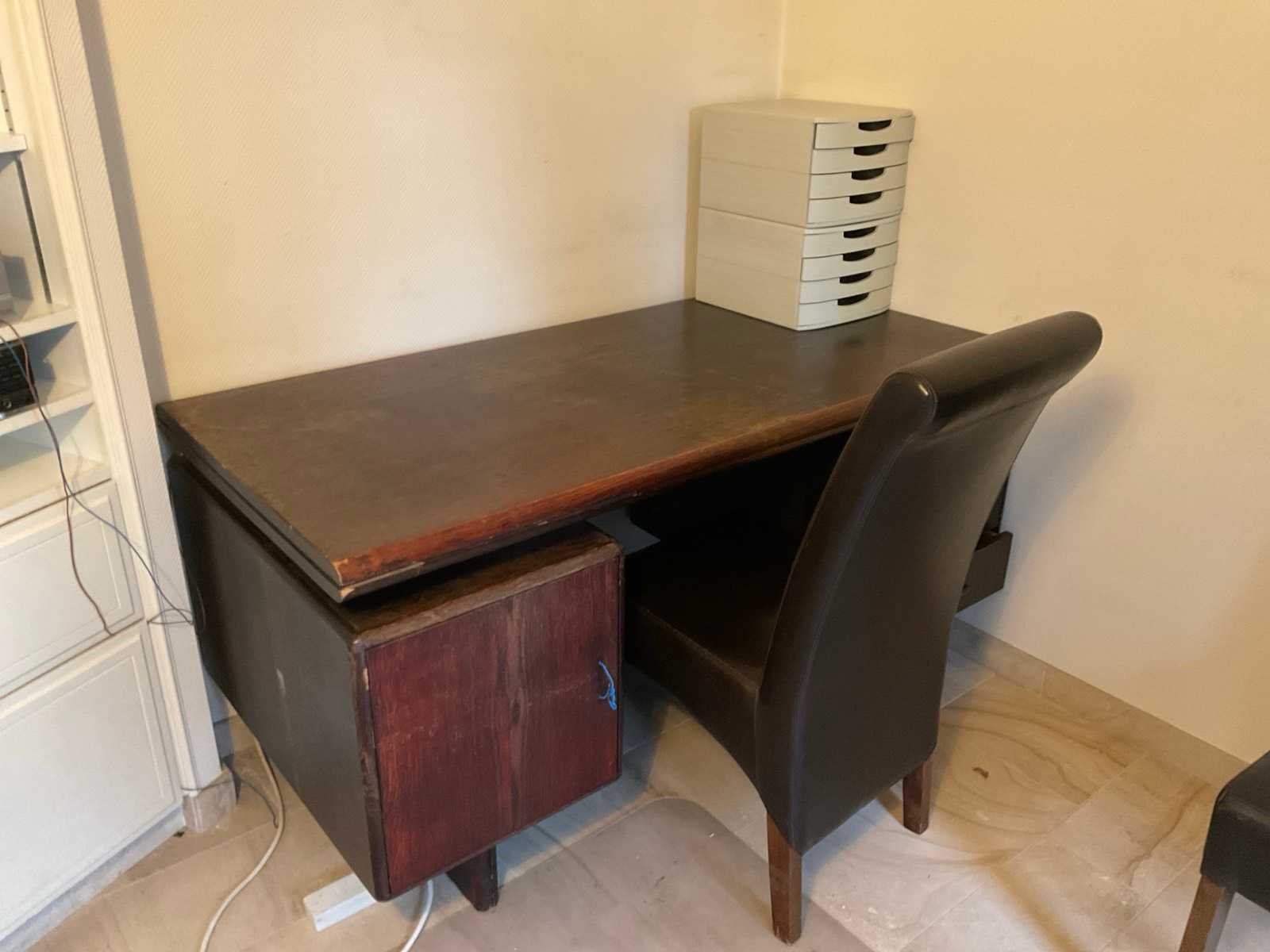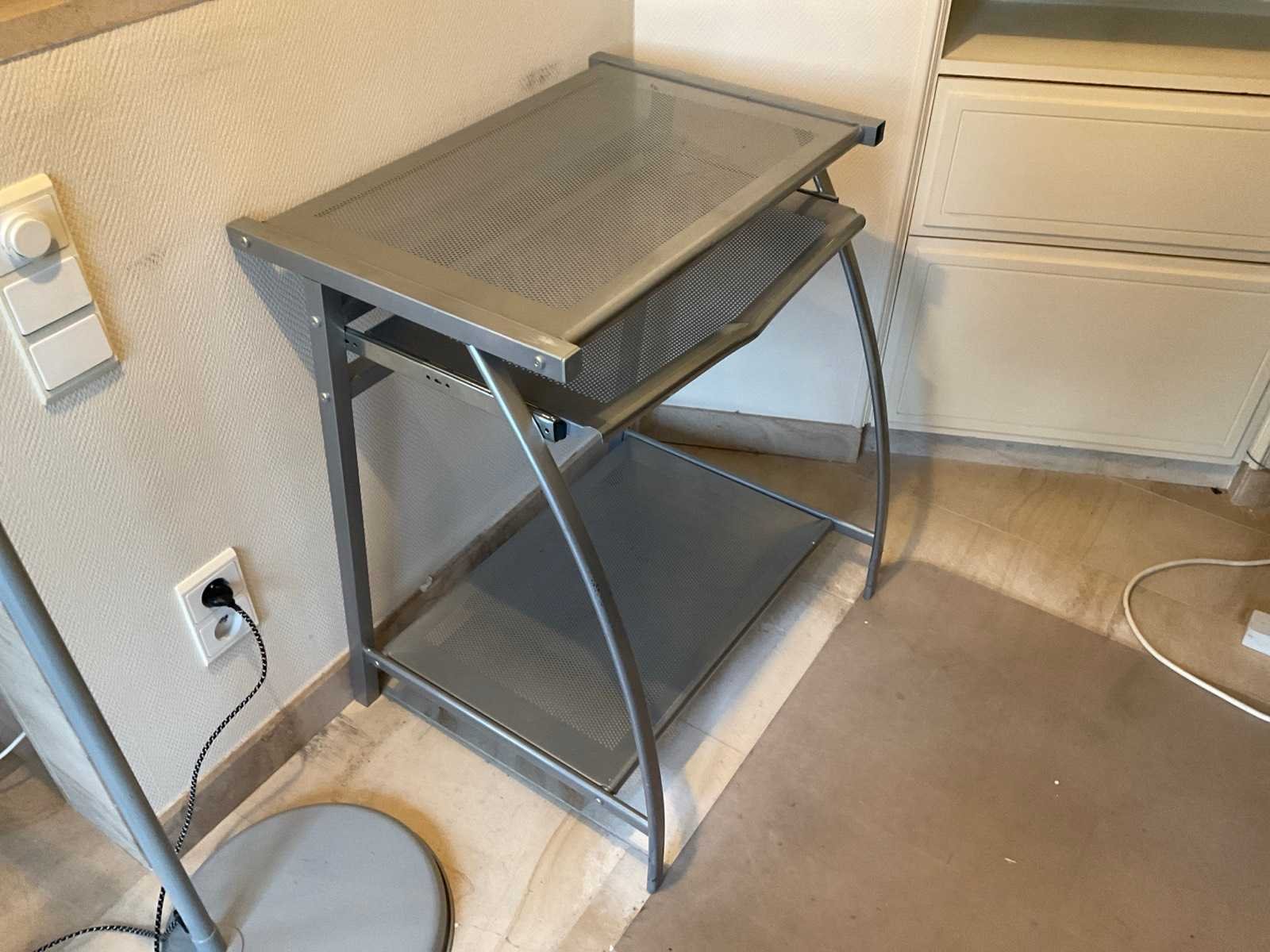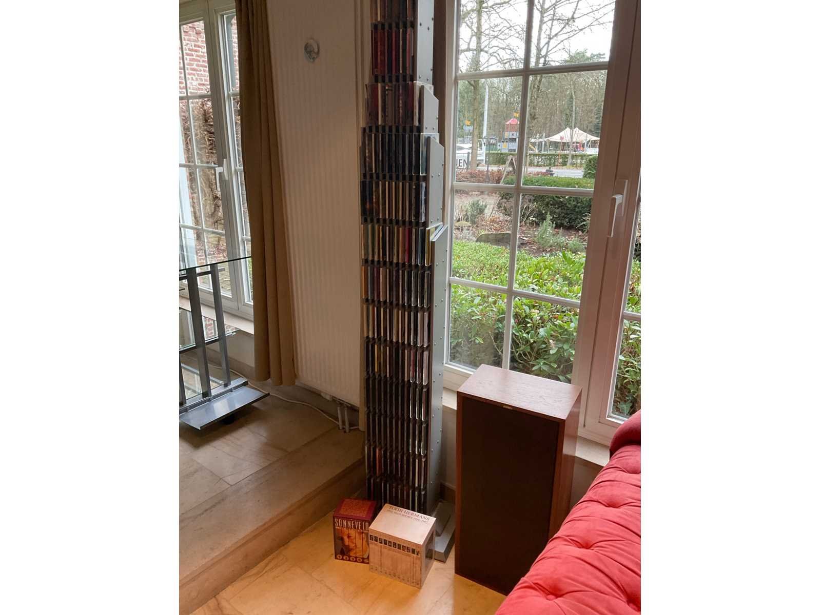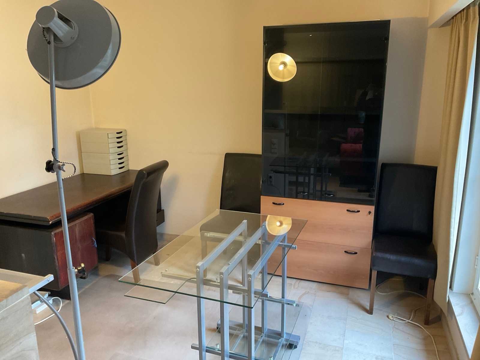 Bestaande uit mobiele computer tafel, bureautafel, dossierkast, versterker, cd-speler, staande lamp, 3 stoelen, cd’s, dvd’s, video, 2 luidsprekers