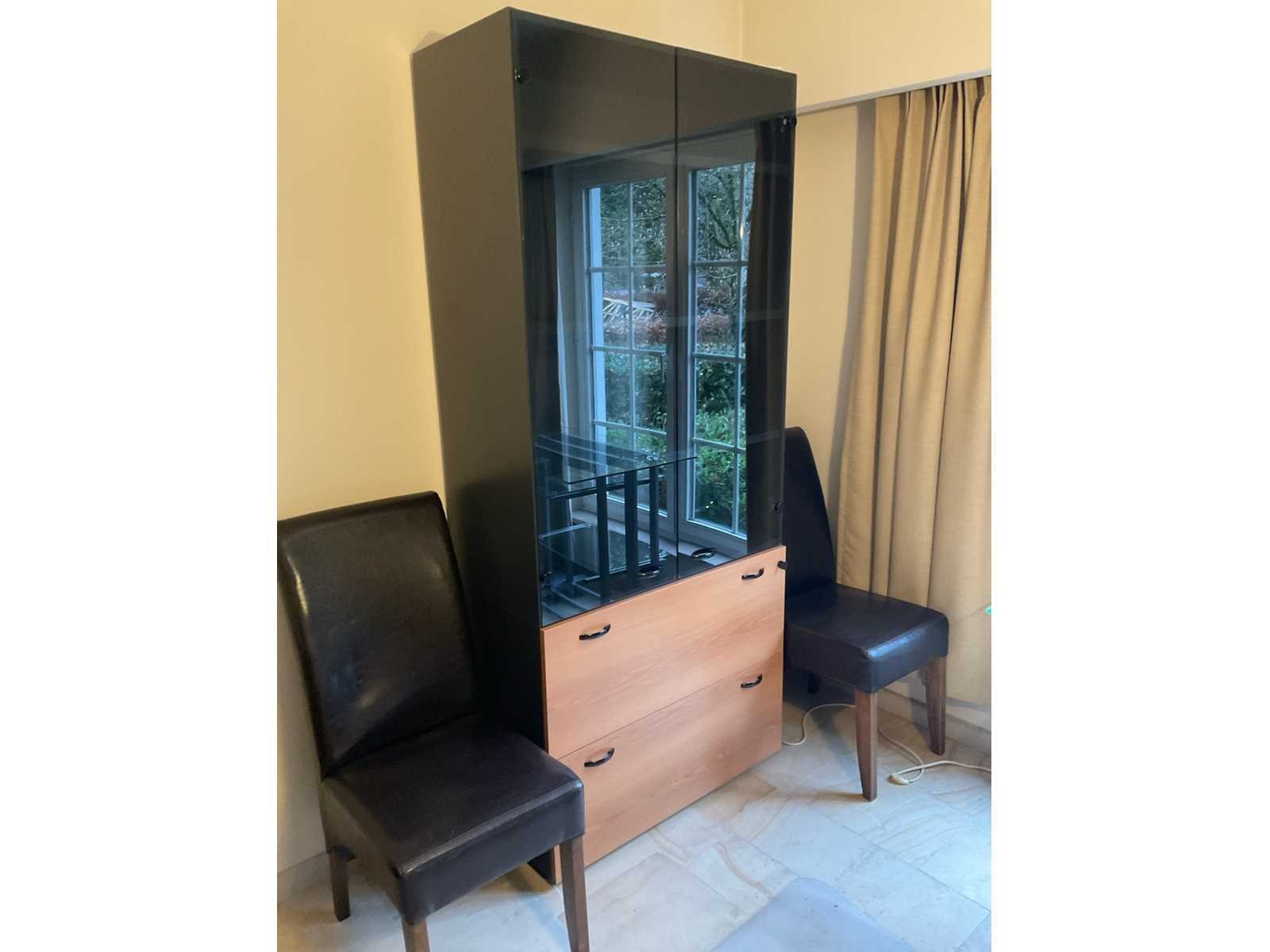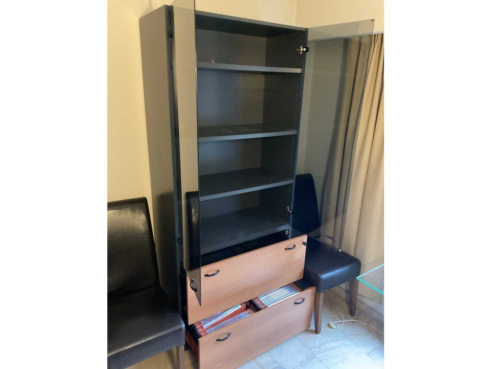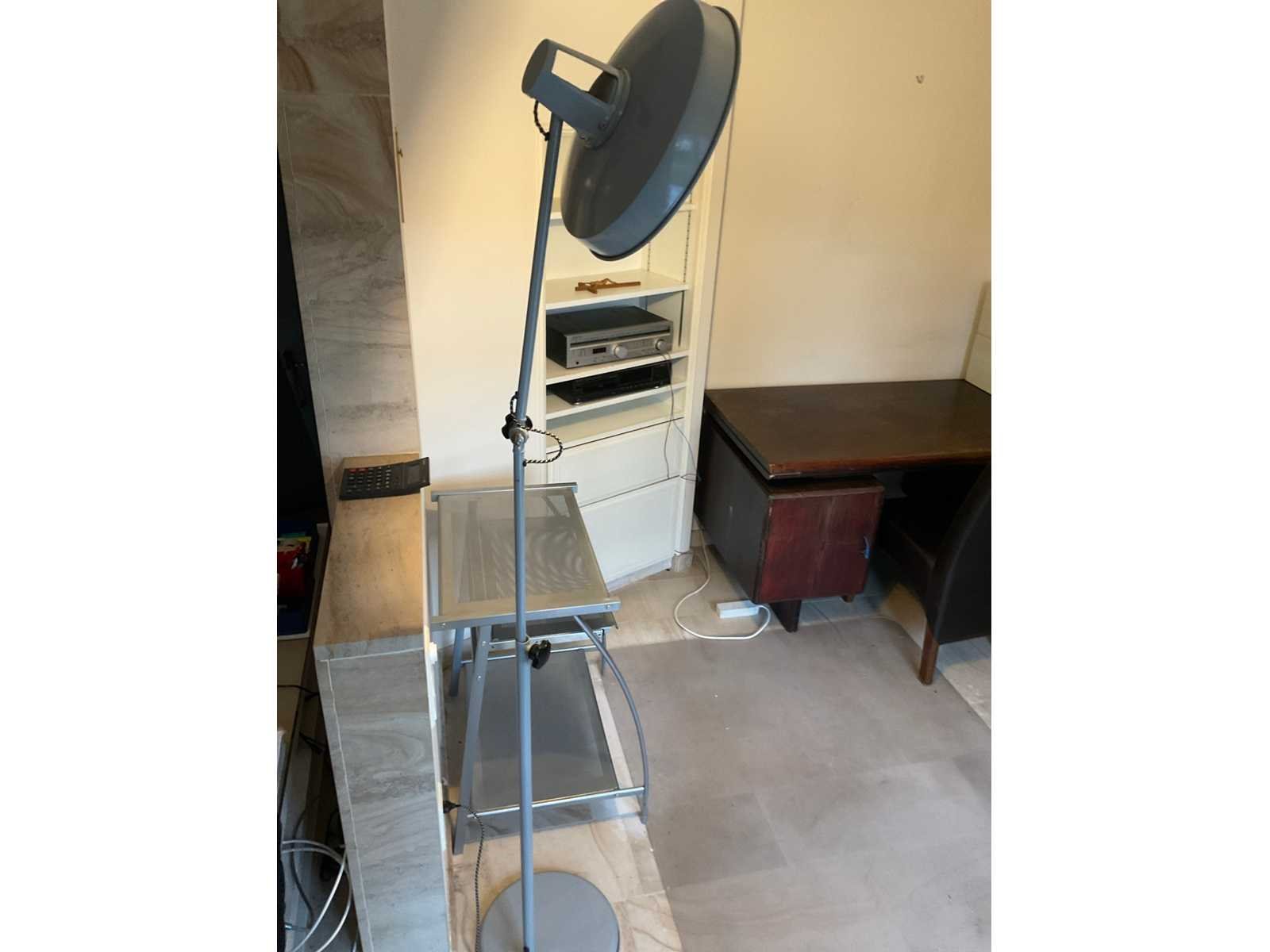 Bestaande uit mobiele computer tafel, bureautafel, dossierkast, versterker, cd-speler, staande lamp, 3 stoelen, cd’s, dvd’s, video, 2 luidsprekers