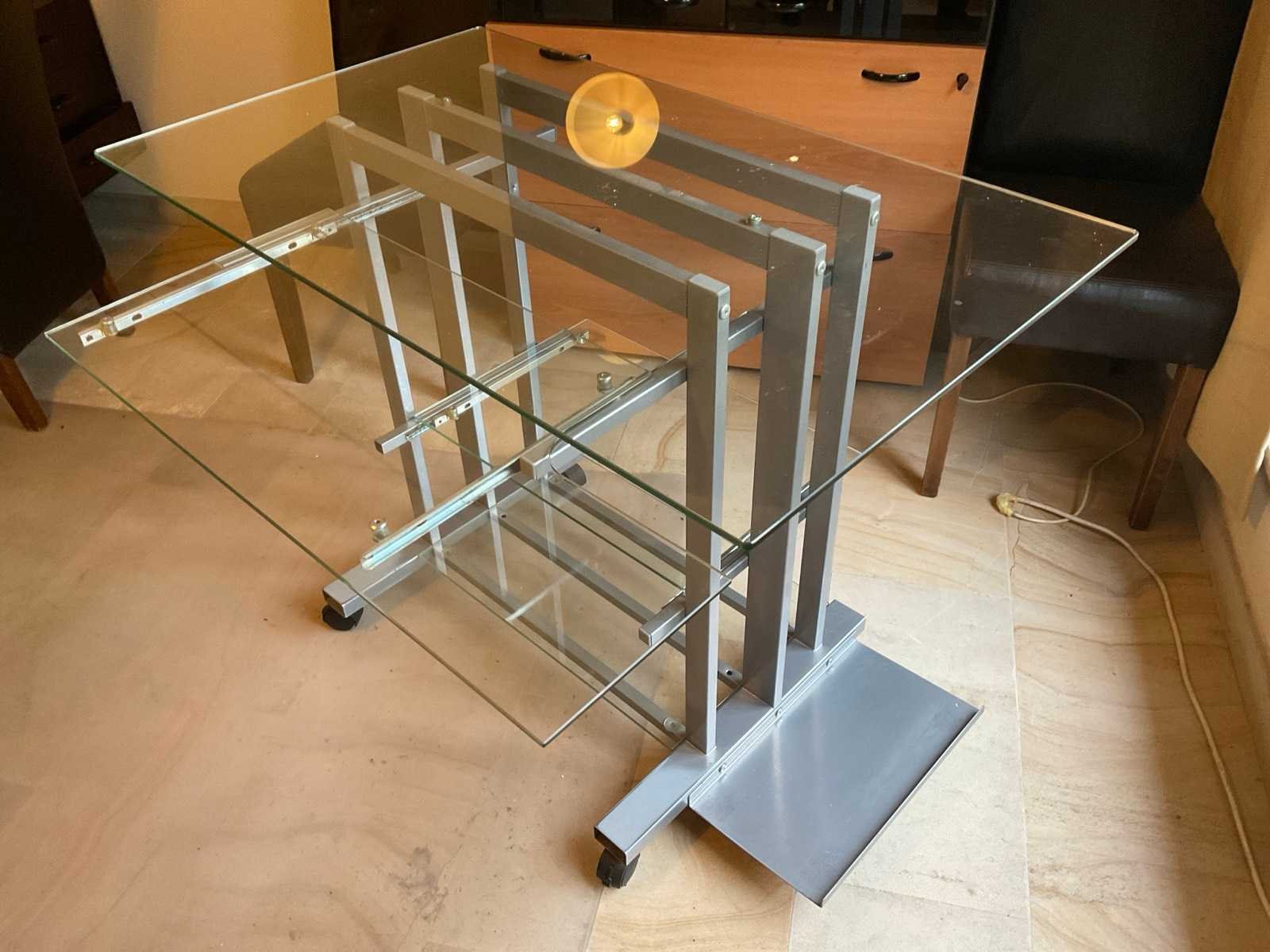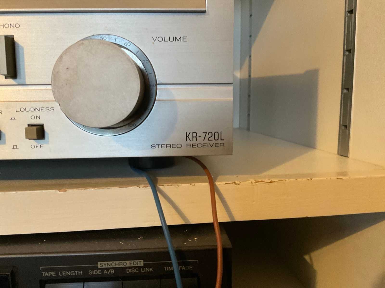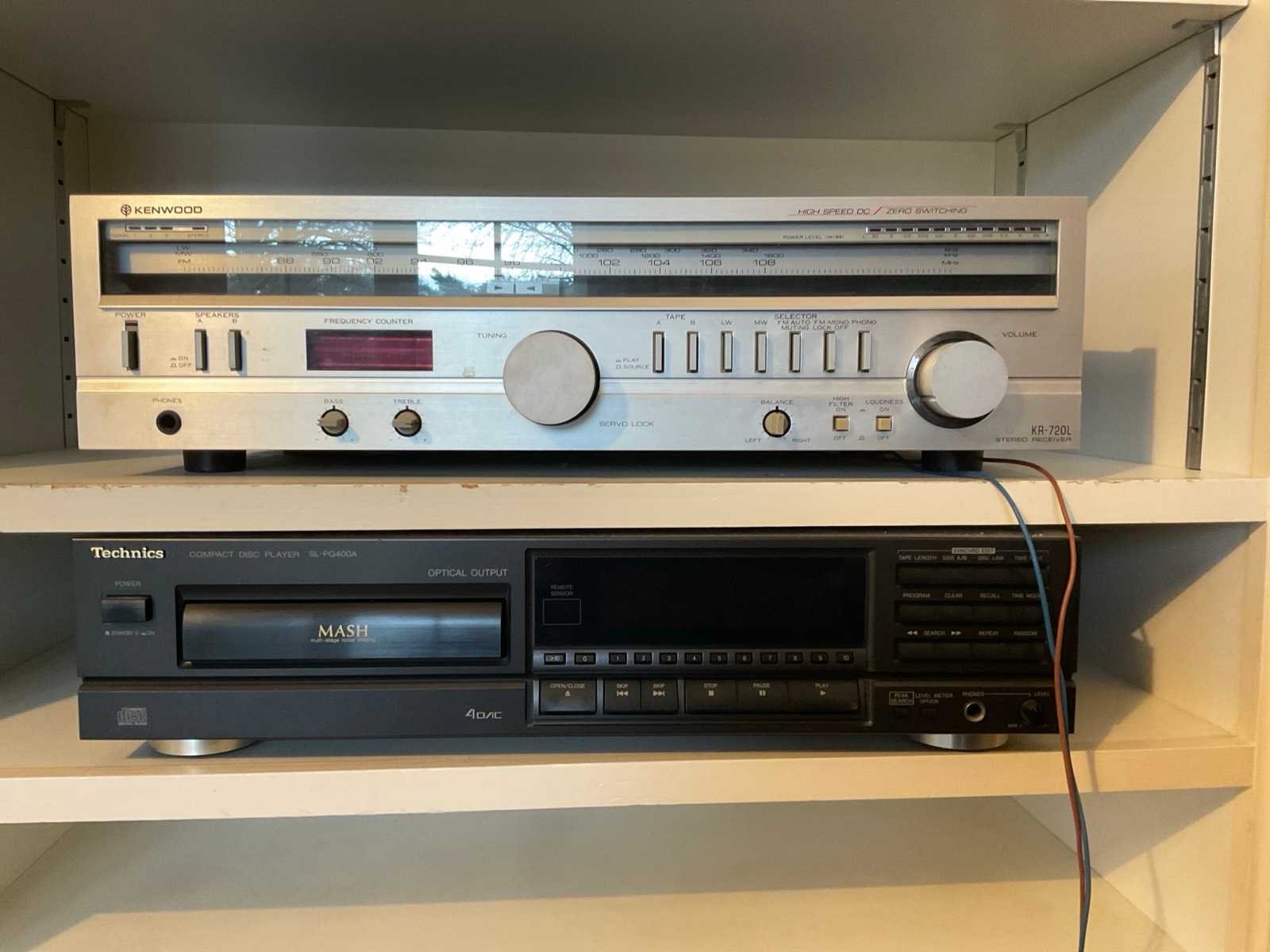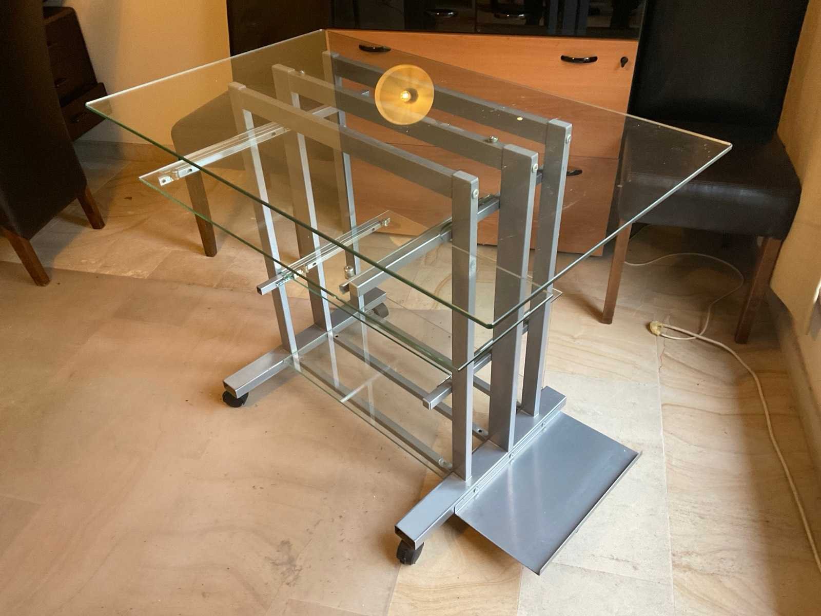 Bestaande uit mobiele computer tafel, bureautafel, dossierkast, versterker, cd-speler, staande lamp, 3 stoelen, cd’s, dvd’s, video, 2 luidsprekers