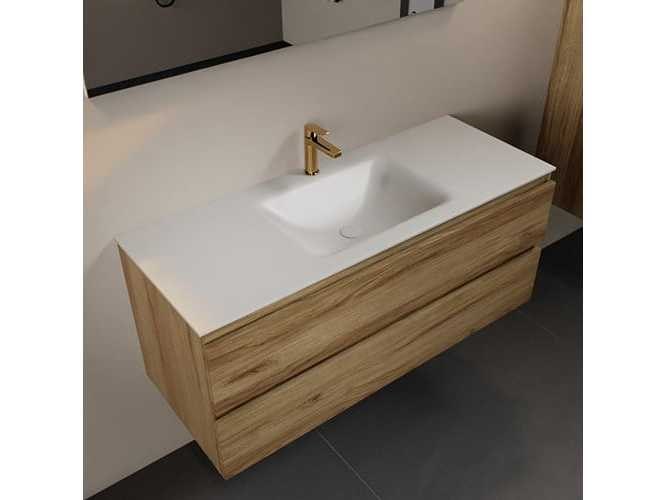 Badkamerkast met massief oppervlak (kunststeen) wastafel, 120 cm, met kraangat, 2 lades, bovenste laag kast van eikenhout, positie wastafel: midden (alleen kast en waskom inbegrepen) Kleur: Honey Lengte: 120cm Breedte: 45cm Hoogte: 50cm Materiaal: Eikenhout