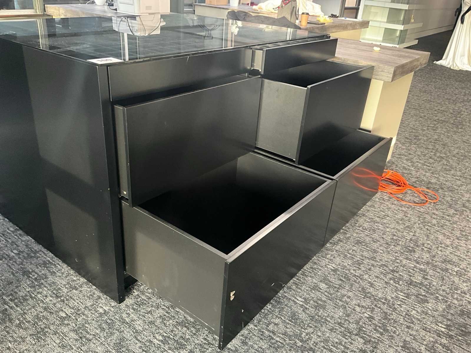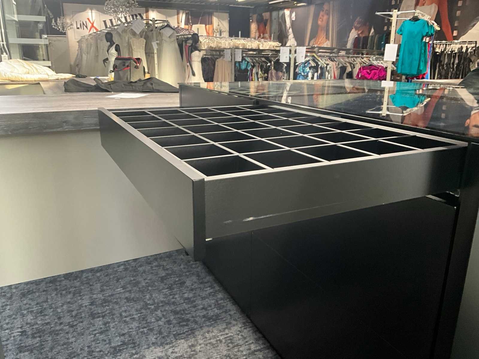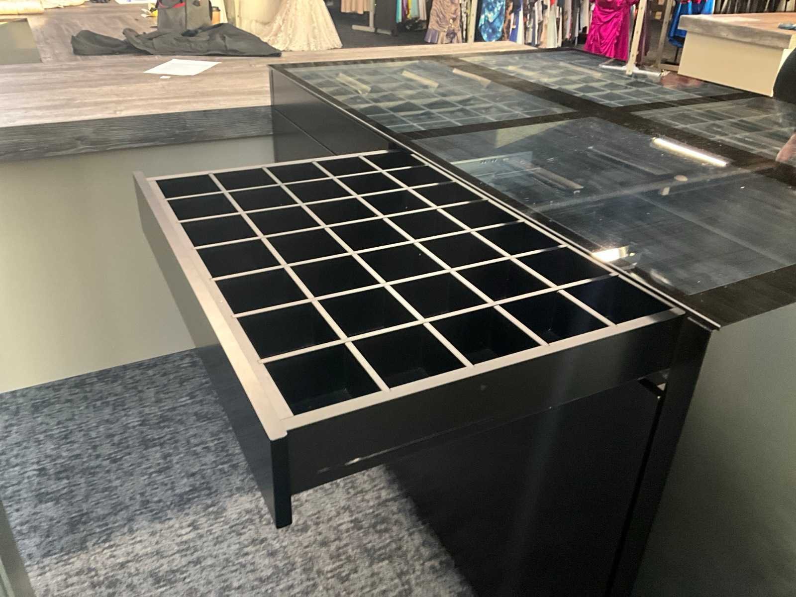 Langs beide zijden voorzien van 6 schuiven, totaal 12 laden waarvan bovenaan 4 laden elk voorzien van 35 verdeelvakken en glazen blad bovenaan. Aantal laden: 12 Totale afmeting L: 1830mm Totale afmeting Breedte: 1300mm Totale afmeting Hoogte: 1100mm
