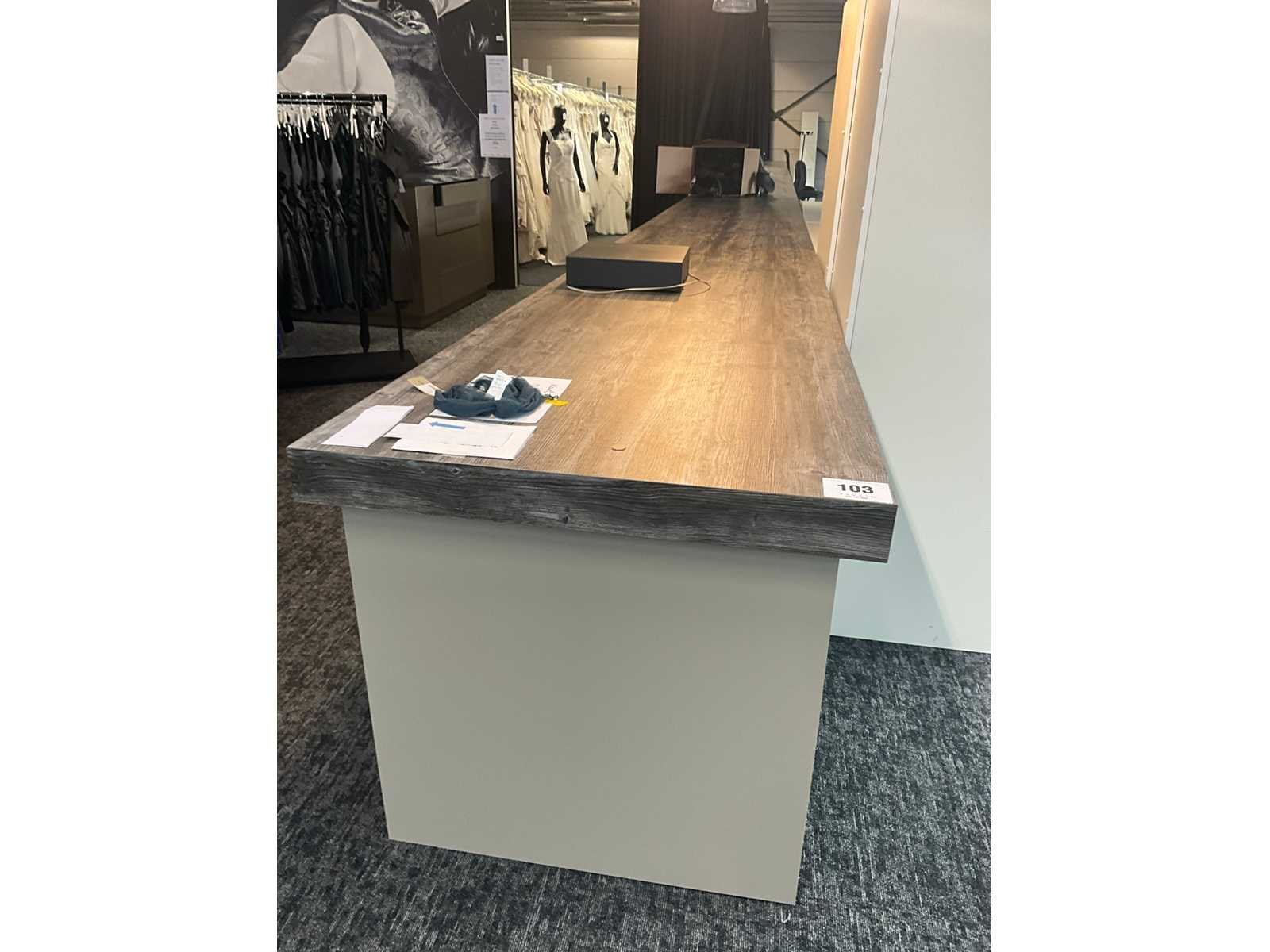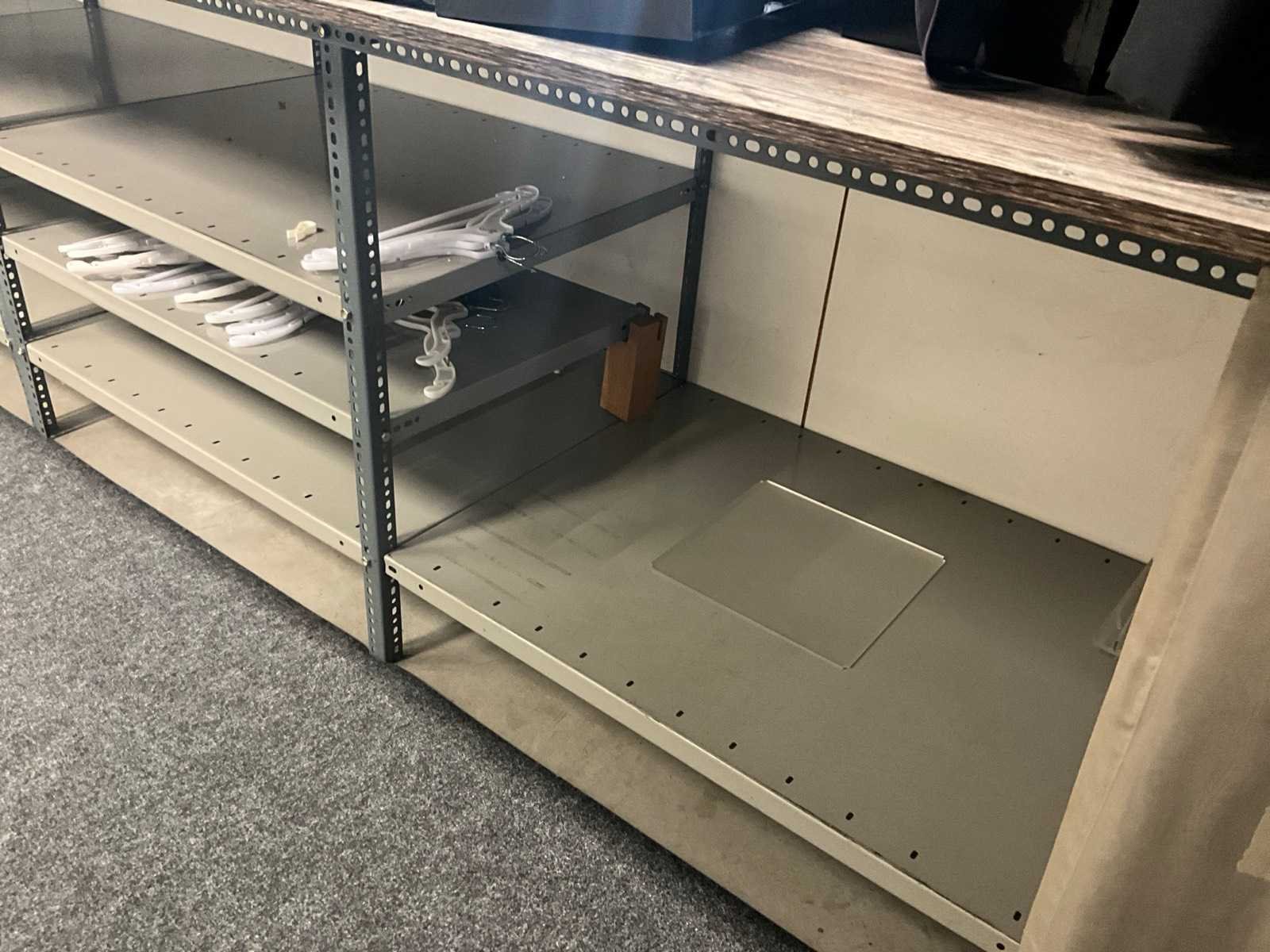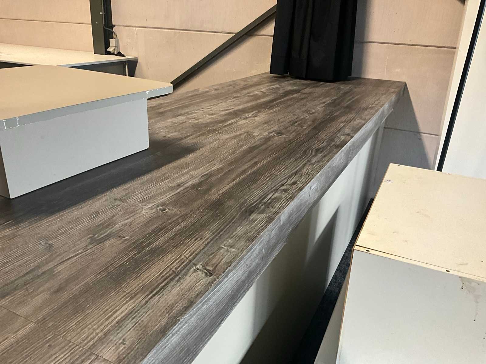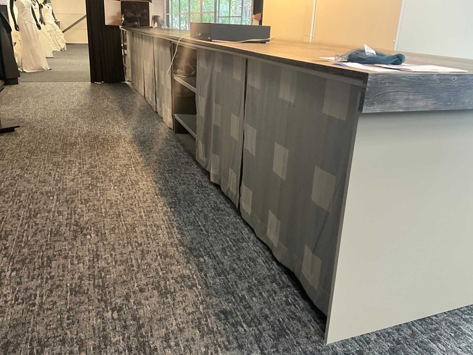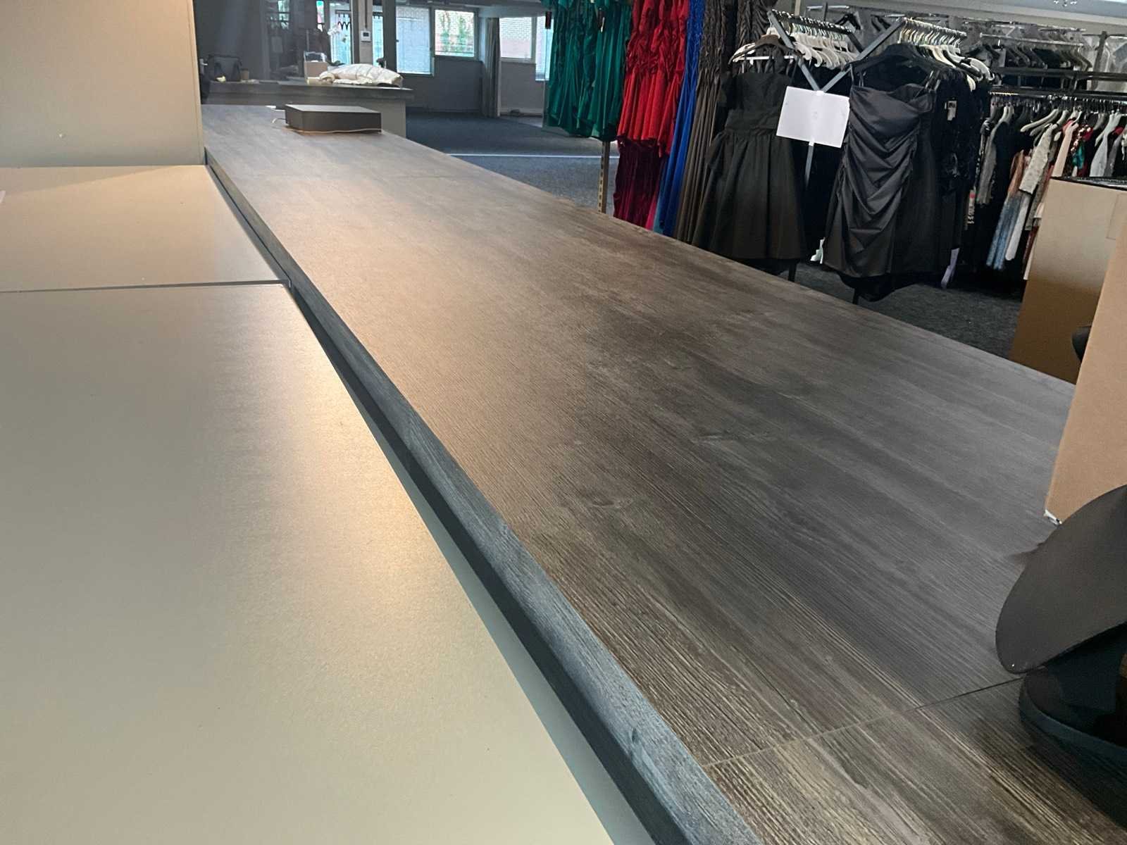 Kan dienst doen als toogmeubel, met bovenaan houten toogblad/bovenblad telkens met stukken van 300 cm lengte en onderaan metalen legbordstelling telkens voorzien van diverse leggers en deels van draperie achteraan en vooraan in fineerhouten uitvoering. Deels voorzien van stopcontacten met kabelgoot. Totale afmeting L: 1880cm Totale afmeting Breedte: 100cm Totale afmeting Hoogte: 95cm