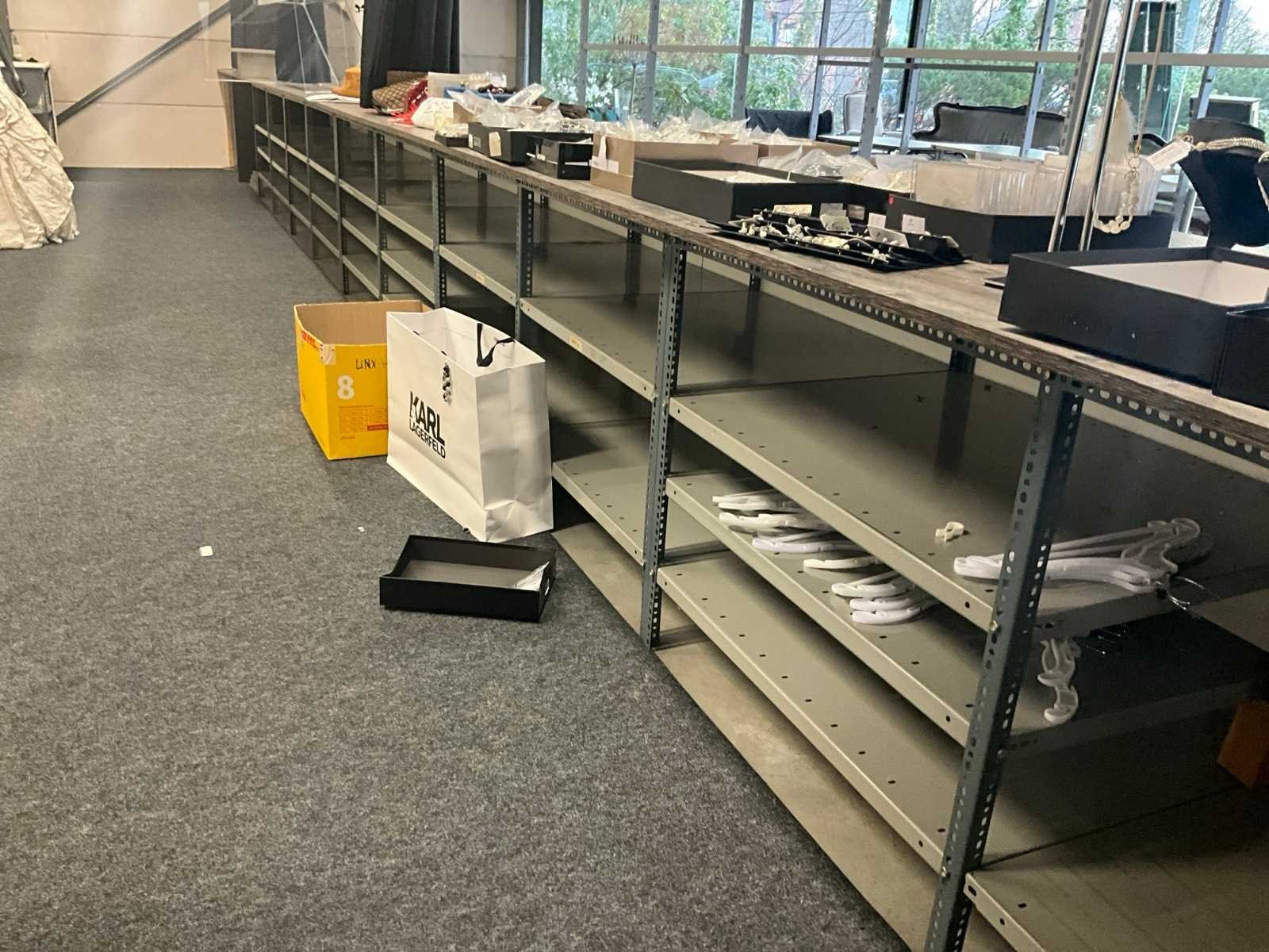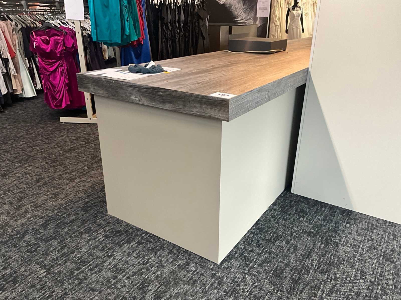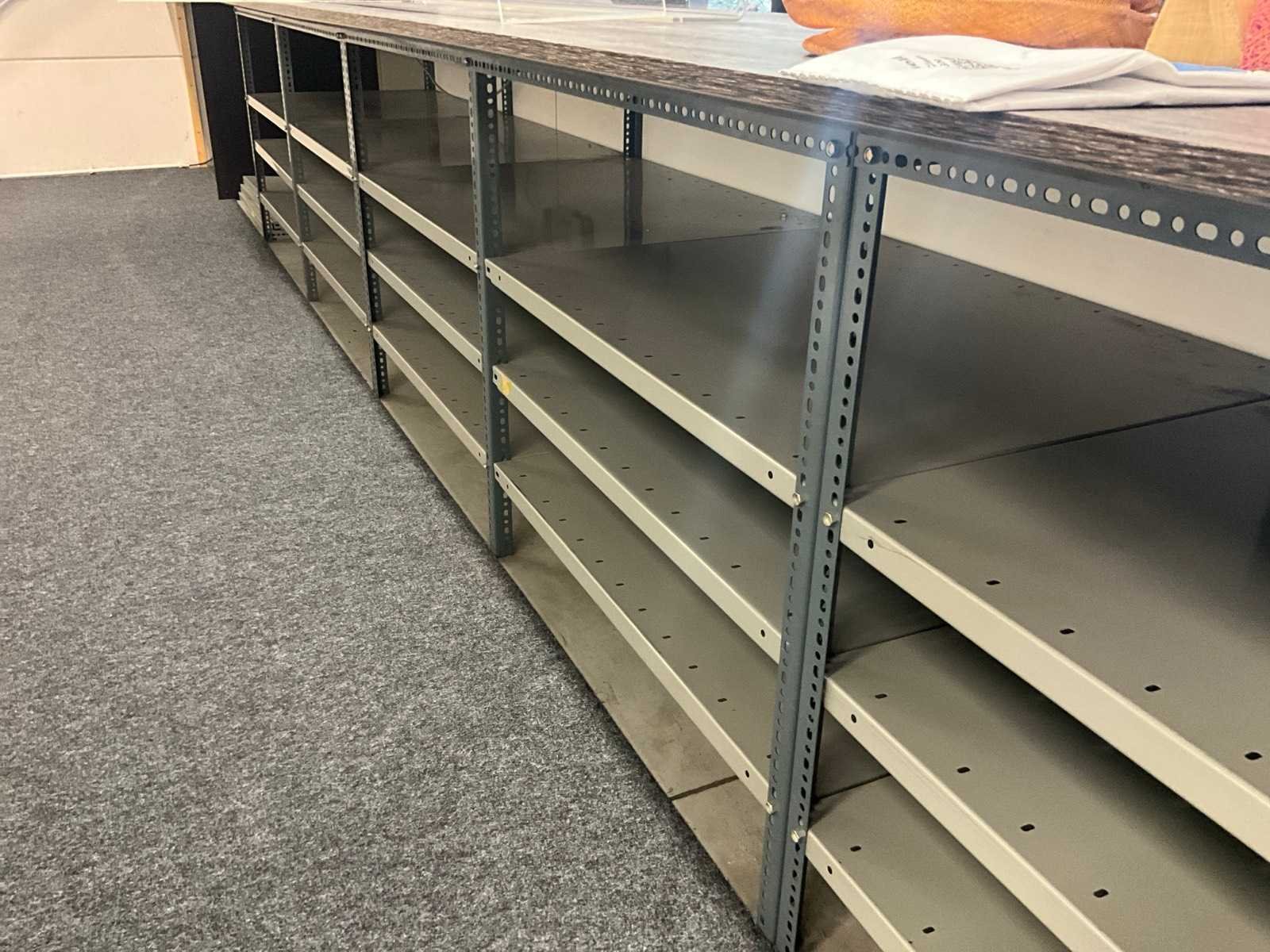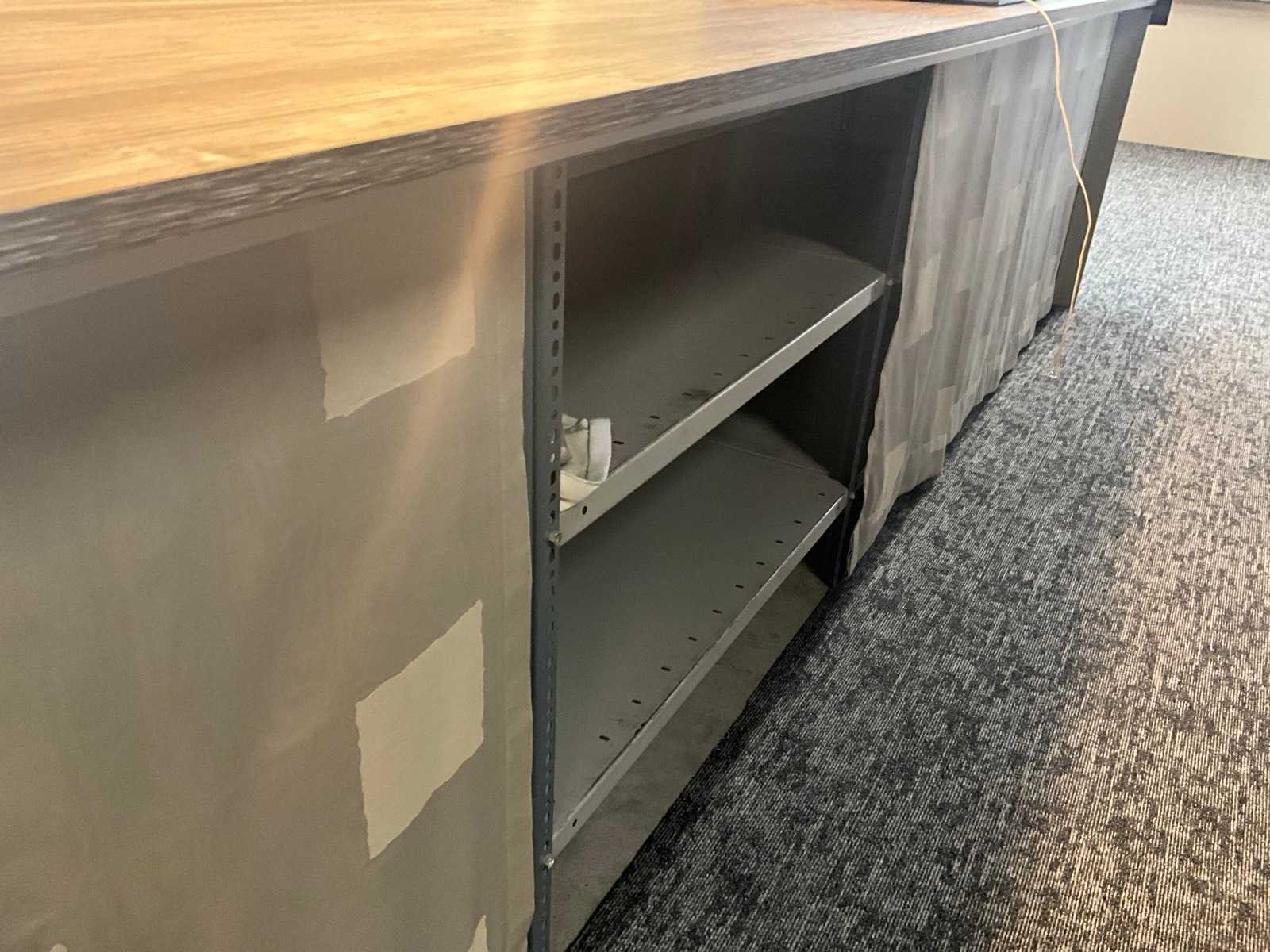 Kan dienst doen als toogmeubel, met bovenaan houten toogblad/bovenblad telkens met stukken van 300 cm lengte en onderaan metalen legbordstelling telkens voorzien van diverse leggers en deels van draperie achteraan en vooraan in fineerhouten uitvoering. Deels voorzien van stopcontacten met kabelgoot. Totale afmeting L: 1880cm Totale afmeting Breedte: 100cm Totale afmeting Hoogte: 95cm