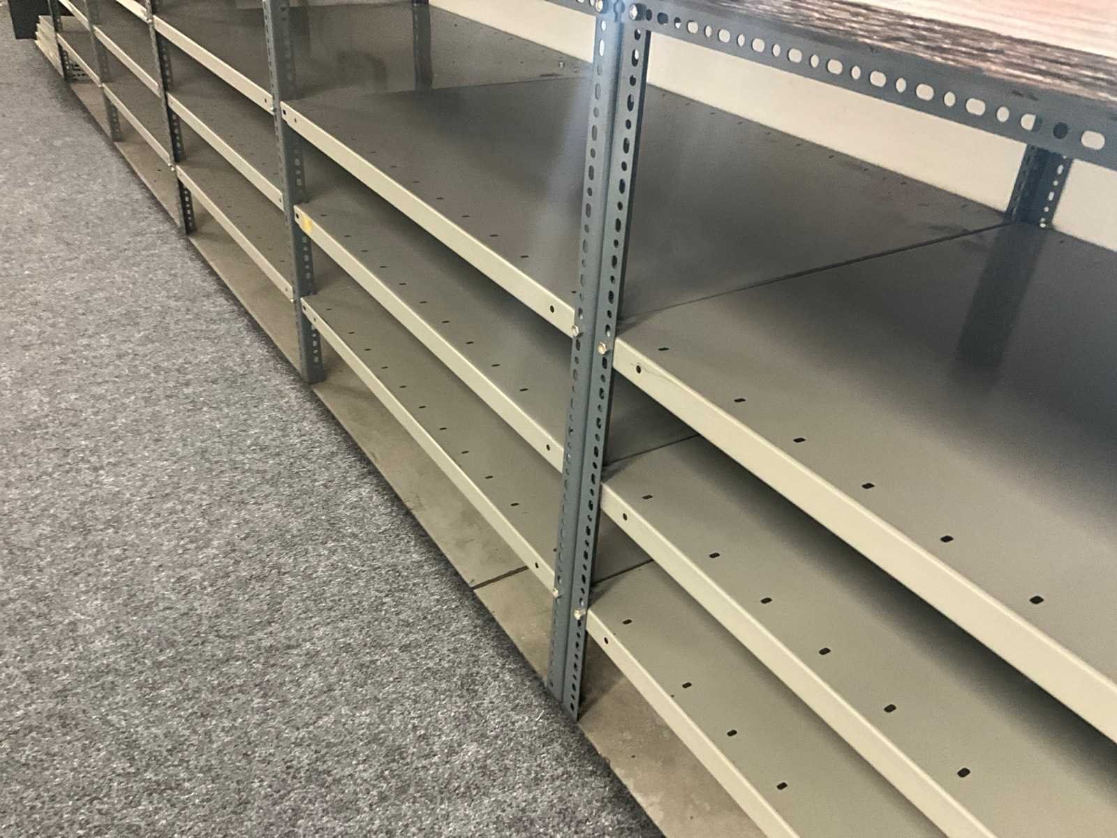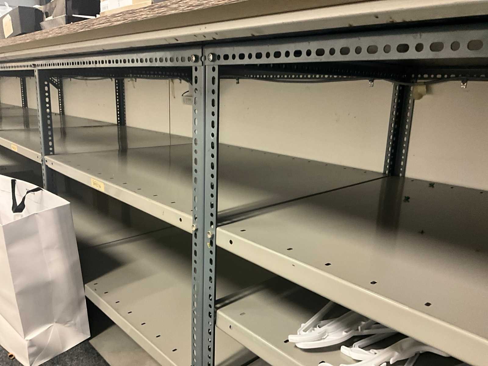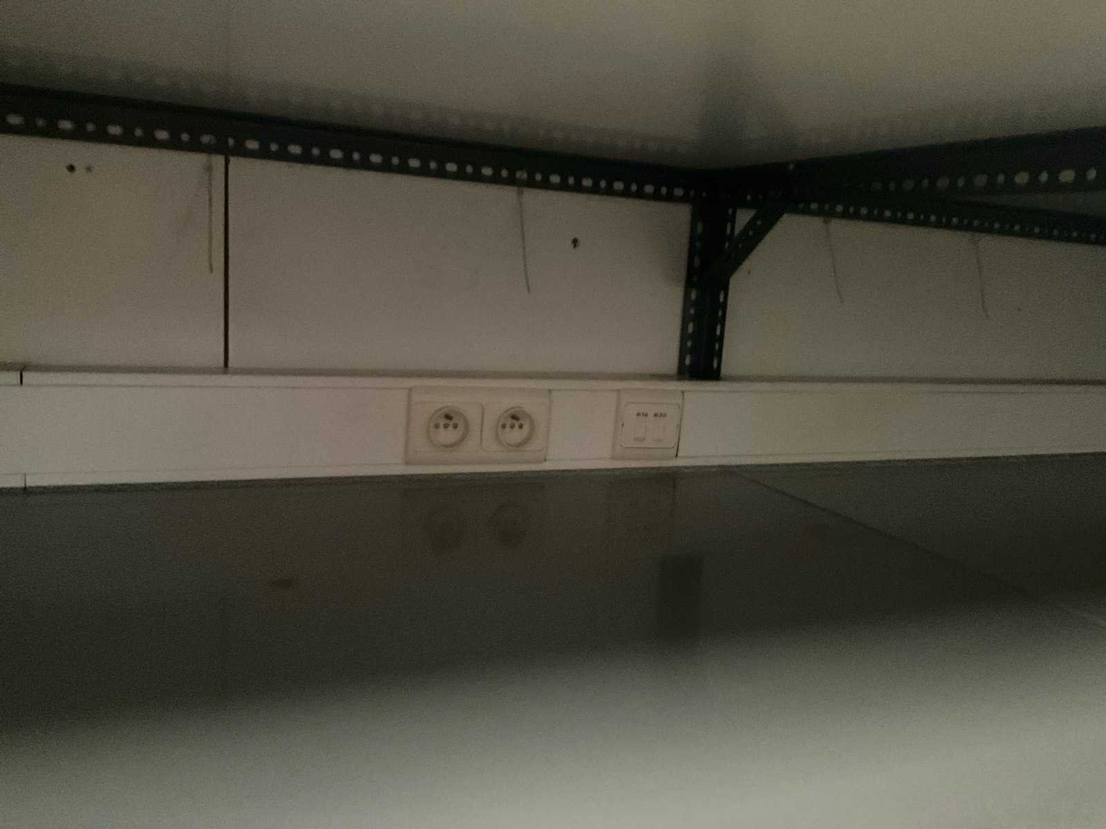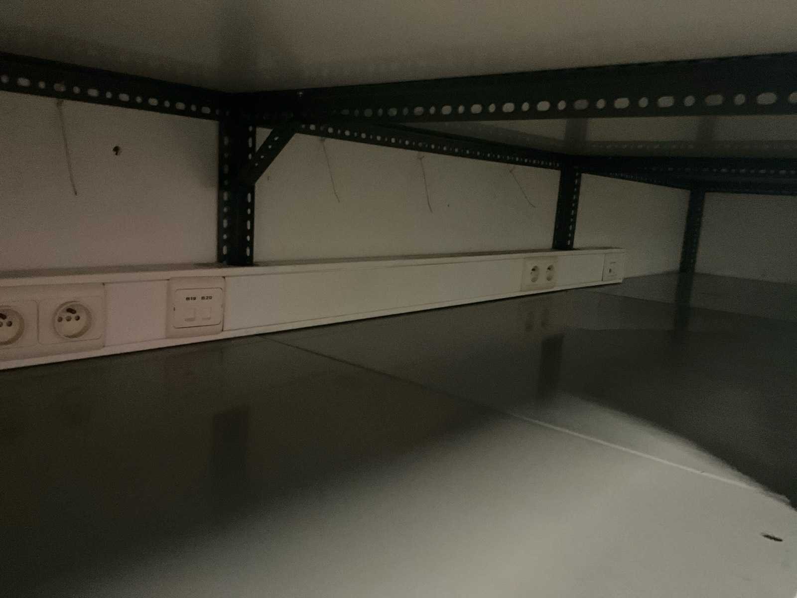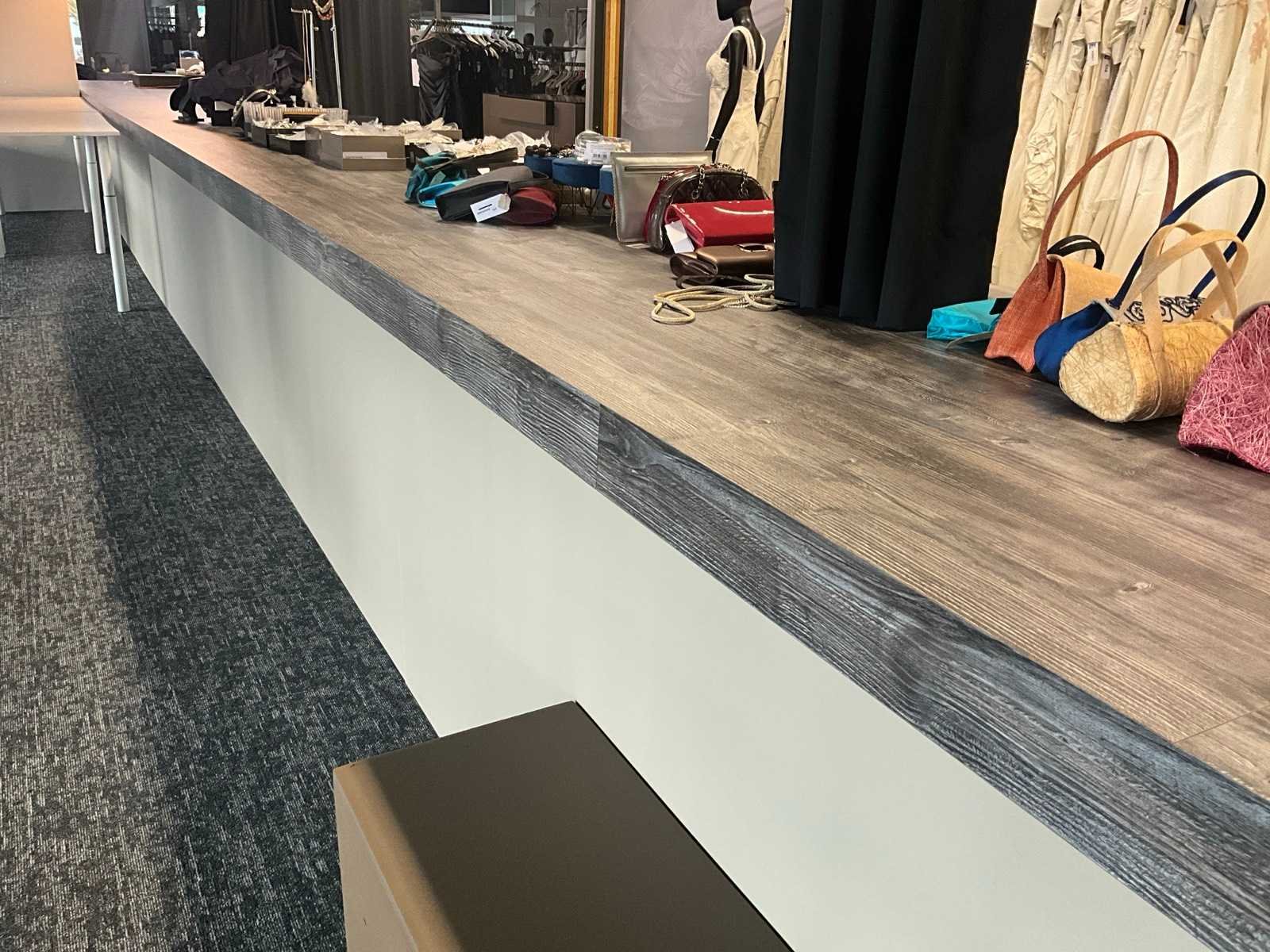 Kan dienst doen als toogmeubel, met bovenaan houten toogblad/bovenblad telkens met stukken van 300 cm lengte en onderaan metalen legbordstelling telkens voorzien van diverse leggers en deels van draperie achteraan en vooraan in fineerhouten uitvoering. Deels voorzien van stopcontacten met kabelgoot. Totale afmeting L: 1880cm Totale afmeting Breedte: 100cm Totale afmeting Hoogte: 95cm