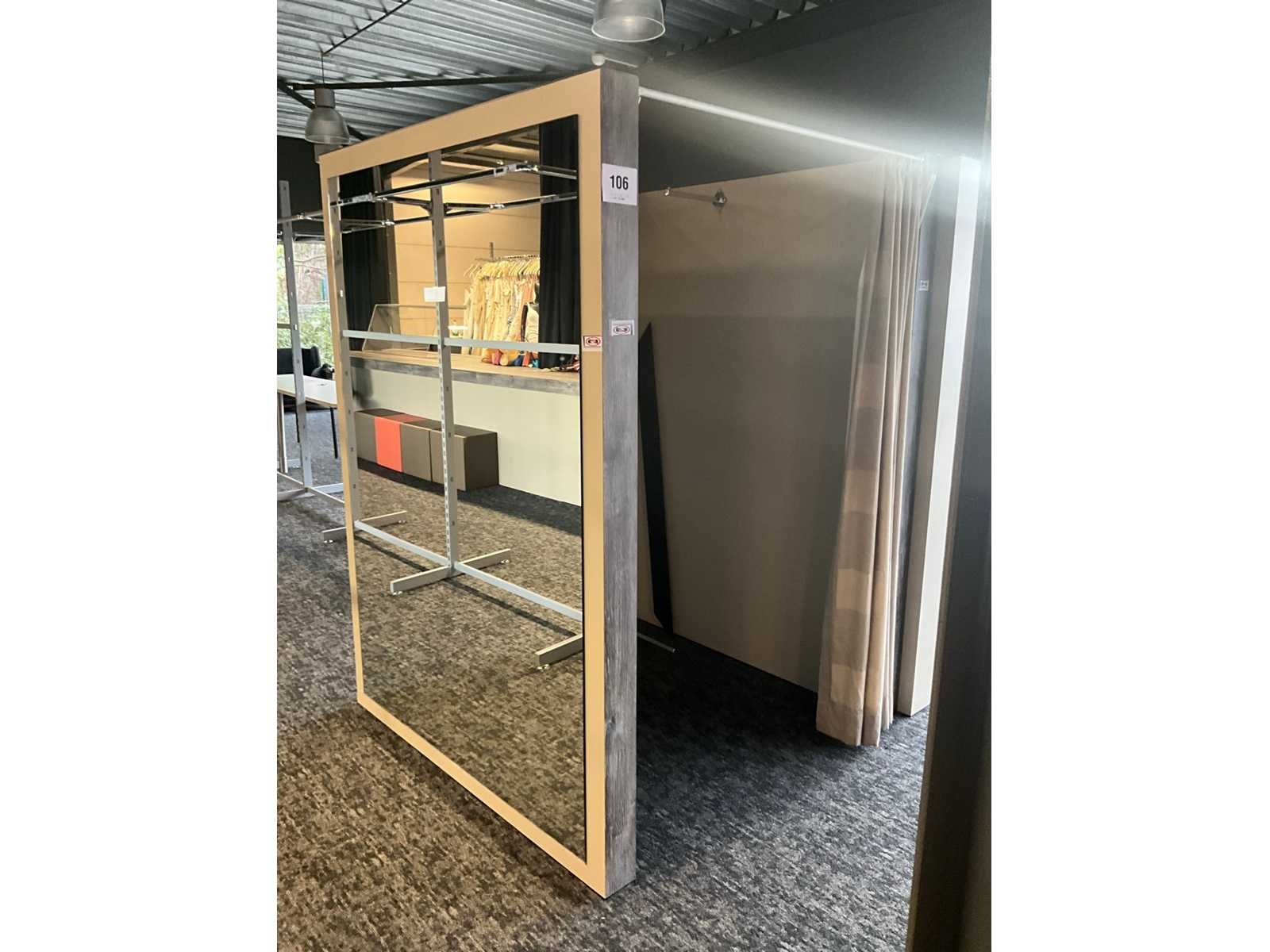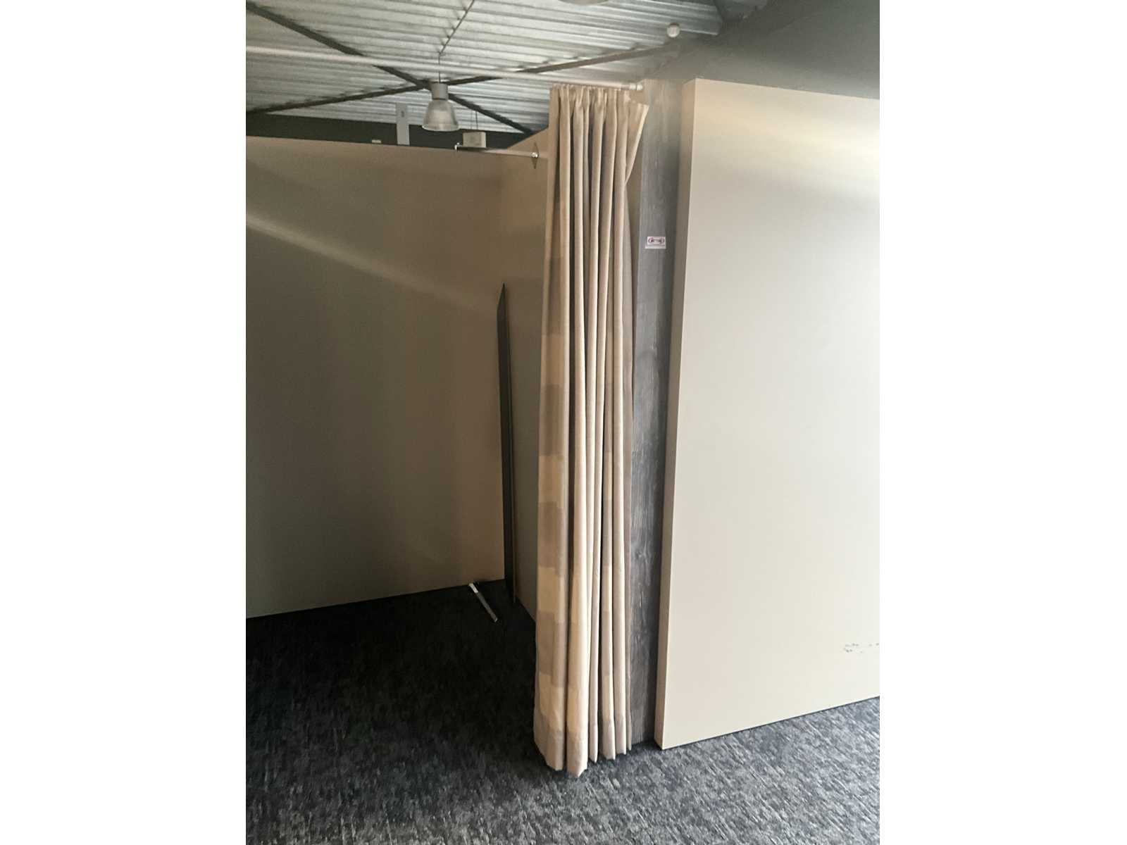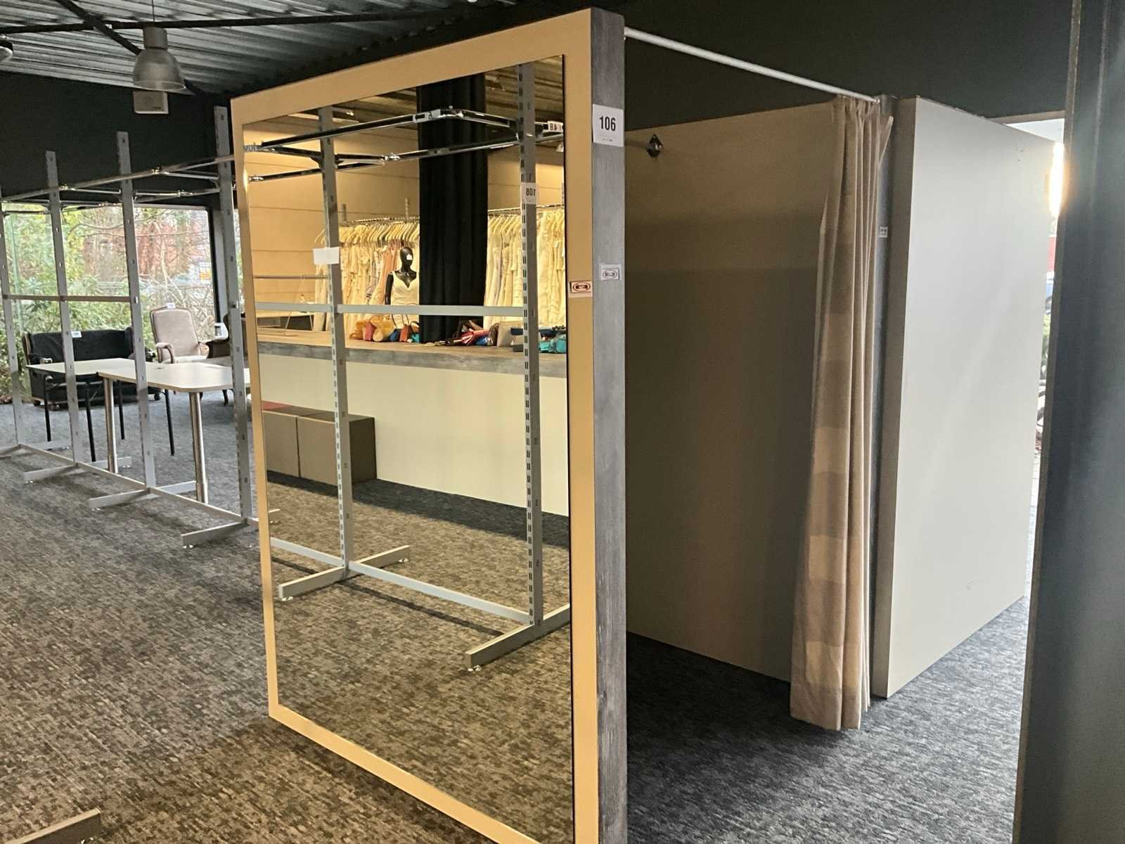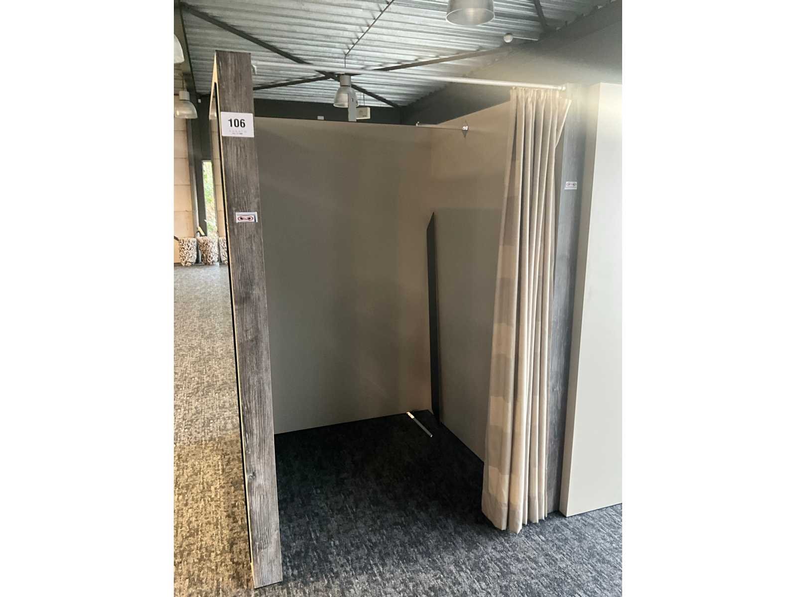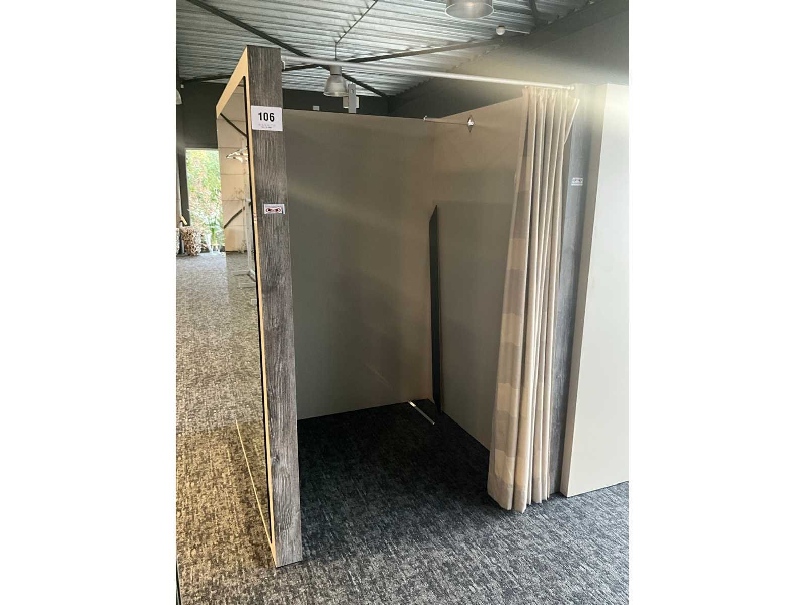 Zware houten paskamer voorzien van 1 grote spiegel langs 1 buitenzijde, en 1 hangsteun langs binnenzijde. Voorzien van draperie. Totale afmeting L: 1480mm Totale afmeting Breedte: 1440mm Totale afmeting Hoogte: 2020mm