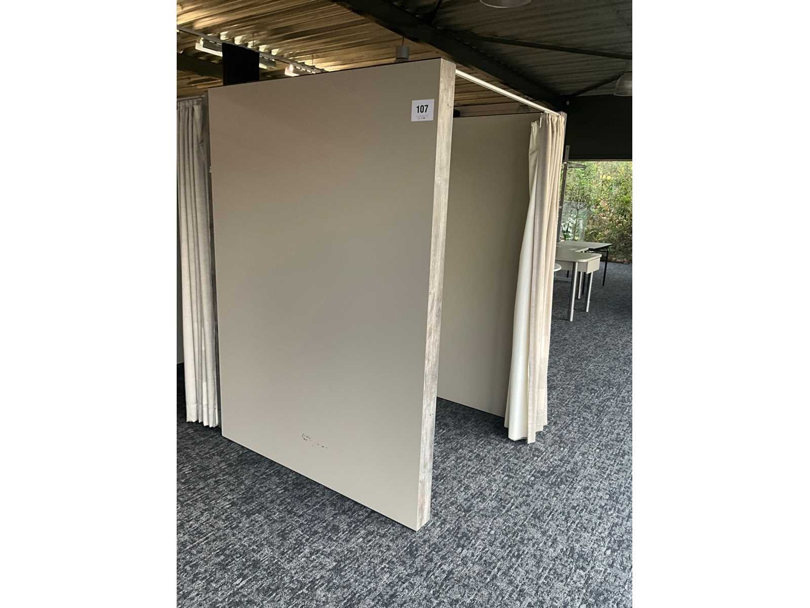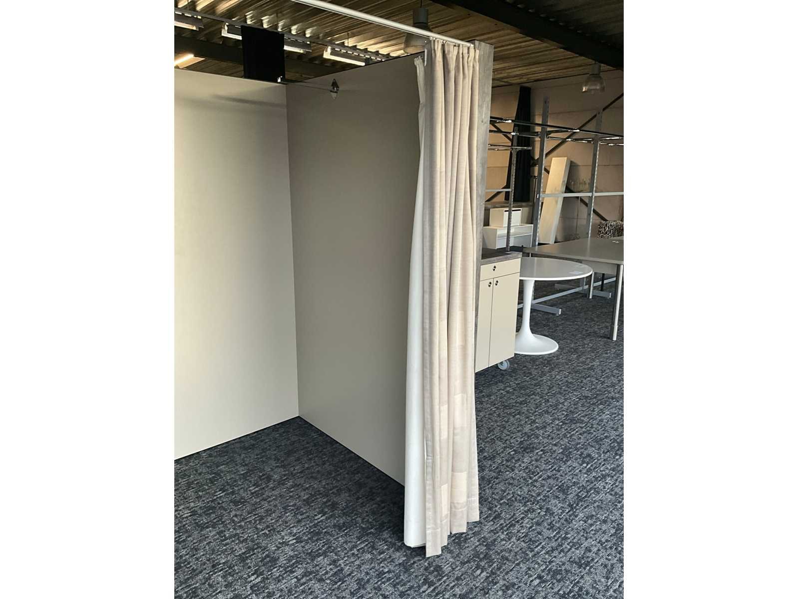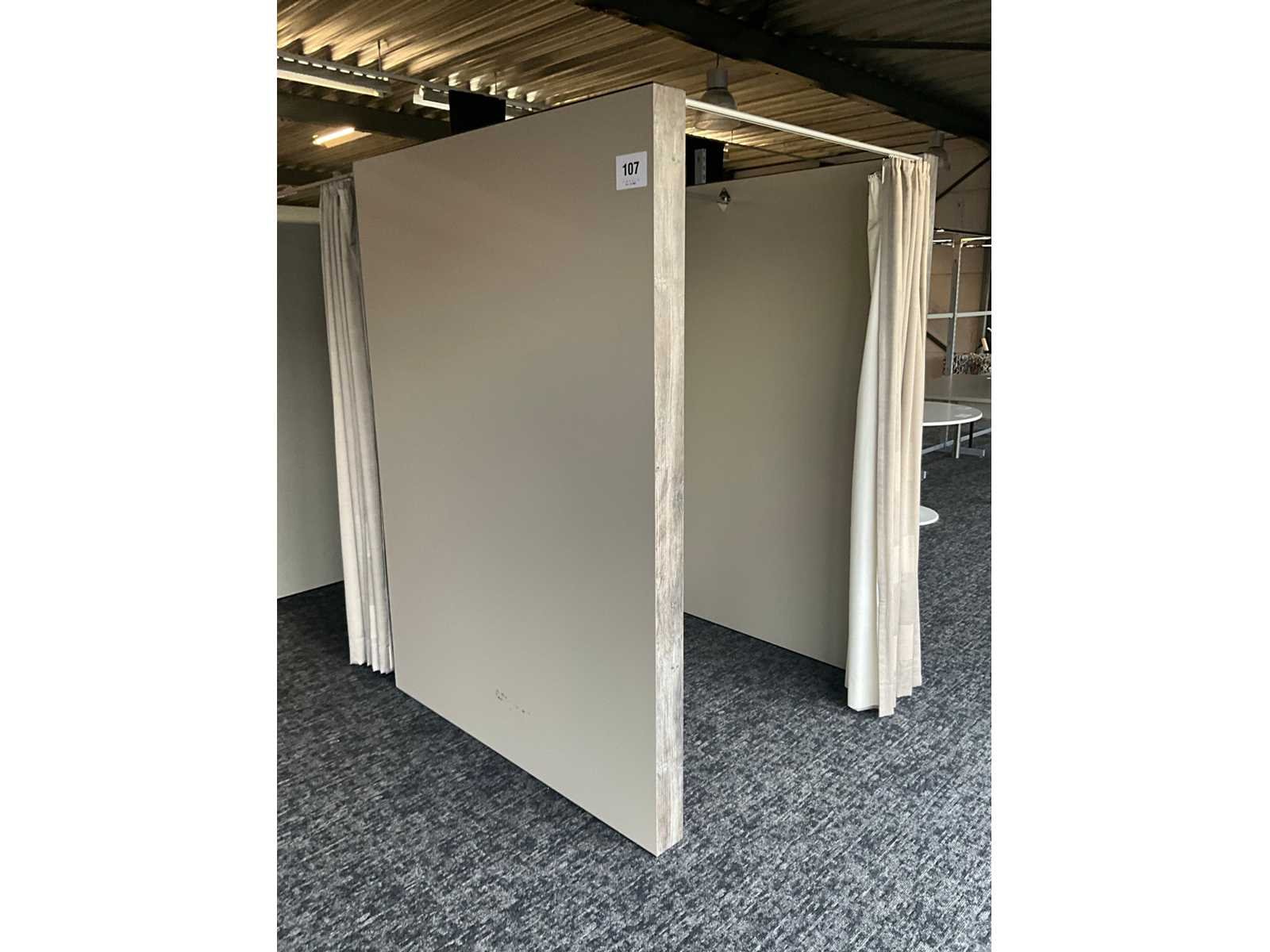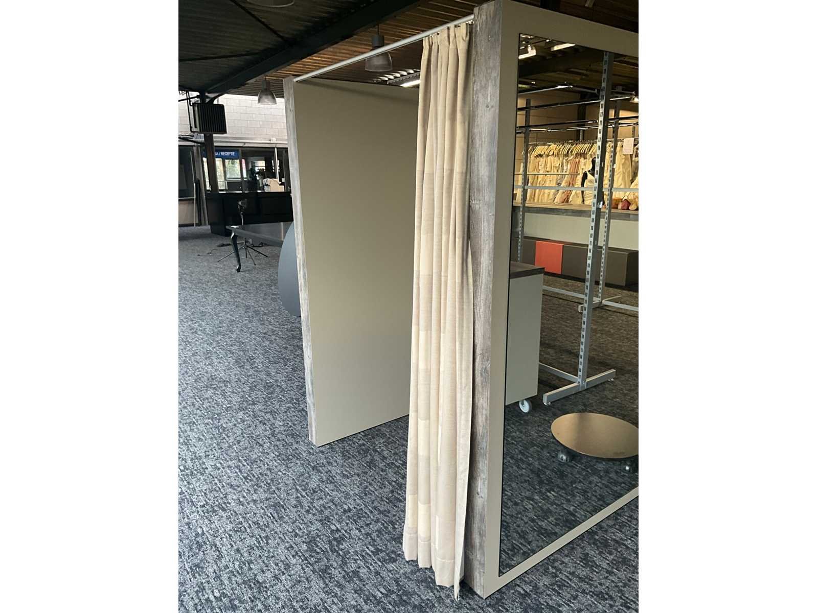 Zware houten paskamer voorzien van 1 grote spiegel langs 1 buitenzijde, en 1 hangsteun langs binnenzijde. Voorzien van draperie. Totale afmeting L: 1480mm Totale afmeting Breedte: 1440mm Totale afmeting Hoogte: 2020mm
