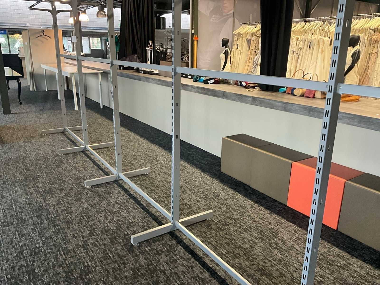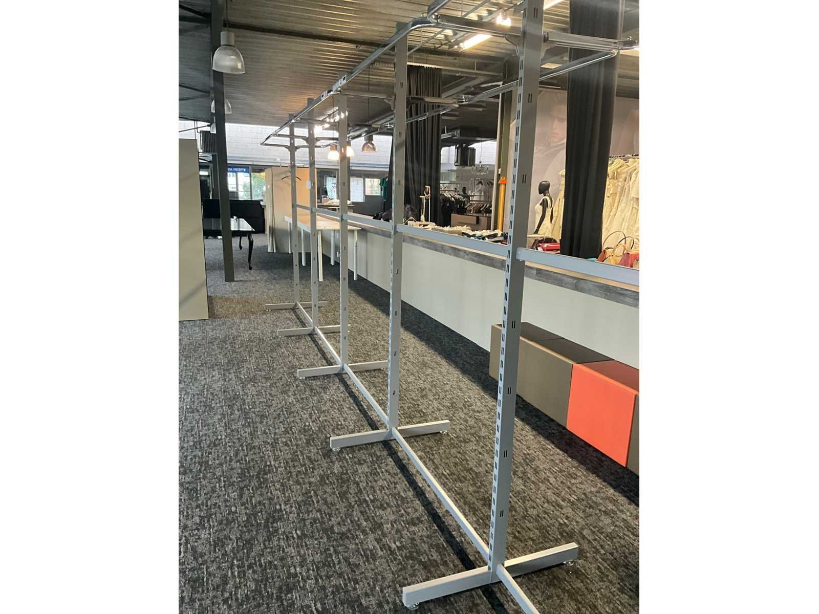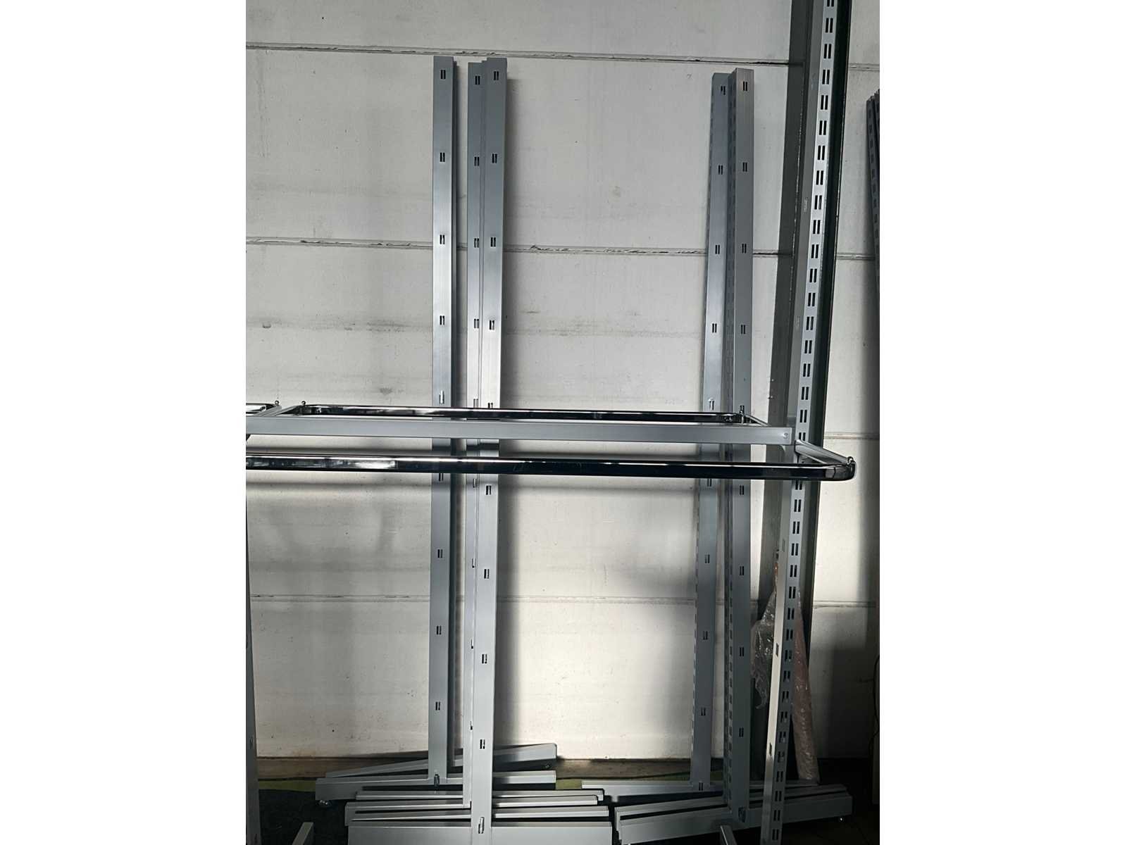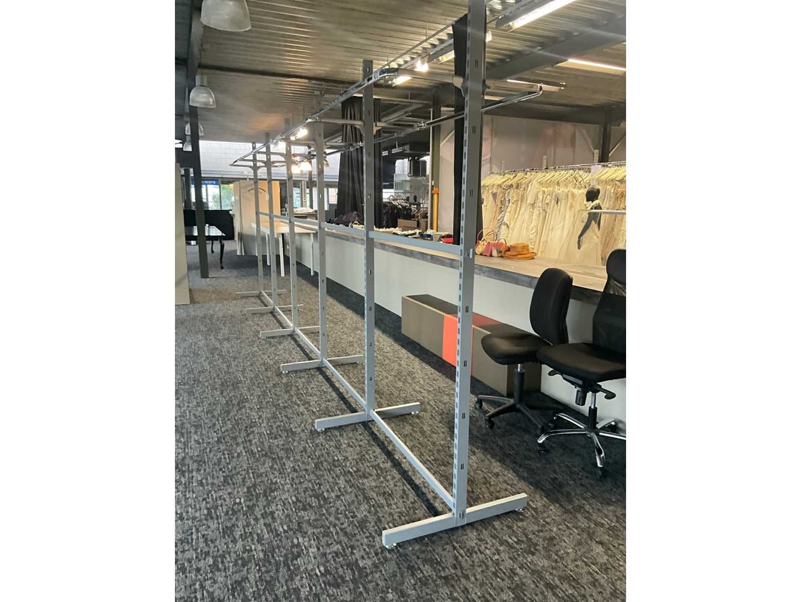 Modulaire metalen winkelrekken voorzien van rvs (in de hoogte) verstelbare dubbelzijdige hangsteunen. Compleet met circa 80 staanders. De staanders met bijhorende metalen baren (afstand tussen elke staander = ongeveer 128 cm, is de lengte van elke metalen tussensteun) en waaronder enige extra diverse gedemonteerde staanders en baren en hangsteunen in achterste ruimte. Zonder inhoud. Lengte: 5800cm Breedte: 78cm Hoogte: 238cm