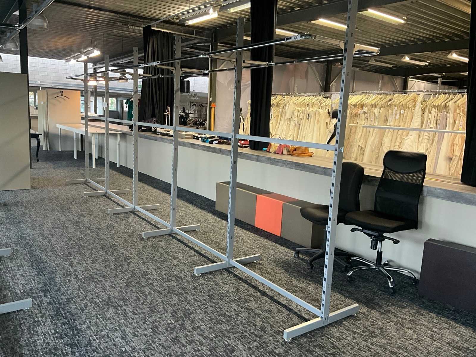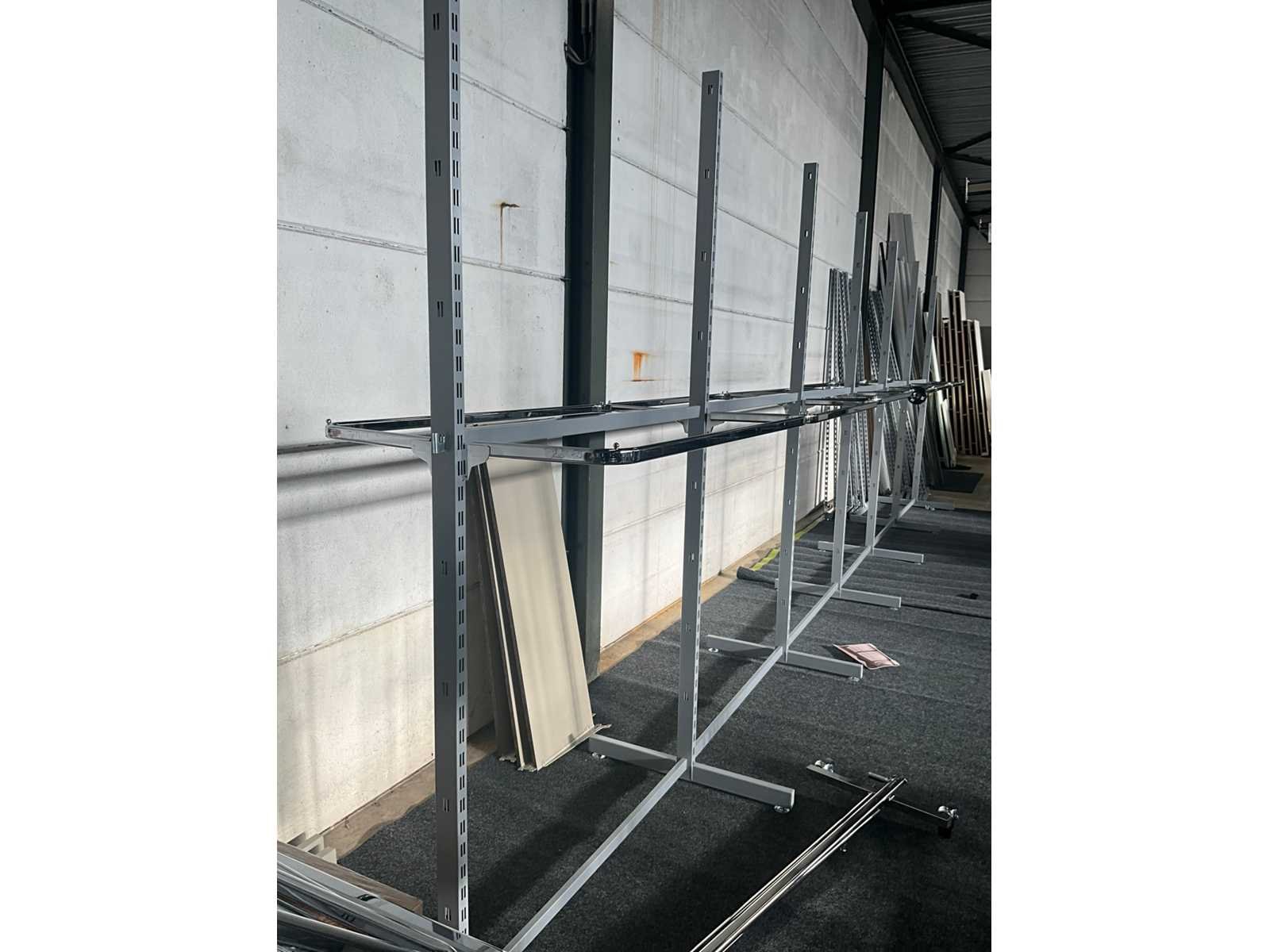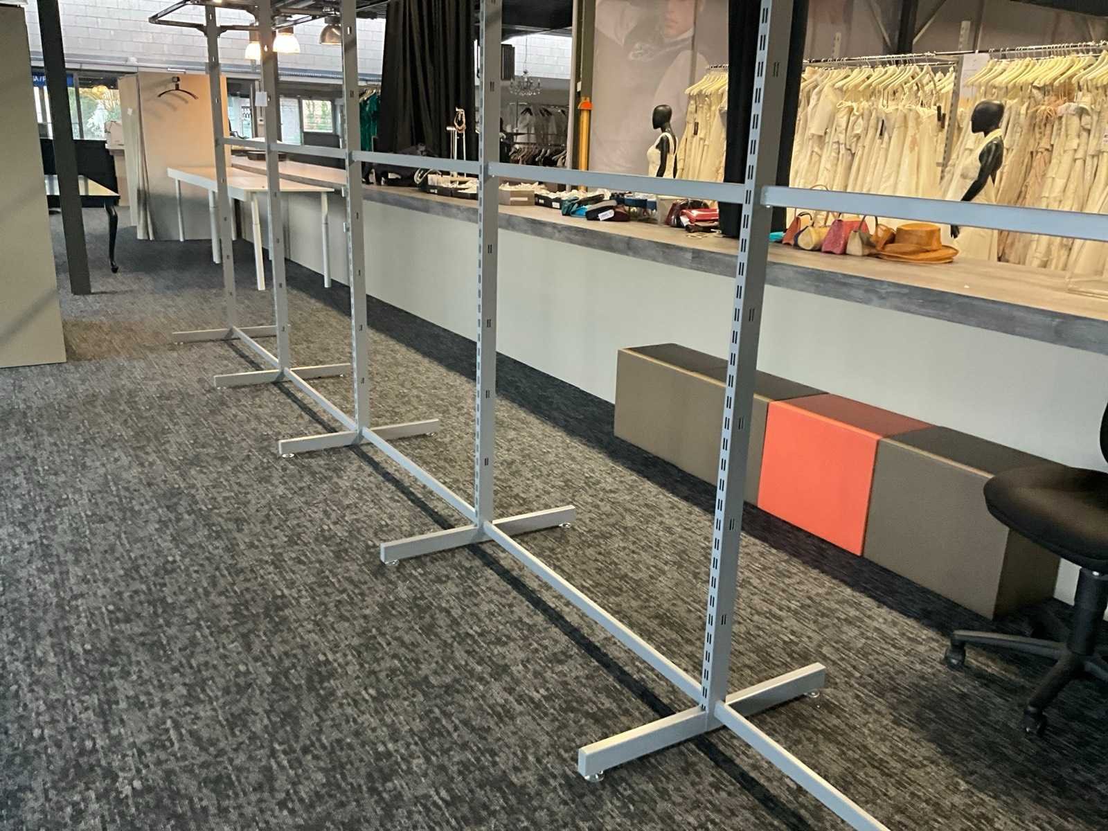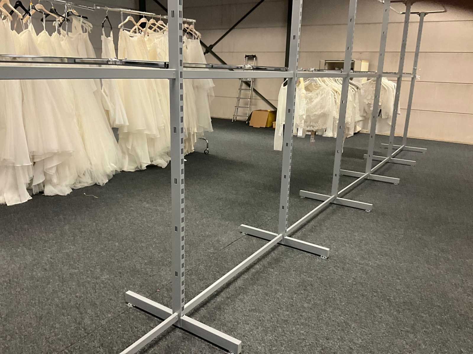 Modulaire metalen winkelrekken voorzien van rvs (in de hoogte) verstelbare dubbelzijdige hangsteunen. Compleet met circa 80 staanders. De staanders met bijhorende metalen baren (afstand tussen elke staander = ongeveer 128 cm, is de lengte van elke metalen tussensteun) en waaronder enige extra diverse gedemonteerde staanders en baren en hangsteunen in achterste ruimte. Zonder inhoud. Lengte: 5800cm Breedte: 78cm Hoogte: 238cm