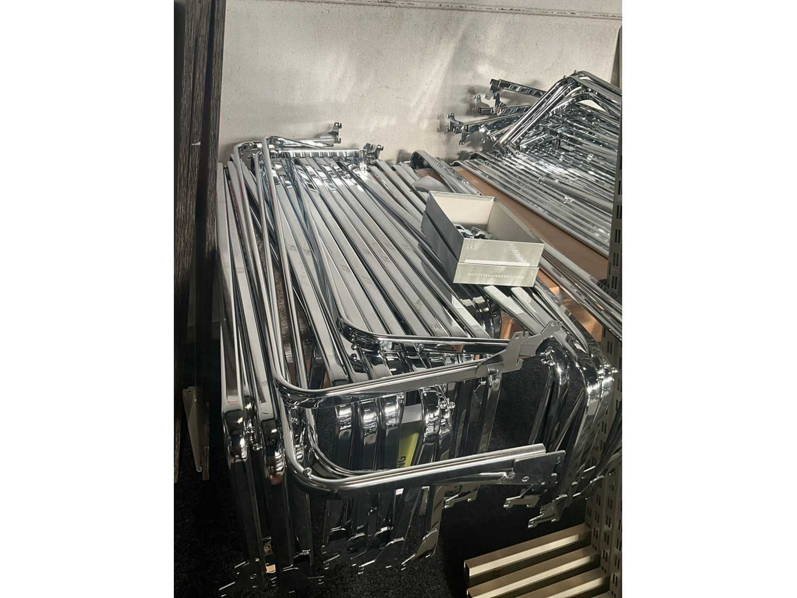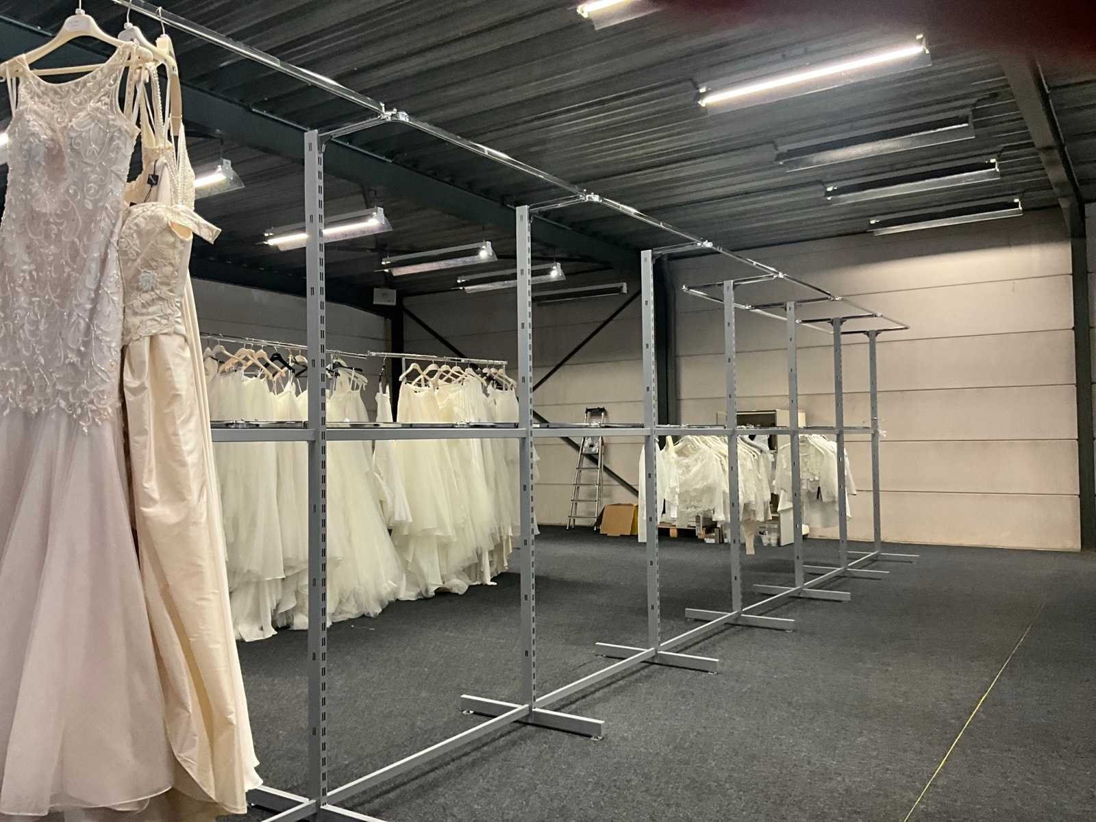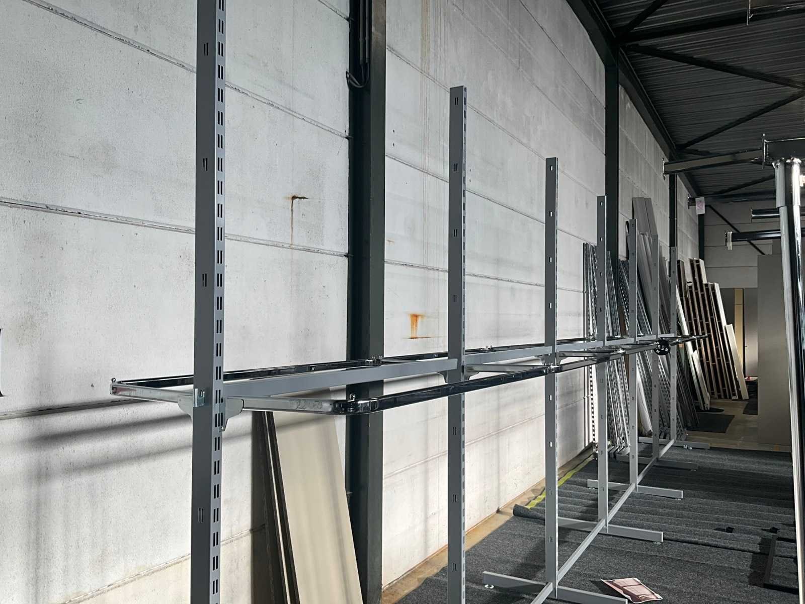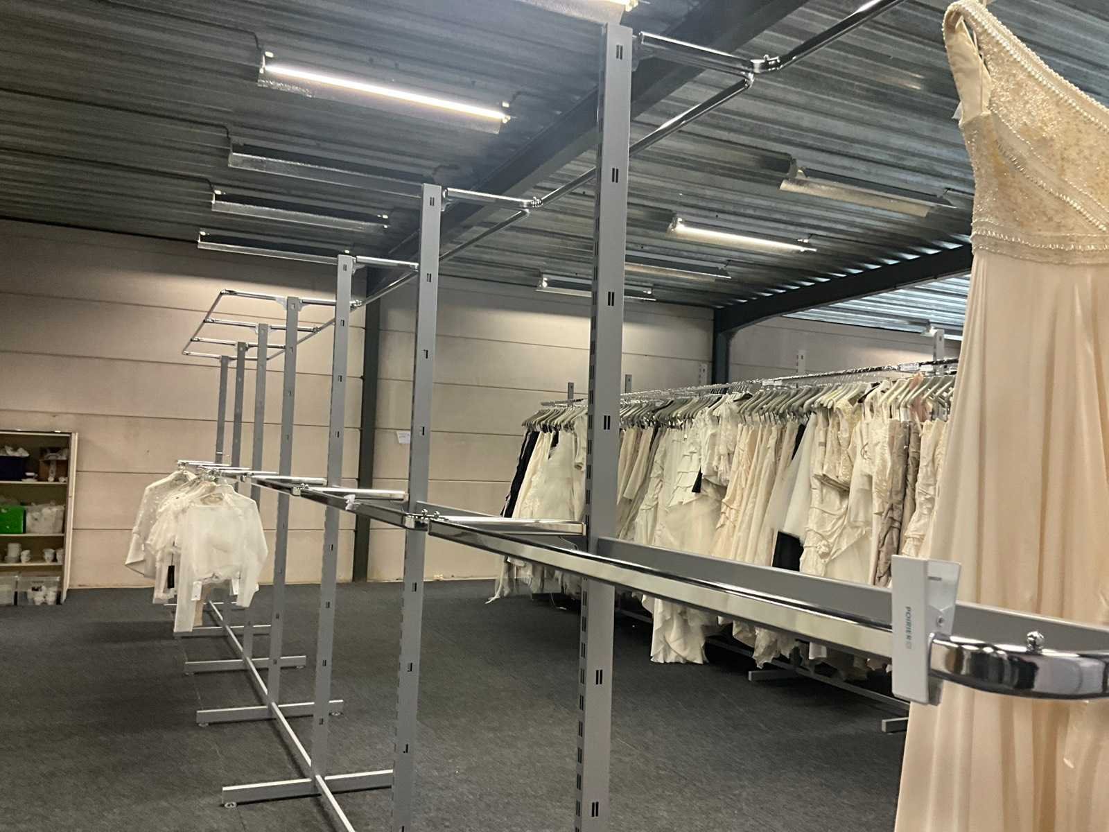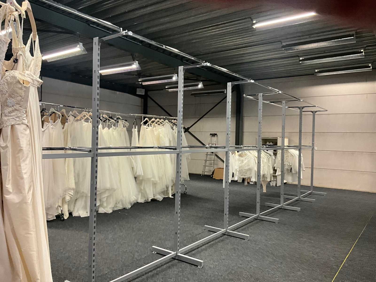 Modulaire metalen winkelrekken voorzien van rvs (in de hoogte) verstelbare dubbelzijdige hangsteunen. Compleet met circa 80 staanders. De staanders met bijhorende metalen baren (afstand tussen elke staander = ongeveer 128 cm, is de lengte van elke metalen tussensteun) en waaronder enige extra diverse gedemonteerde staanders en baren en hangsteunen in achterste ruimte. Zonder inhoud. Lengte: 5800cm Breedte: 78cm Hoogte: 238cm