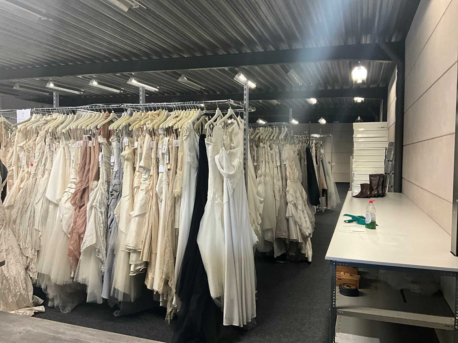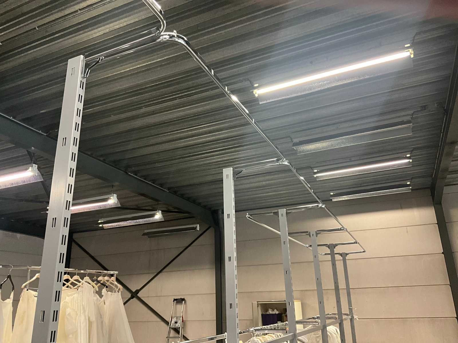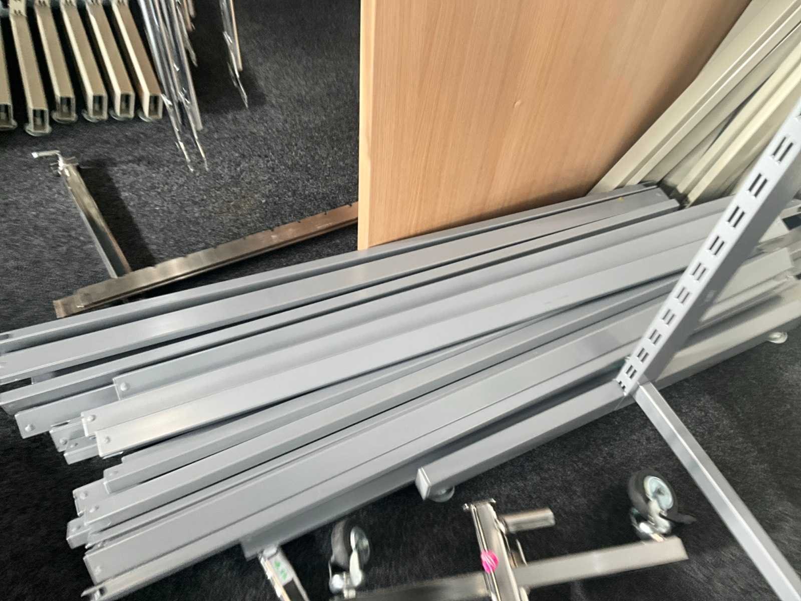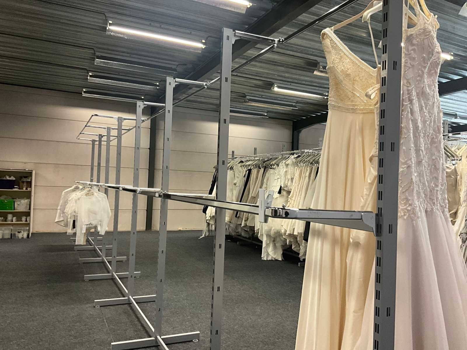 Modulaire metalen winkelrekken voorzien van rvs (in de hoogte) verstelbare dubbelzijdige hangsteunen. Compleet met circa 80 staanders. De staanders met bijhorende metalen baren (afstand tussen elke staander = ongeveer 128 cm, is de lengte van elke metalen tussensteun) en waaronder enige extra diverse gedemonteerde staanders en baren en hangsteunen in achterste ruimte. Zonder inhoud. Lengte: 5800cm Breedte: 78cm Hoogte: 238cm
