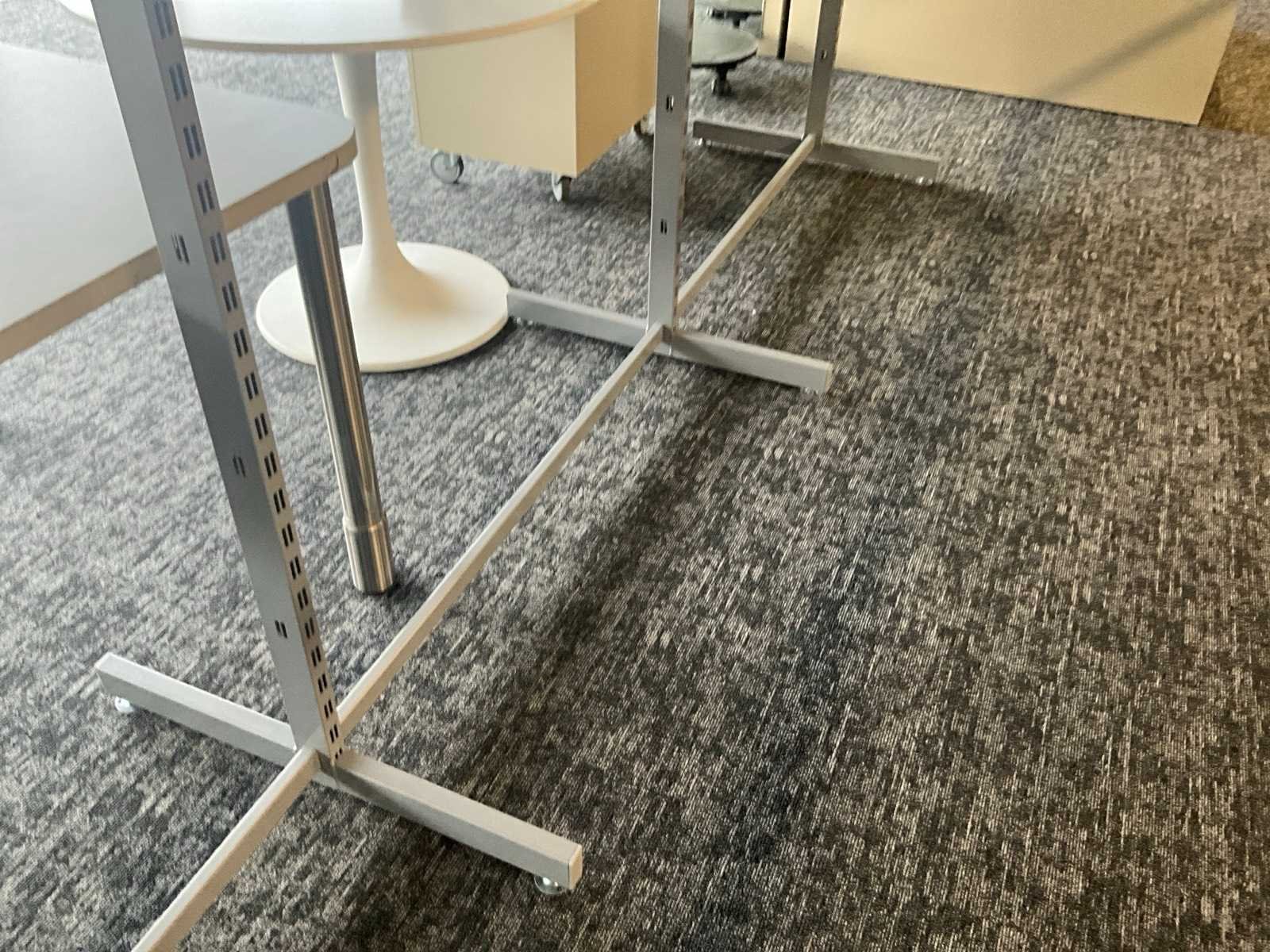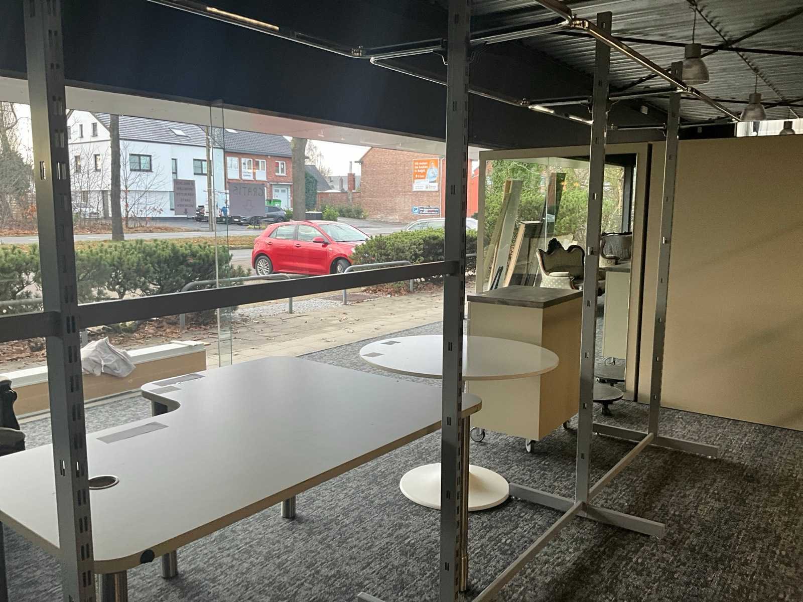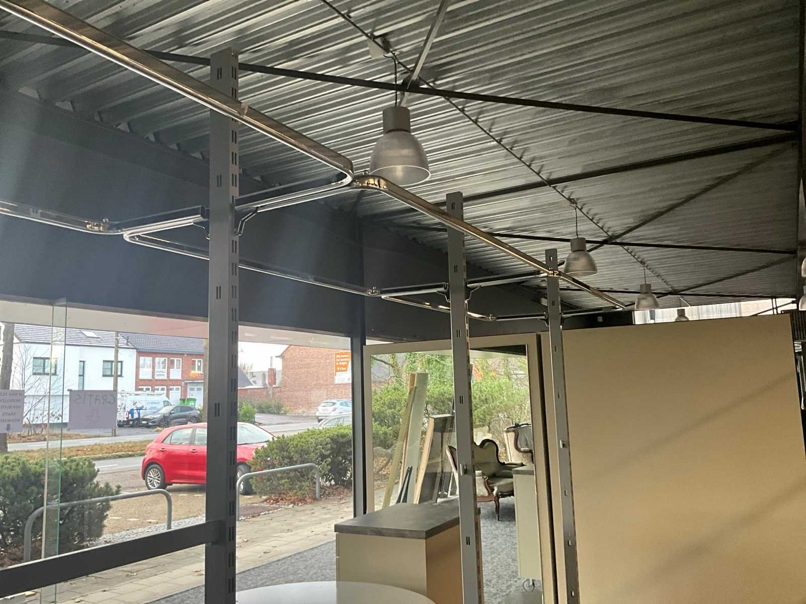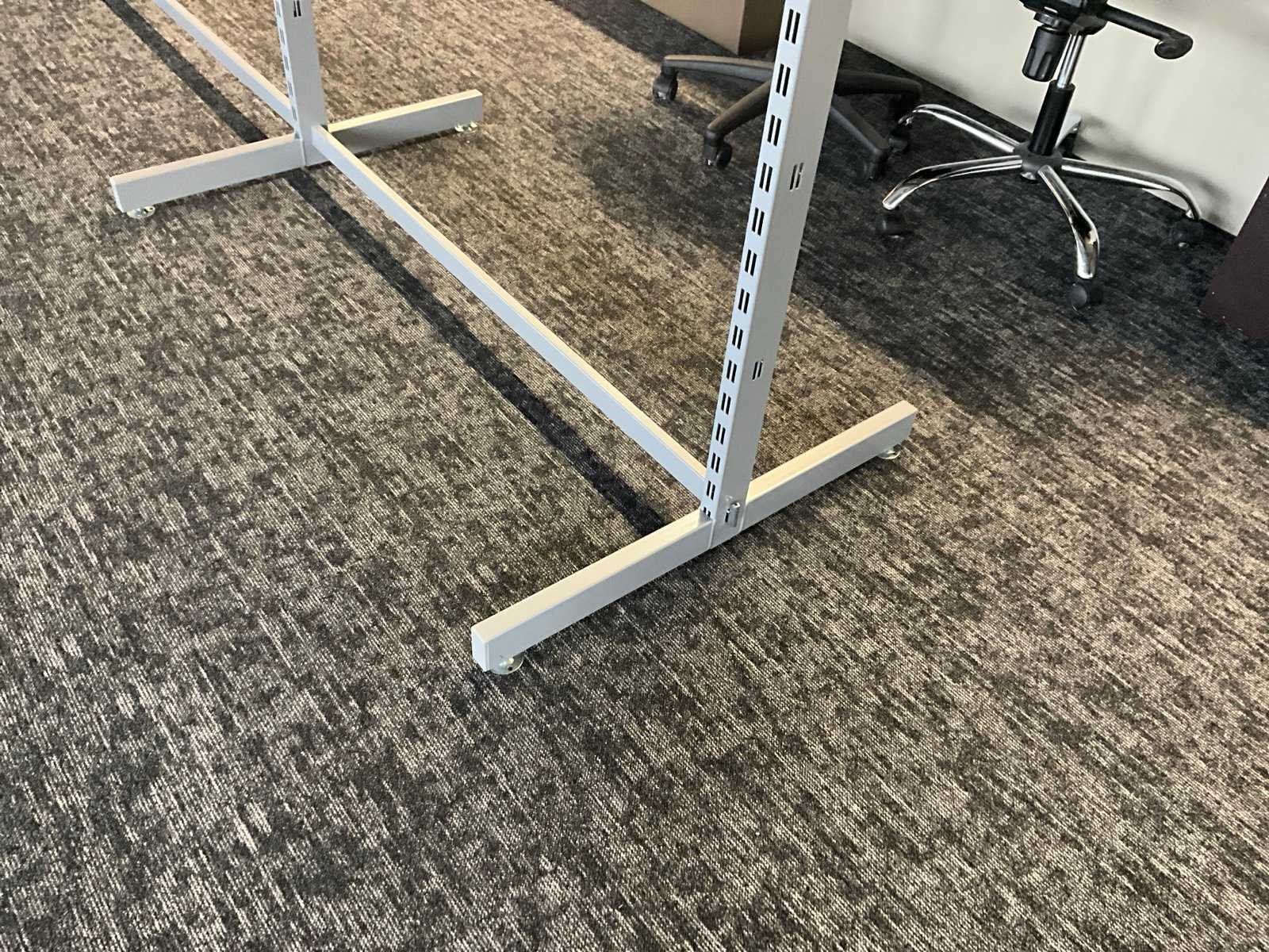 Modulaire metalen winkelrekken voorzien van rvs (in de hoogte) verstelbare dubbelzijdige hangsteunen. Compleet met circa 80 staanders. De staanders met bijhorende metalen baren (afstand tussen elke staander = ongeveer 128 cm, is de lengte van elke metalen tussensteun) en waaronder enige extra diverse gedemonteerde staanders en baren en hangsteunen in achterste ruimte. Zonder inhoud. Lengte: 5800cm Breedte: 78cm Hoogte: 238cm