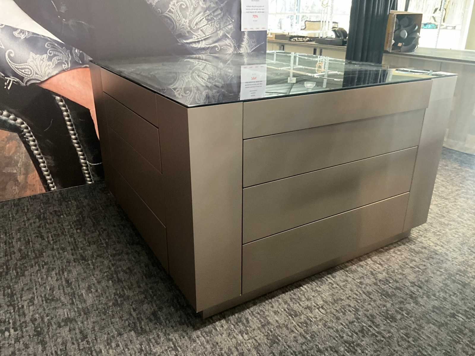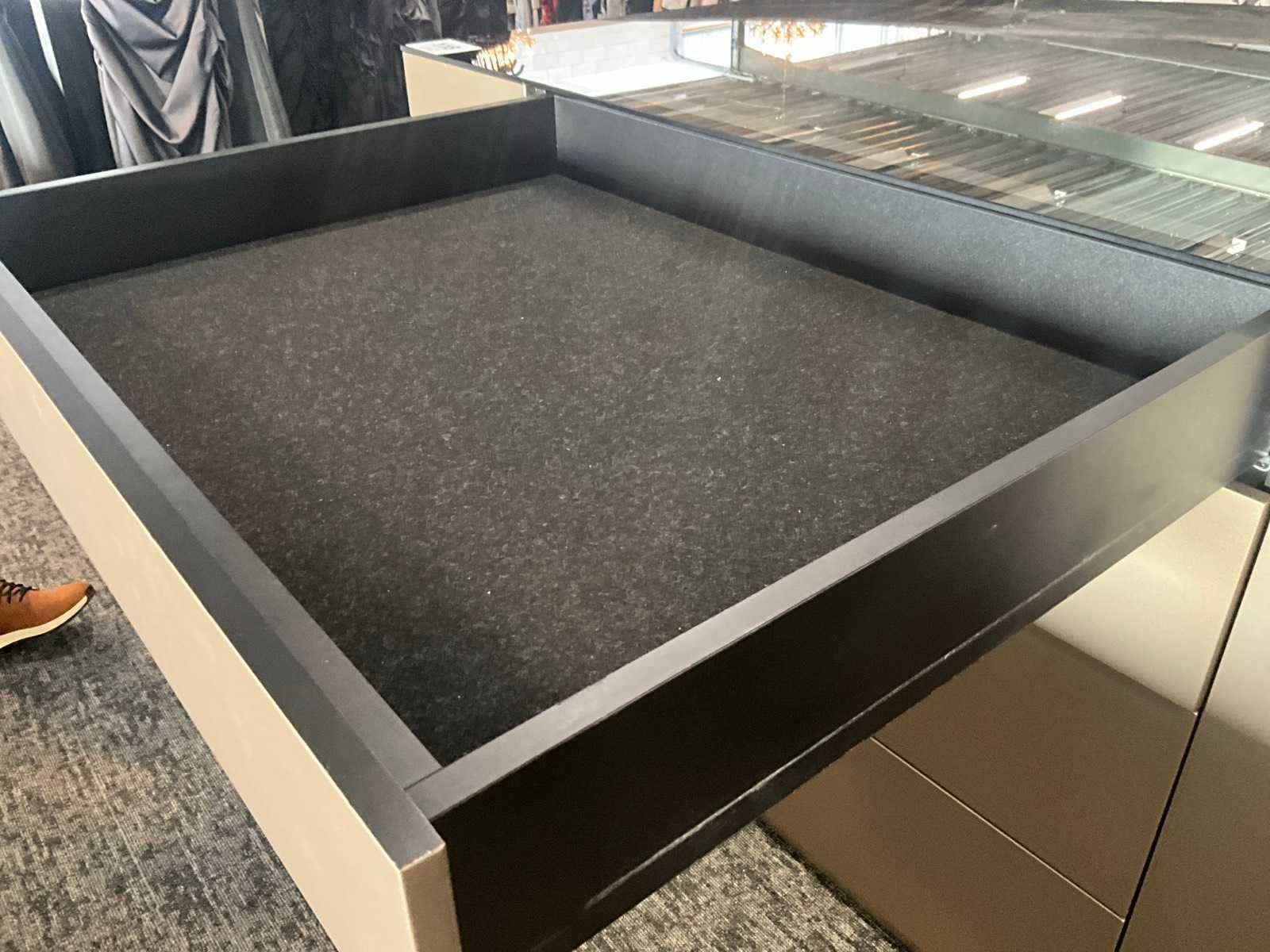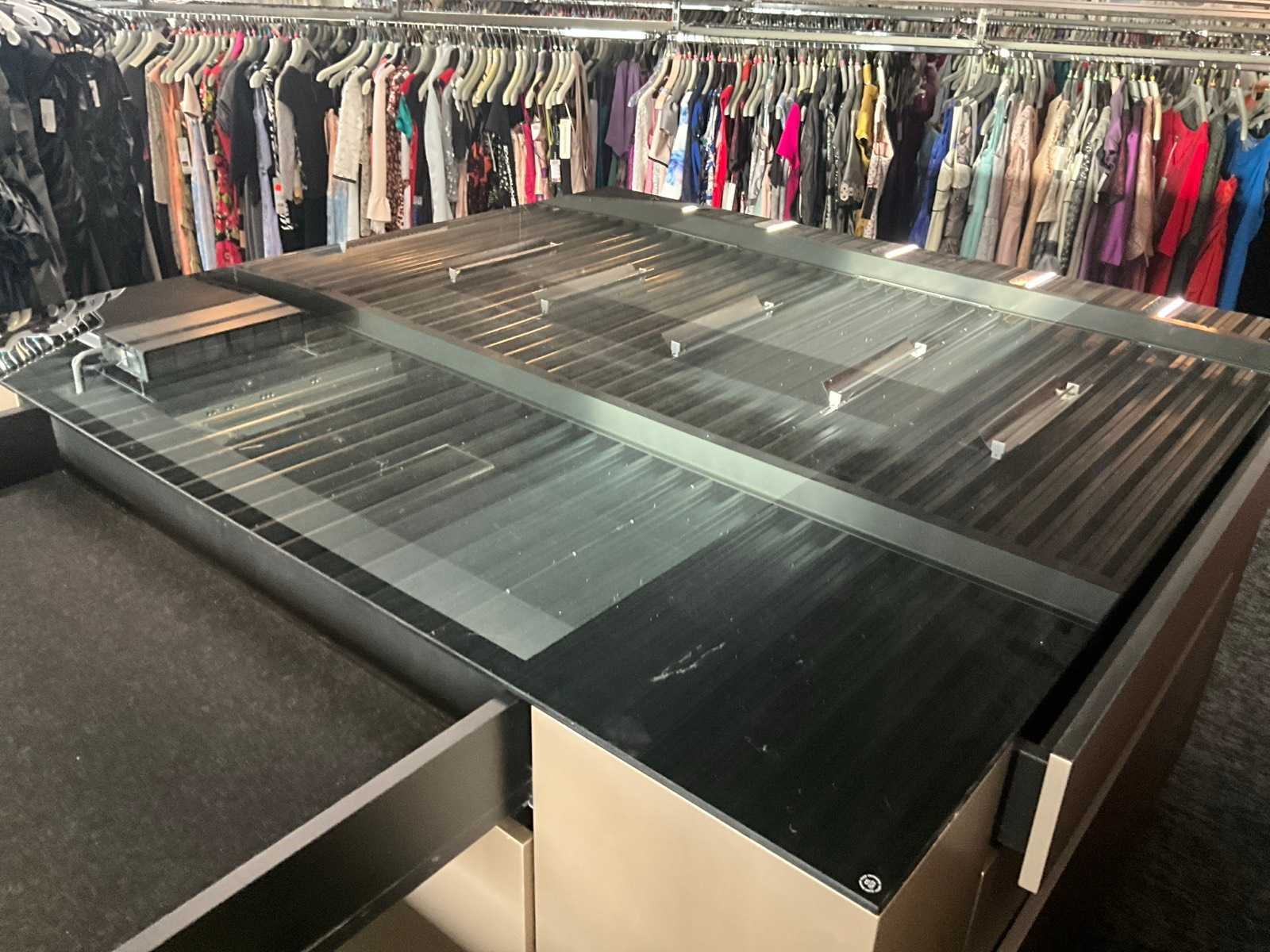 Langs alle 4 de zijden voorzien van 4 schuiven, totaal 16 laden waarvan 4 laden met glazen blad bovenaan. Aantal laden: 16 Totale afmeting L: 1680mm Totale afmeting Breedte: 1650mm Totale afmeting Hoogte: 1070mm
