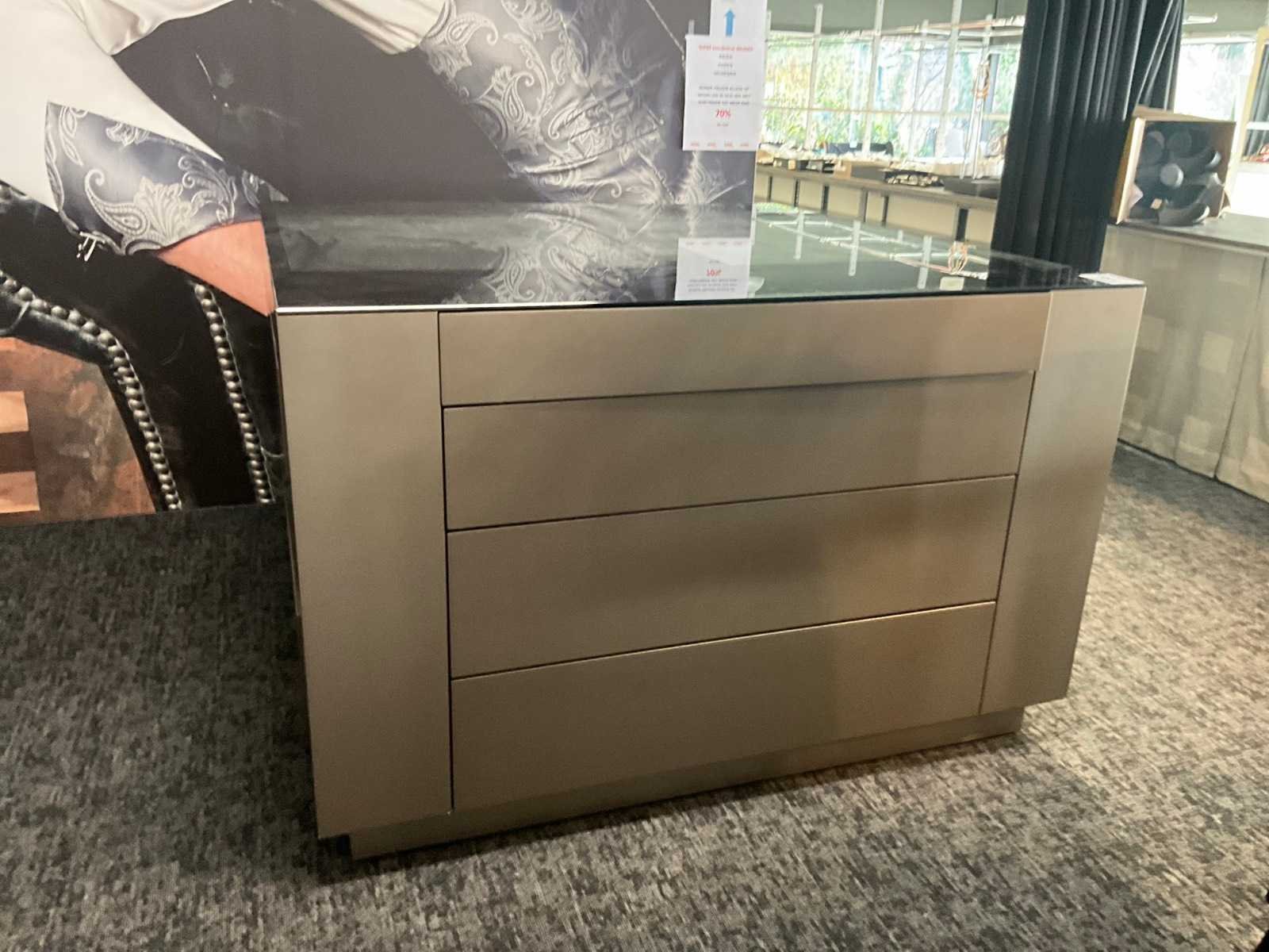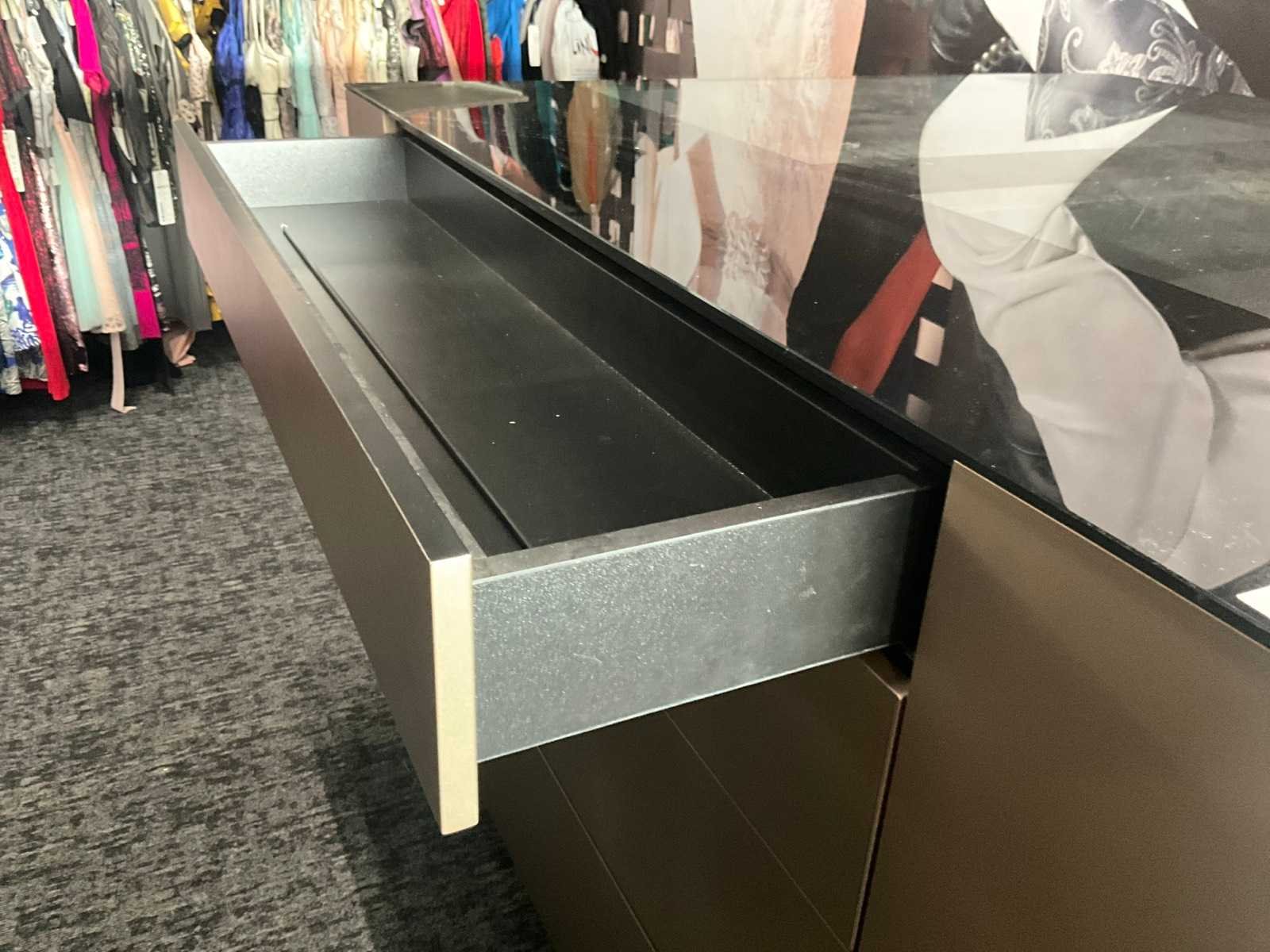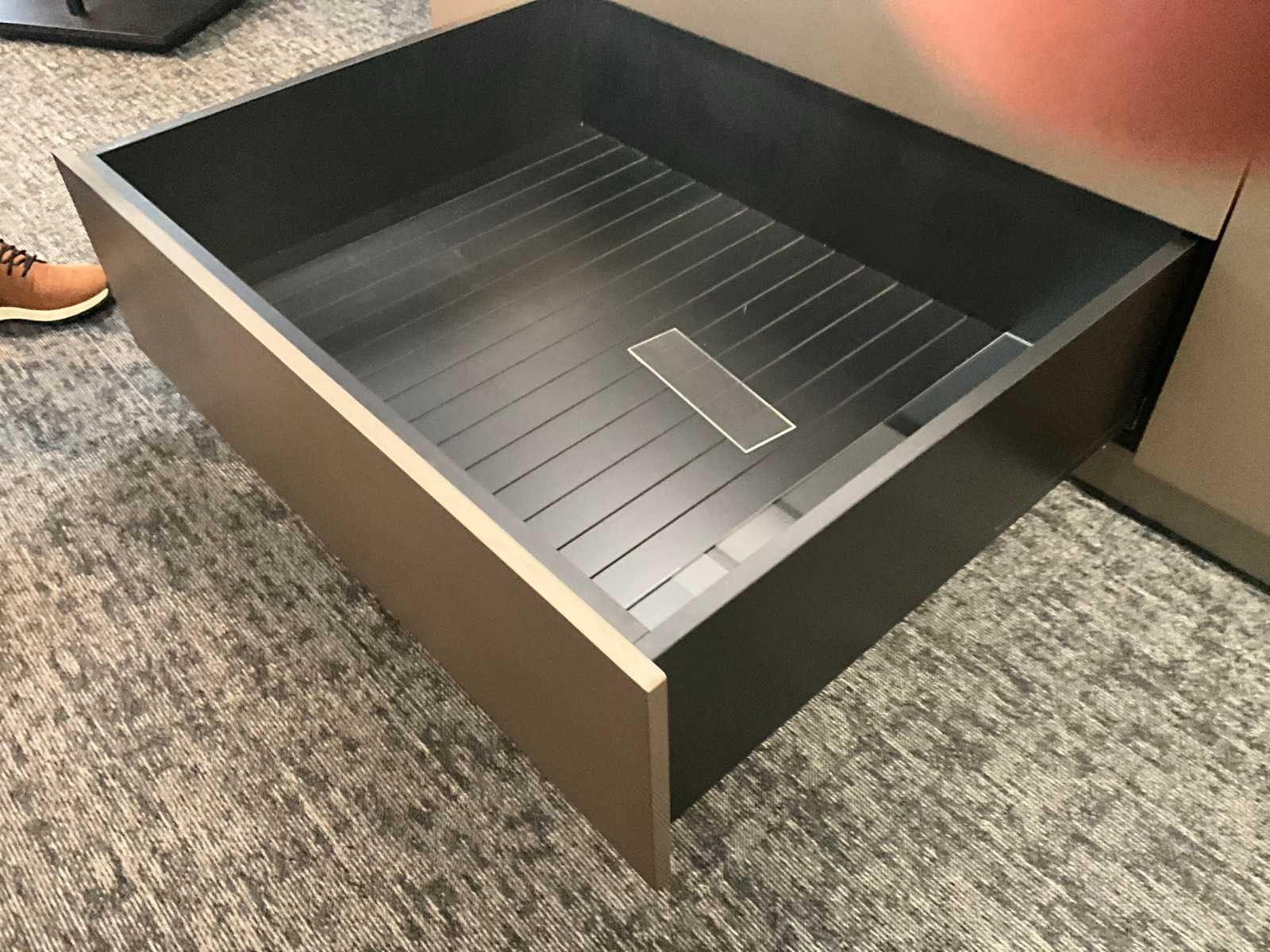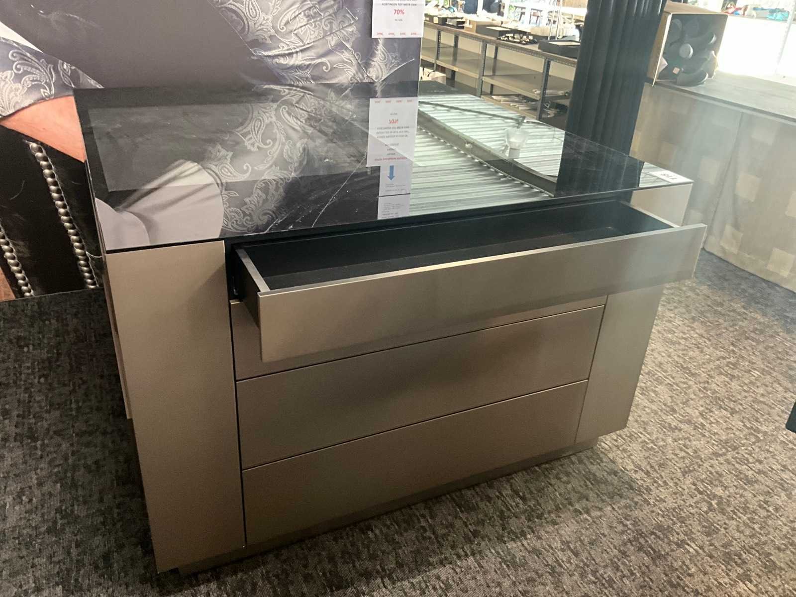Langs alle 4 de zijden voorzien van 4 schuiven, totaal 16 laden waarvan 4 laden met glazen blad bovenaan. Aantal laden: 16 Totale afmeting L: 1680mm Totale afmeting Breedte: 1650mm Totale afmeting Hoogte: 1070mm