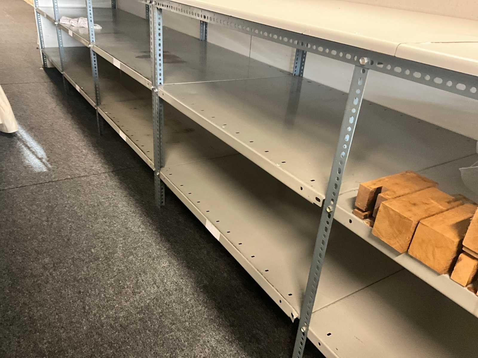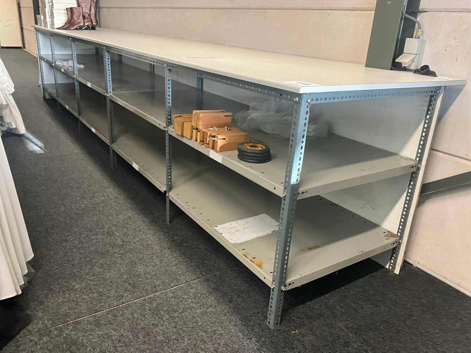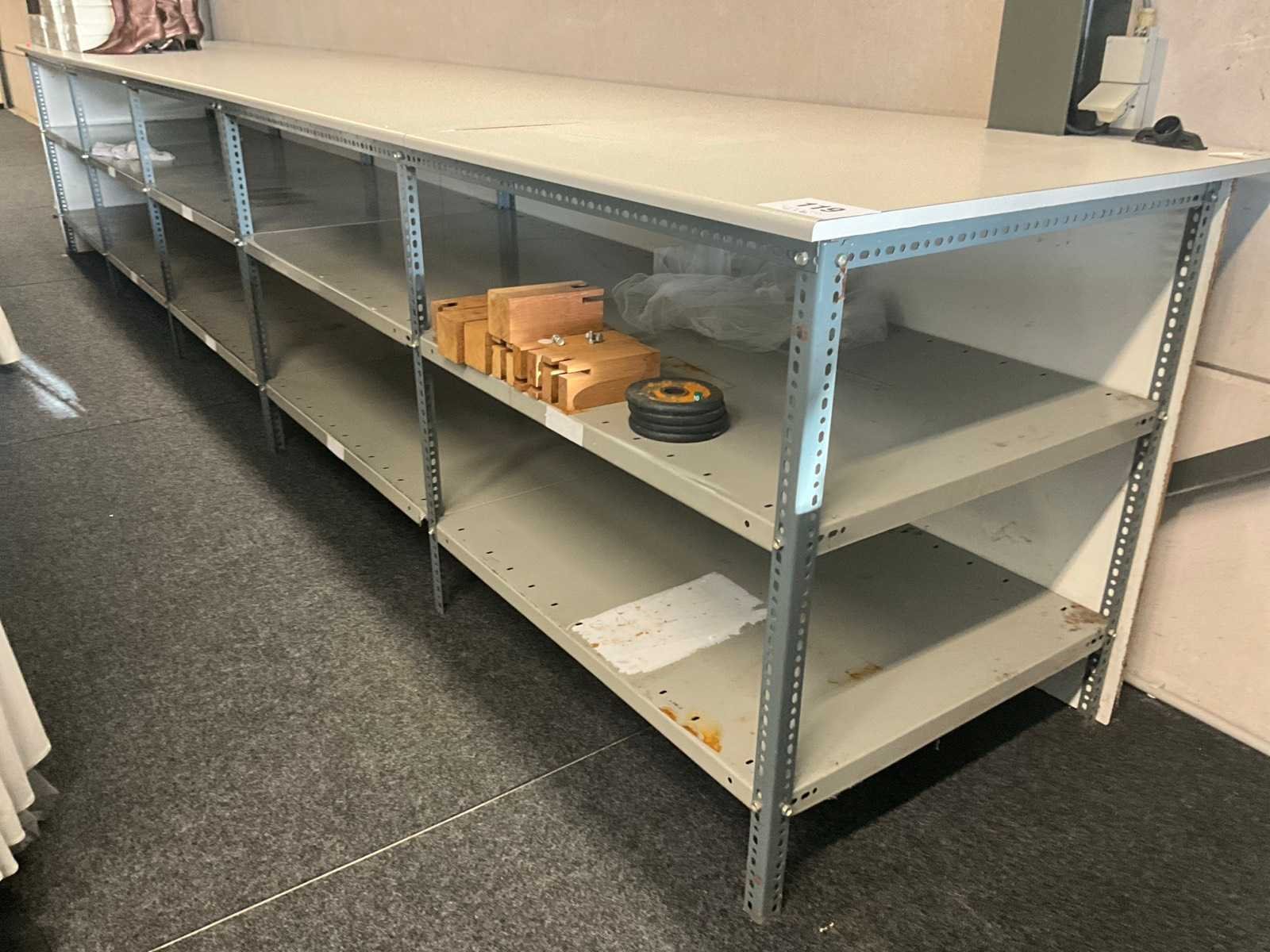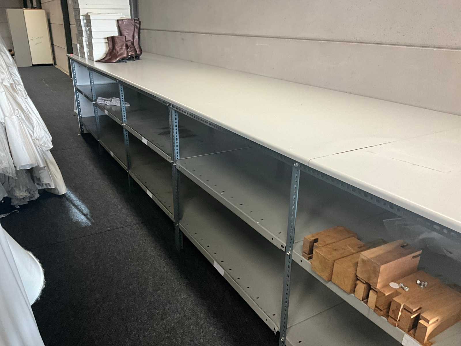 Met bovenaan houten bovenblad en onderaan metalen legbordstelling telkens voorzien van diverse leggers en achteraan in houten wanduitvoering. Totale afmeting L: 500cm Totale afmeting Breedte: 95cm Totale afmeting Hoogte: 94cm