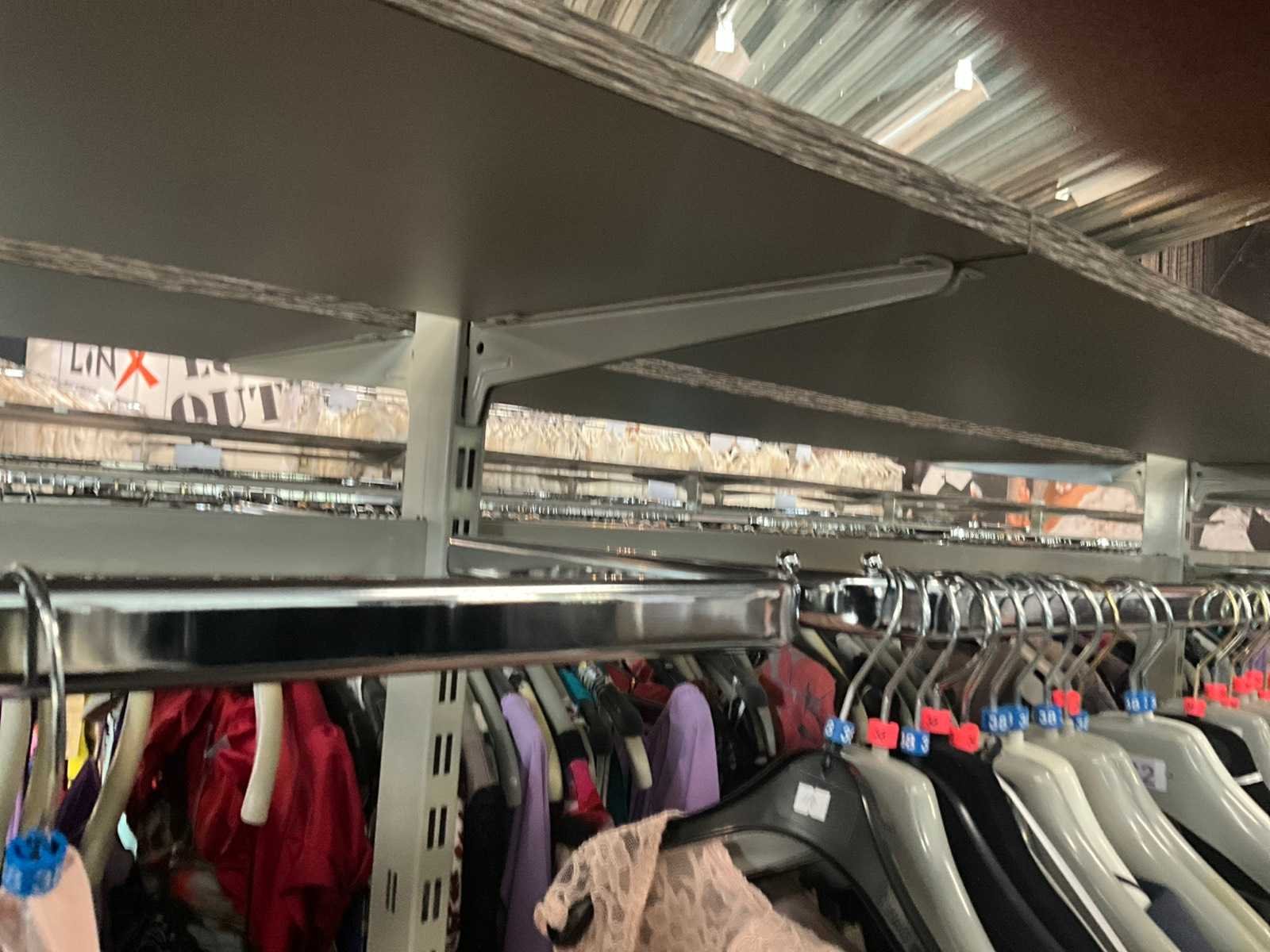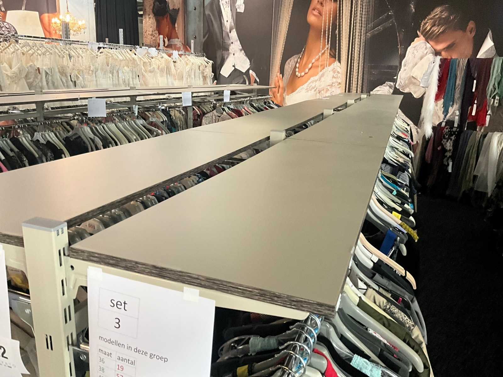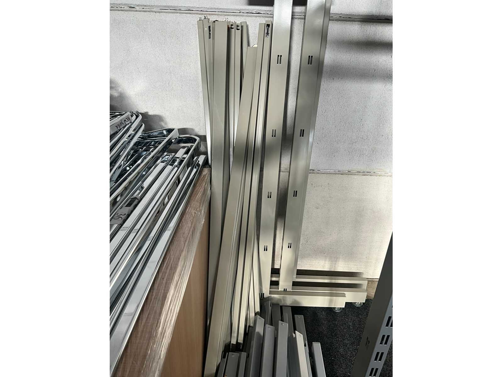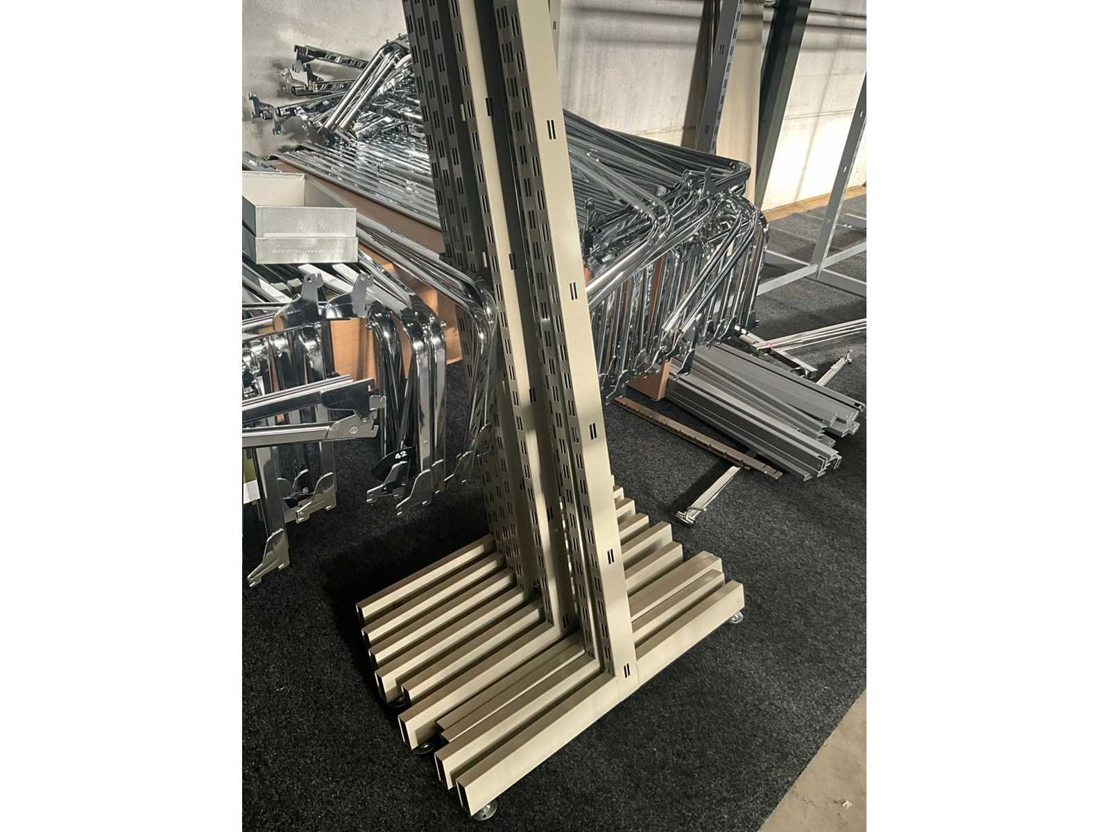 Modulaire metalen winkelrekken voorzien van rvs (in de hoogte) verstelbare dubbelzijdige hangsteunen. En telkens voorzien van houten legplanken bovenaan. Compleet met 18 staanders met bijhorende metalen baren (afstand tussen elke staander = ongeveer 128 cm, is de lengte van elke metalen tussensteun) en enige extra diverse gedemonteerde staanders en baren en legplanken in achterste ruimte. Zonder inhoud ! Lengte: 1920cm Breedte: 78cm Hoogte: 152cm