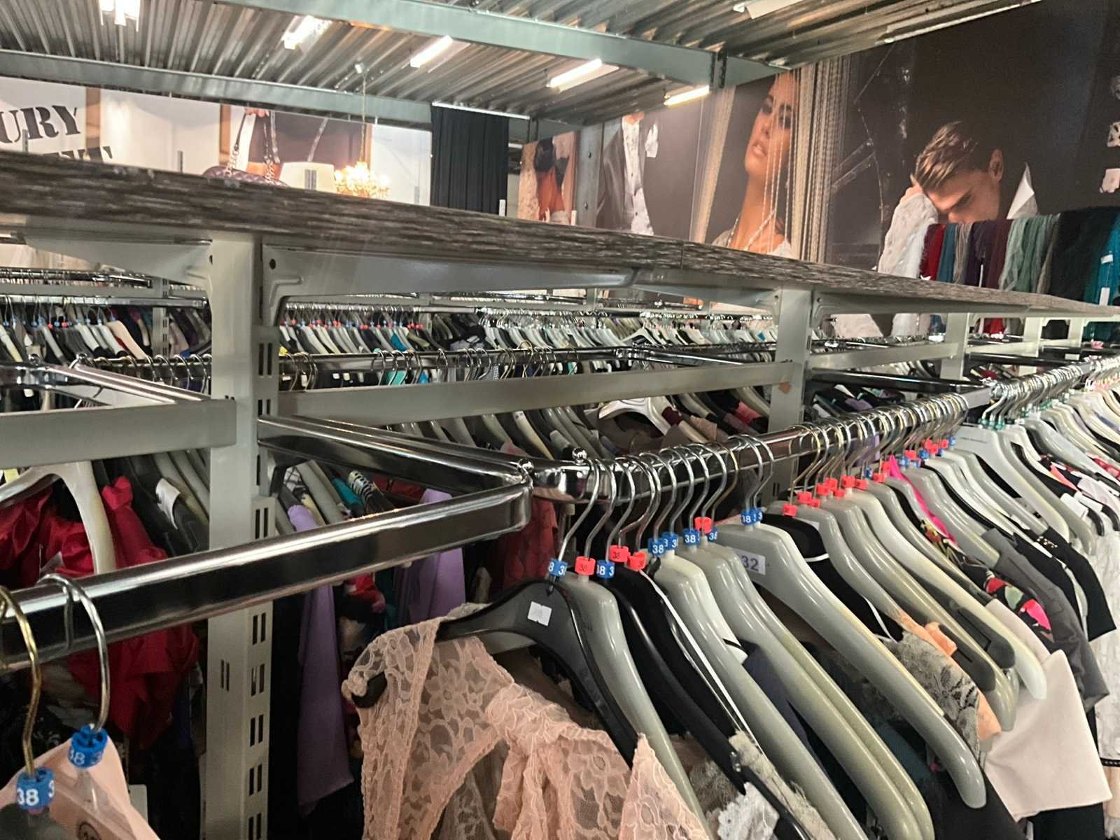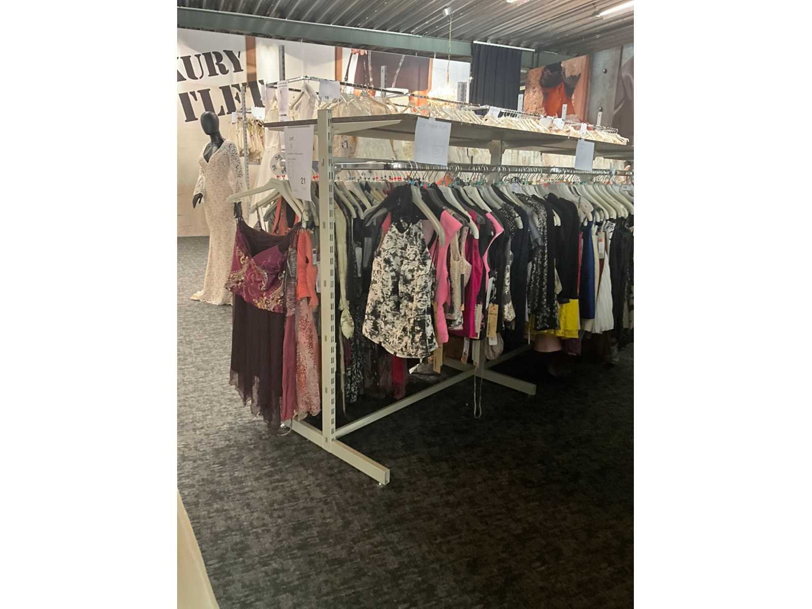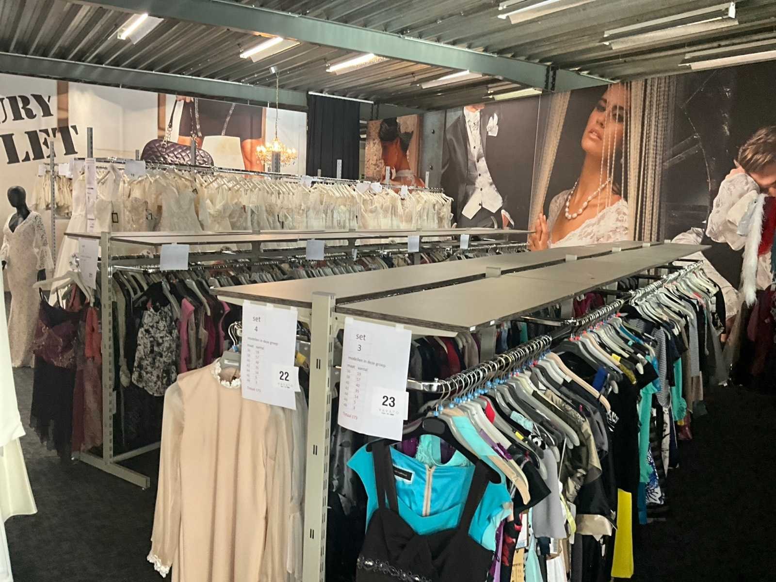 Modulaire metalen winkelrekken voorzien van rvs (in de hoogte) verstelbare dubbelzijdige hangsteunen. En telkens voorzien van houten legplanken bovenaan. Compleet met 18 staanders met bijhorende metalen baren (afstand tussen elke staander = ongeveer 128 cm, is de lengte van elke metalen tussensteun) en enige extra diverse gedemonteerde staanders en baren en legplanken in achterste ruimte. Zonder inhoud ! Lengte: 1920cm Breedte: 78cm Hoogte: 152cm
