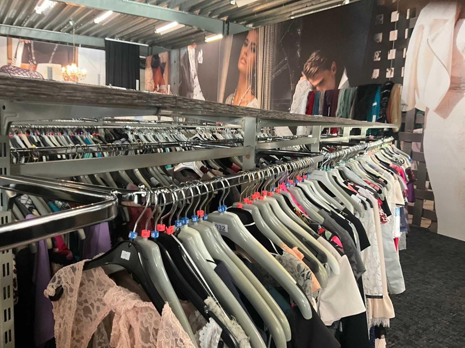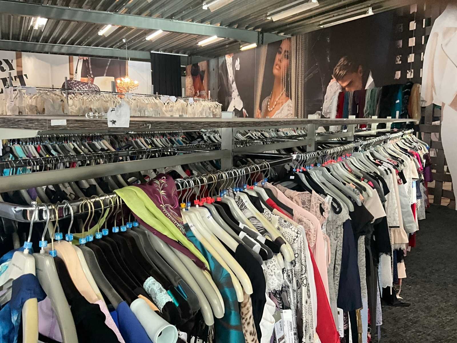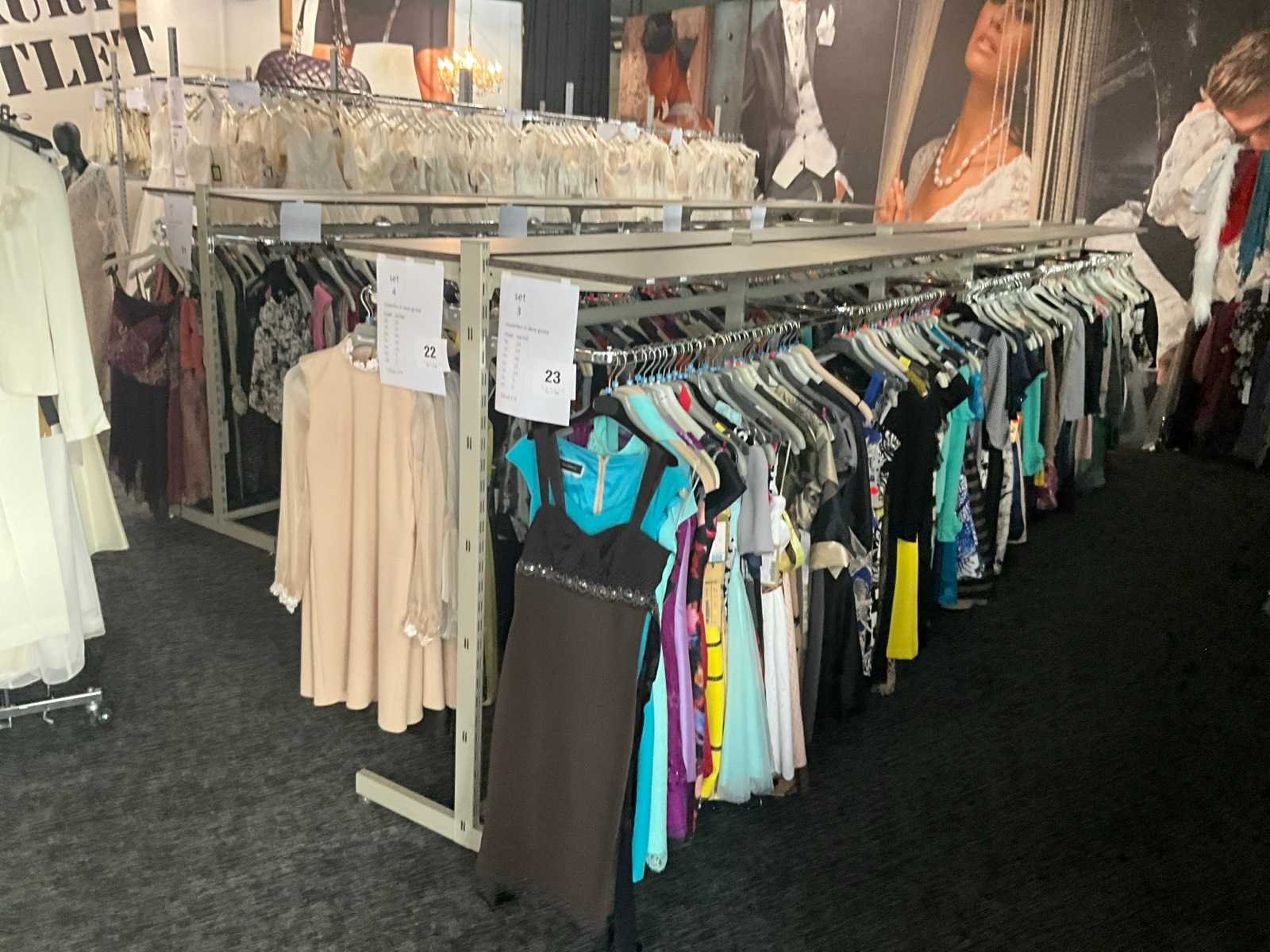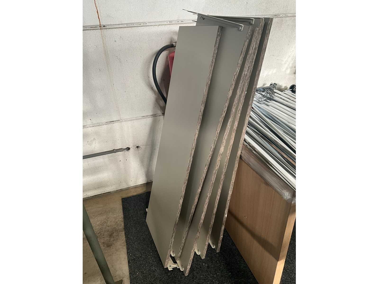 Modulaire metalen winkelrekken voorzien van rvs (in de hoogte) verstelbare dubbelzijdige hangsteunen. En telkens voorzien van houten legplanken bovenaan. Compleet met 18 staanders met bijhorende metalen baren (afstand tussen elke staander = ongeveer 128 cm, is de lengte van elke metalen tussensteun) en enige extra diverse gedemonteerde staanders en baren en legplanken in achterste ruimte. Zonder inhoud ! Lengte: 1920cm Breedte: 78cm Hoogte: 152cm