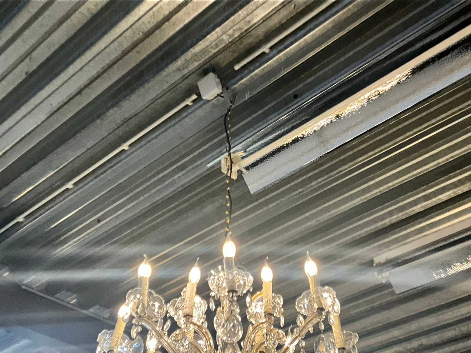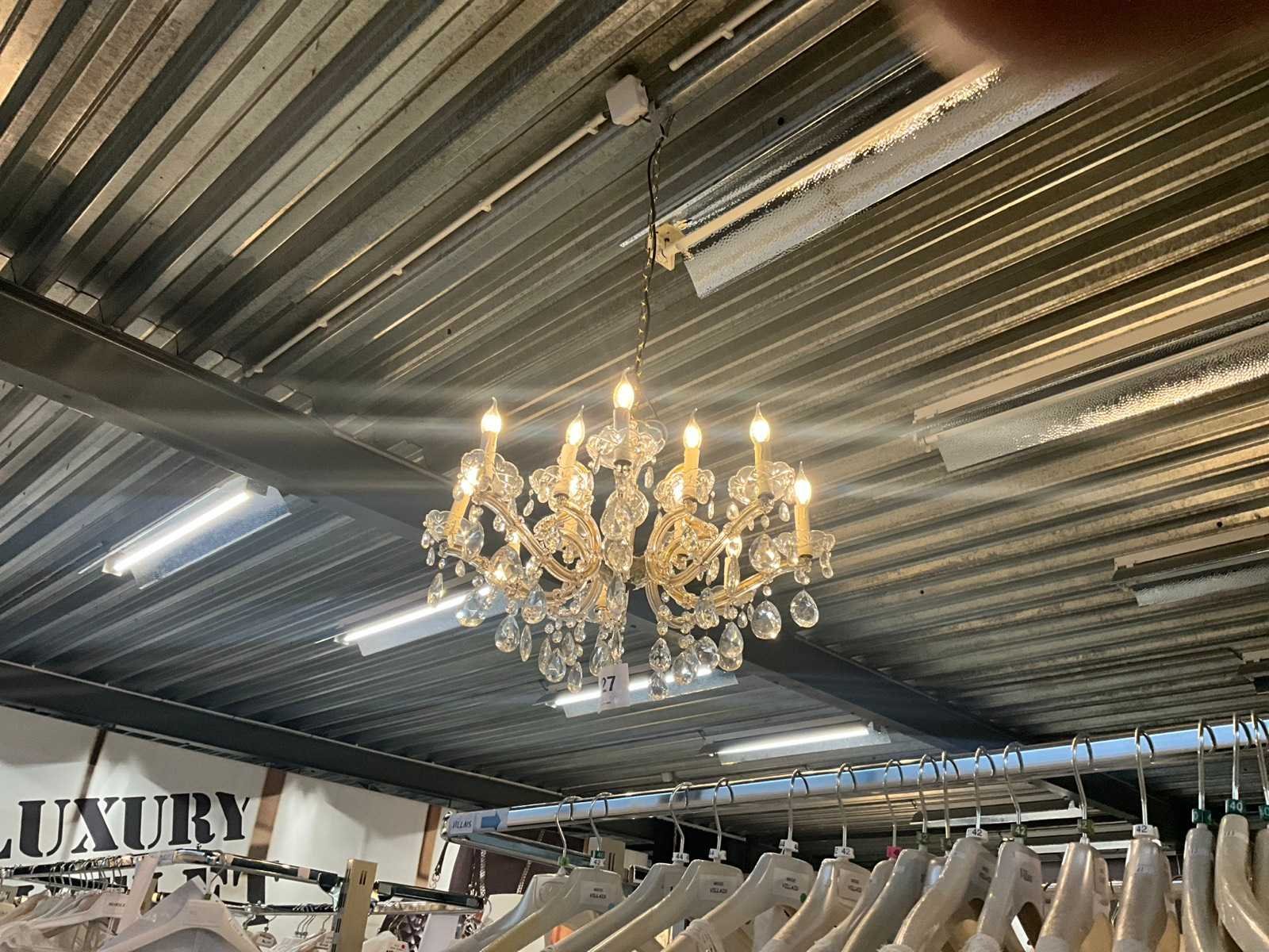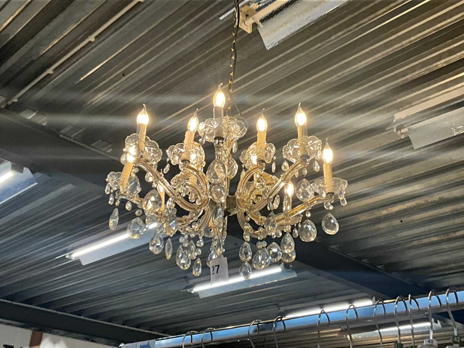 Door koper zelf te demonteren van plafond. Voorzien van 12 lichtpunten. Met ketting van circa 1 lpm (inkortbaar). (Op ongeveer 4 meter hoogte)
