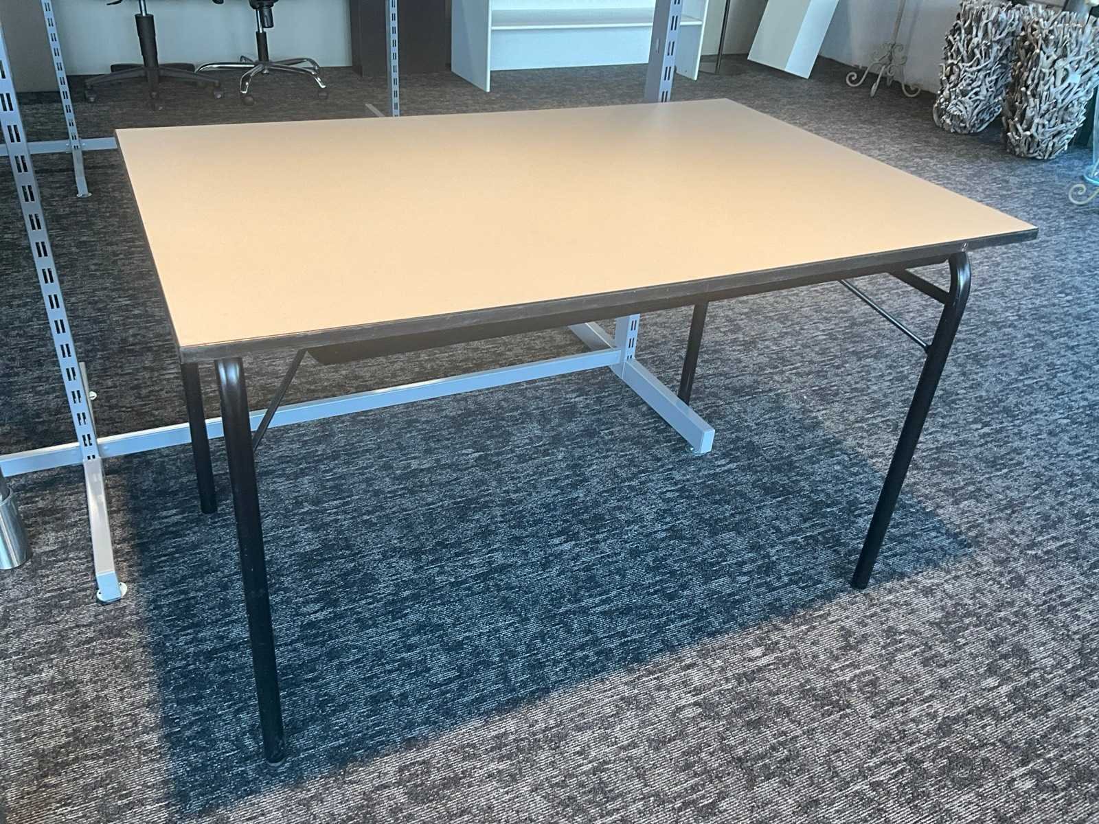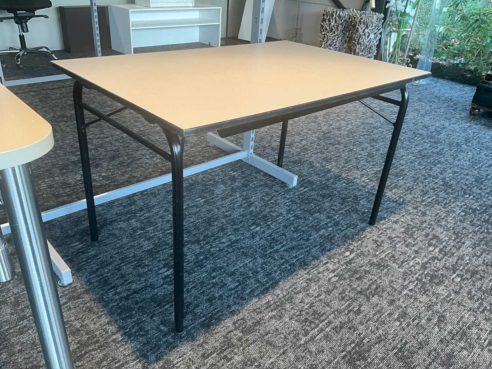 Op metalen onderstel en voorzien van formica houten bovenblad Lengte: 120cm Breedte: 80cm Hoogte: 74cm