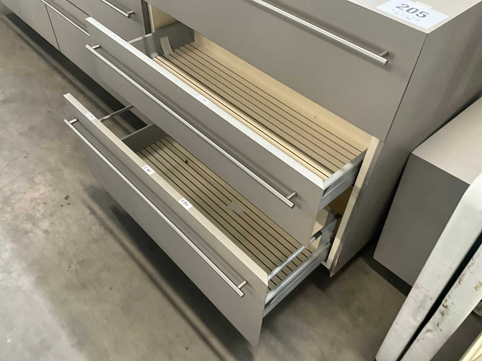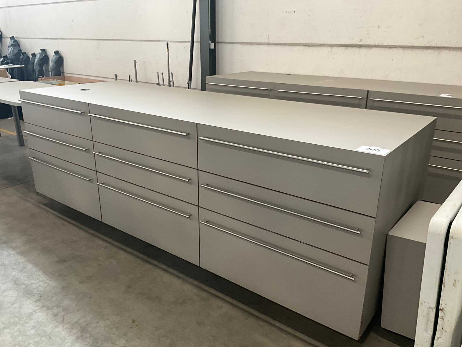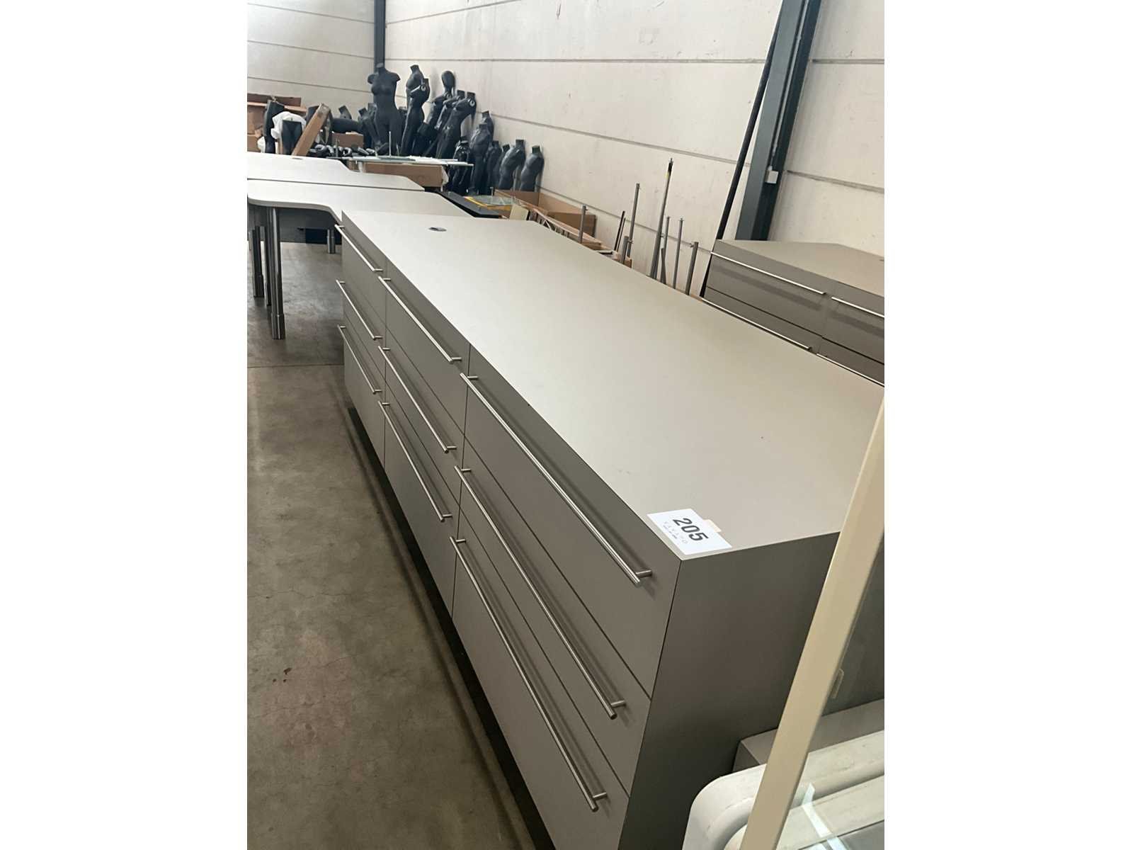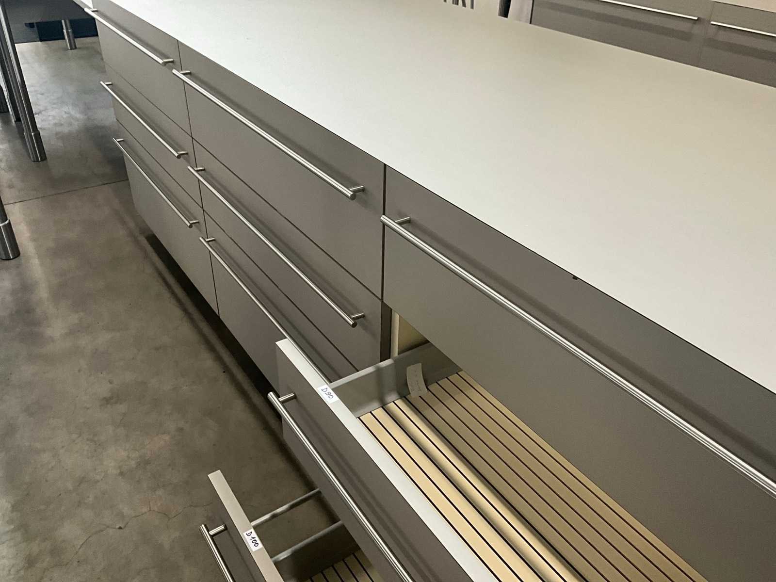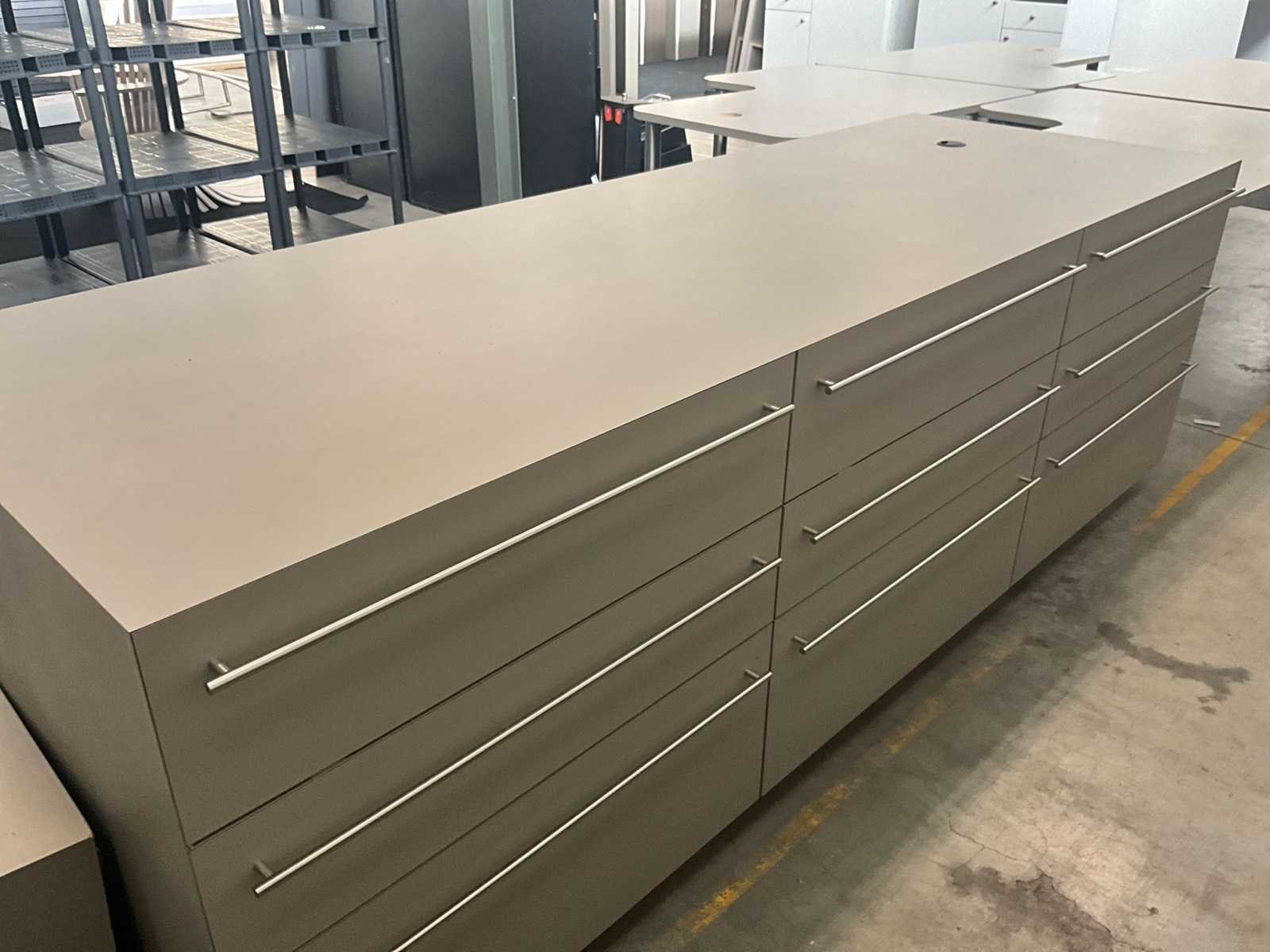 In fineerhouten uitvoering, voorzien van 18 laden, 9 langs elke lange zijde. Totale afmeting L: 2640mm Totale afmeting Breedte: 900mm Totale afmeting Hoogte: 900mm