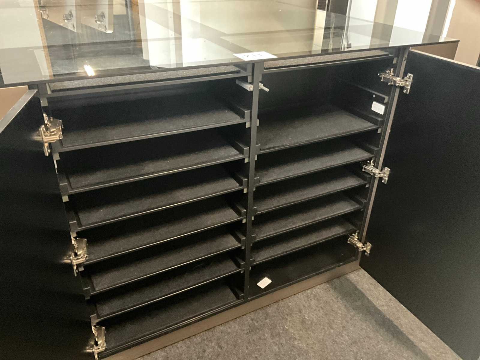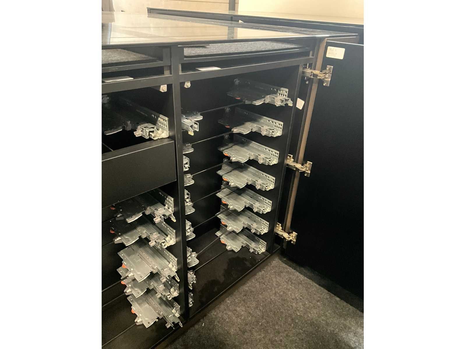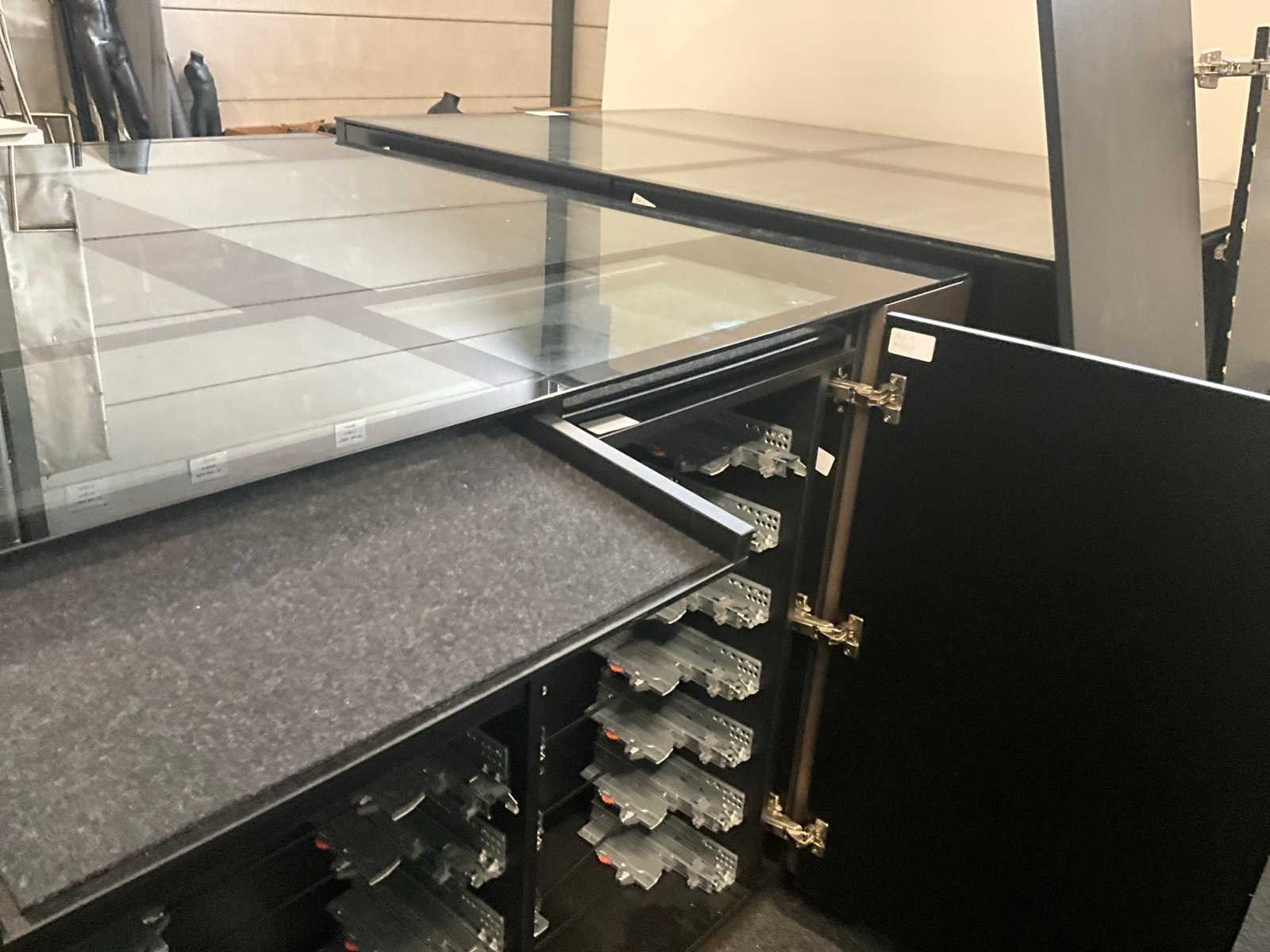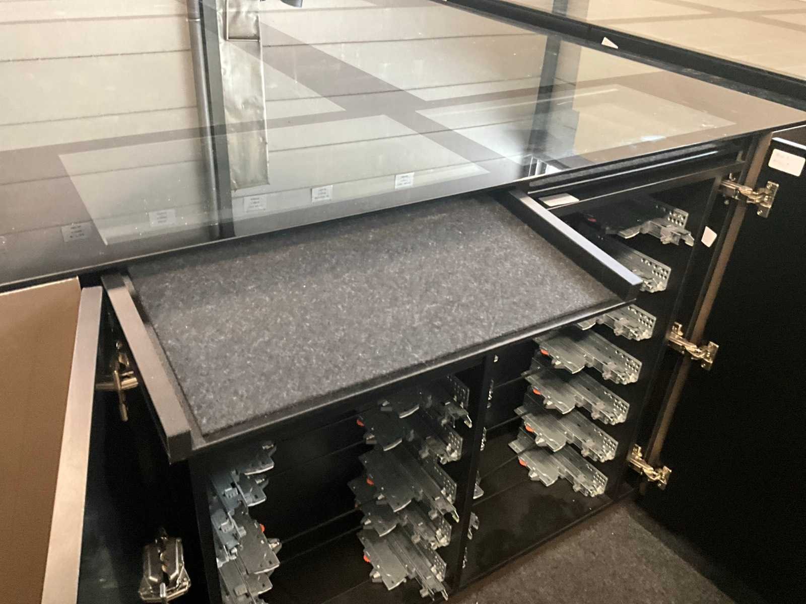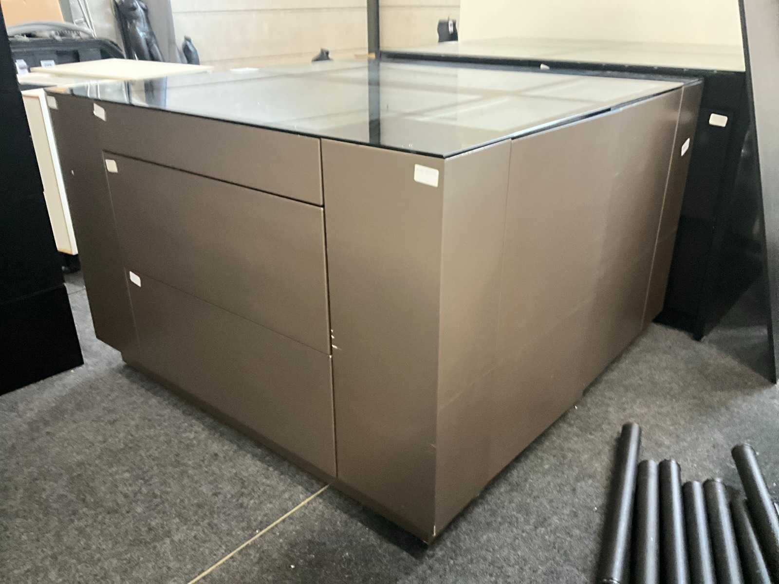 Langs 2 zijden voorzien van telkens 3 schuiven, waarvan bovenaan de 2 laden met glazen bovenblad en telkens 2 deuren langs de korte zijde. Met langs 2 van de 4 zijden ook telkens 2 uitschuifbare plateaus onder het glazen bovenblad. Aantal laden: 16 Totale afmeting L: 1680mm Totale afmeting Breedte: 1650mm Totale afmeting Hoogte: 1070mm