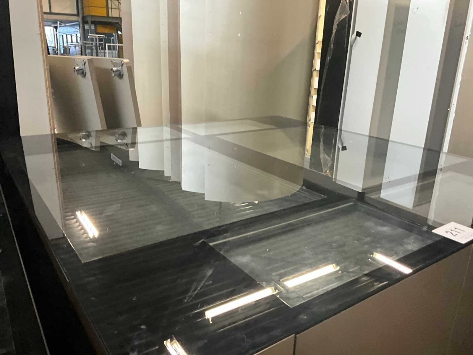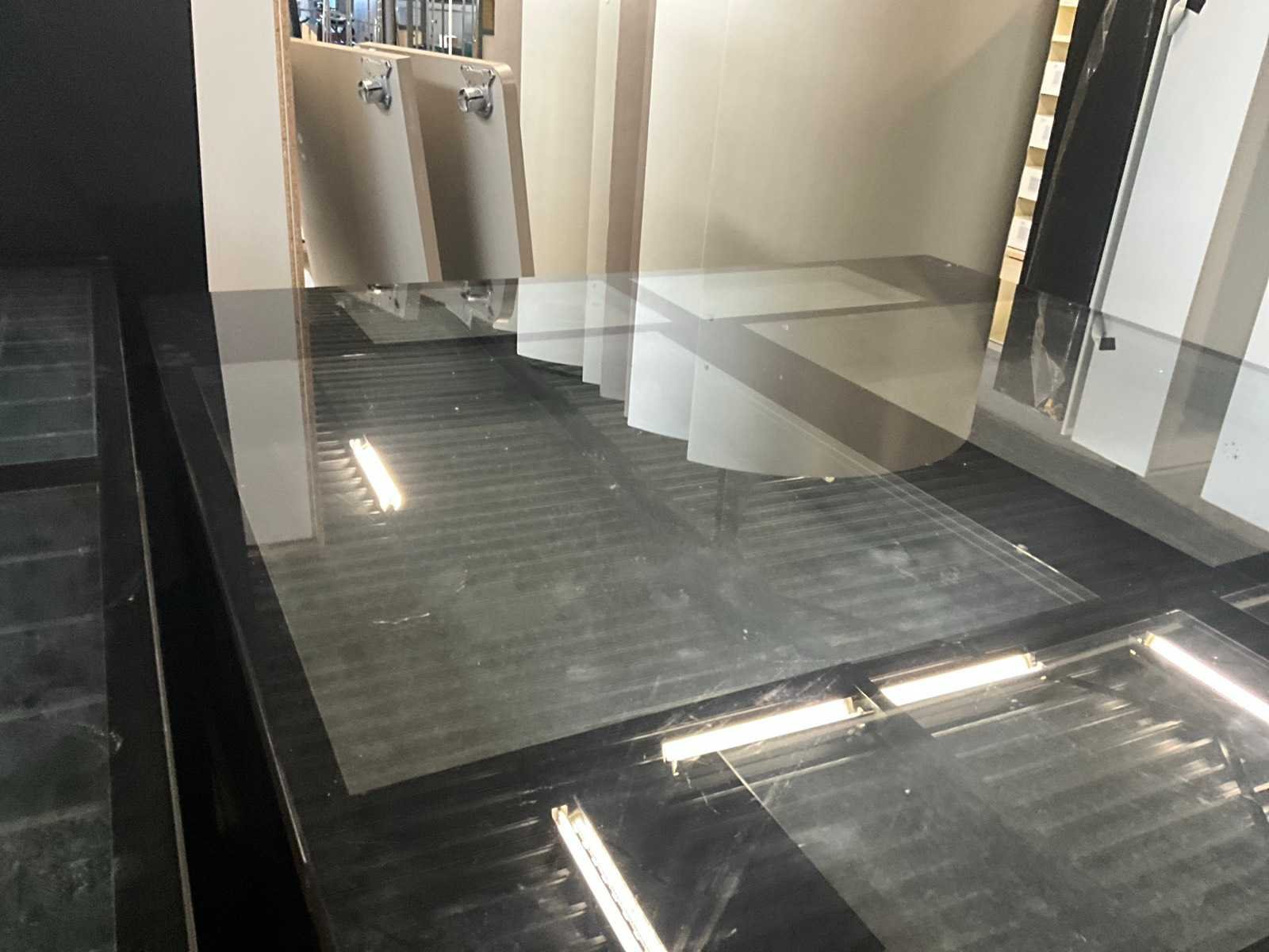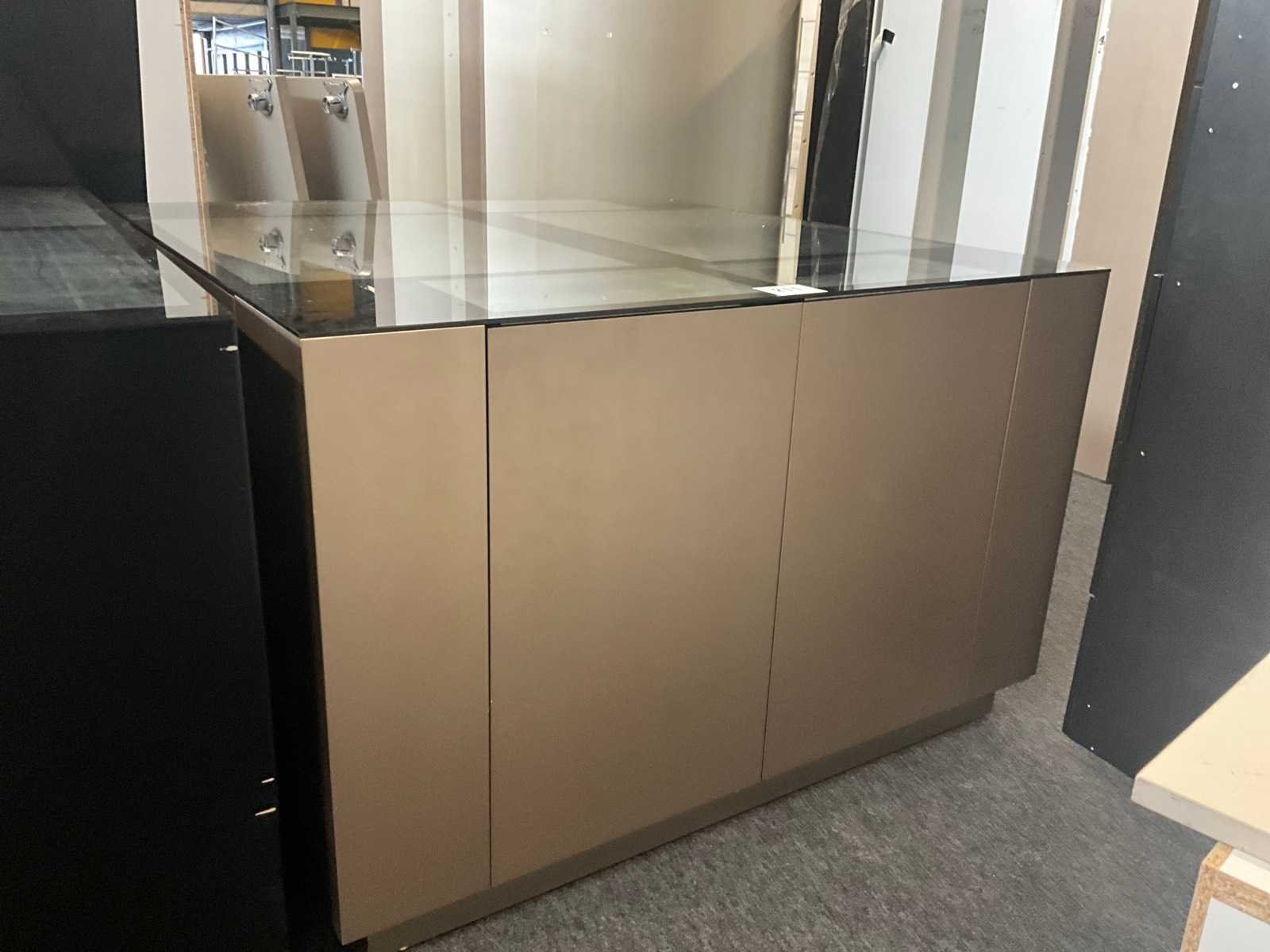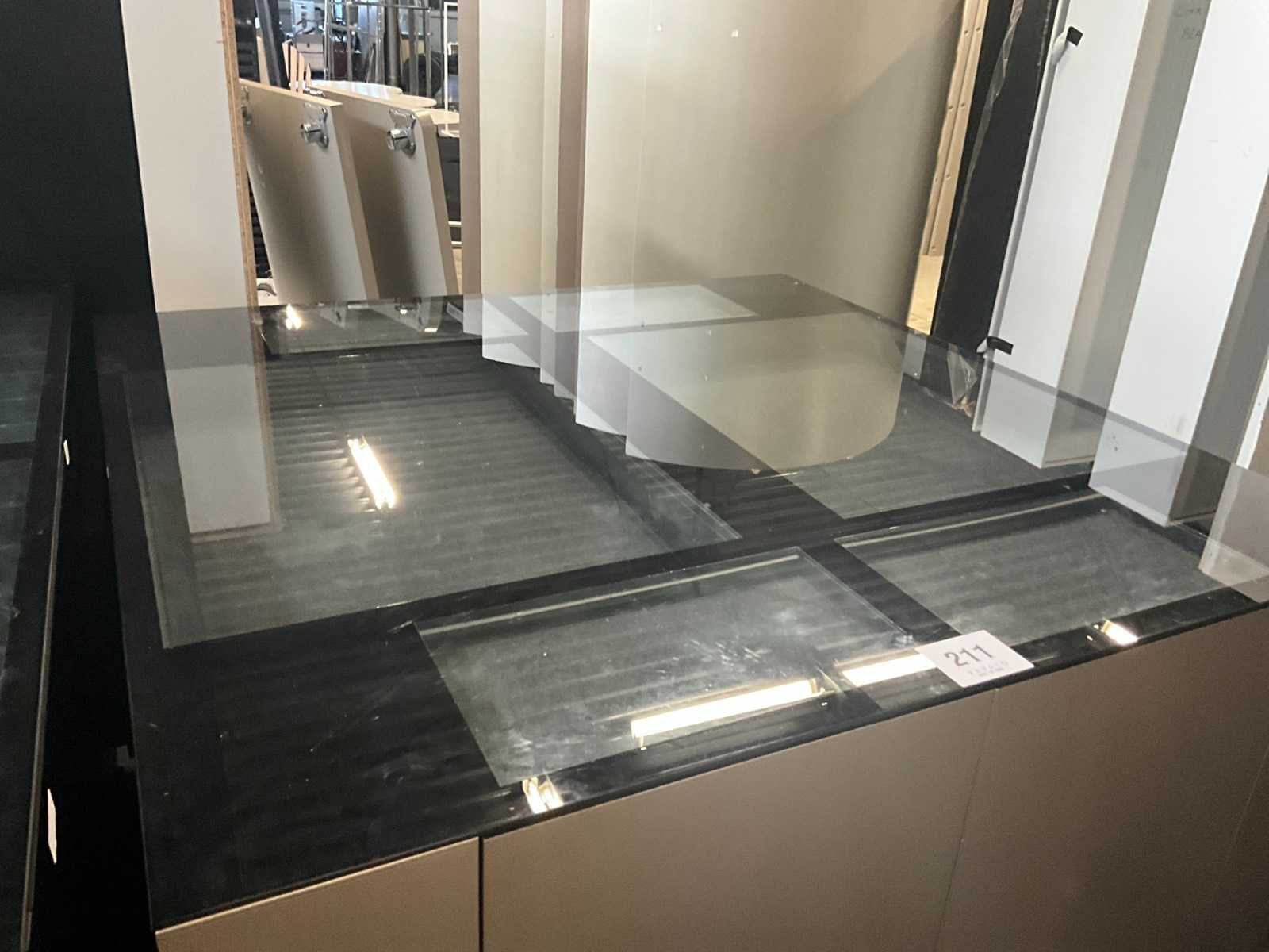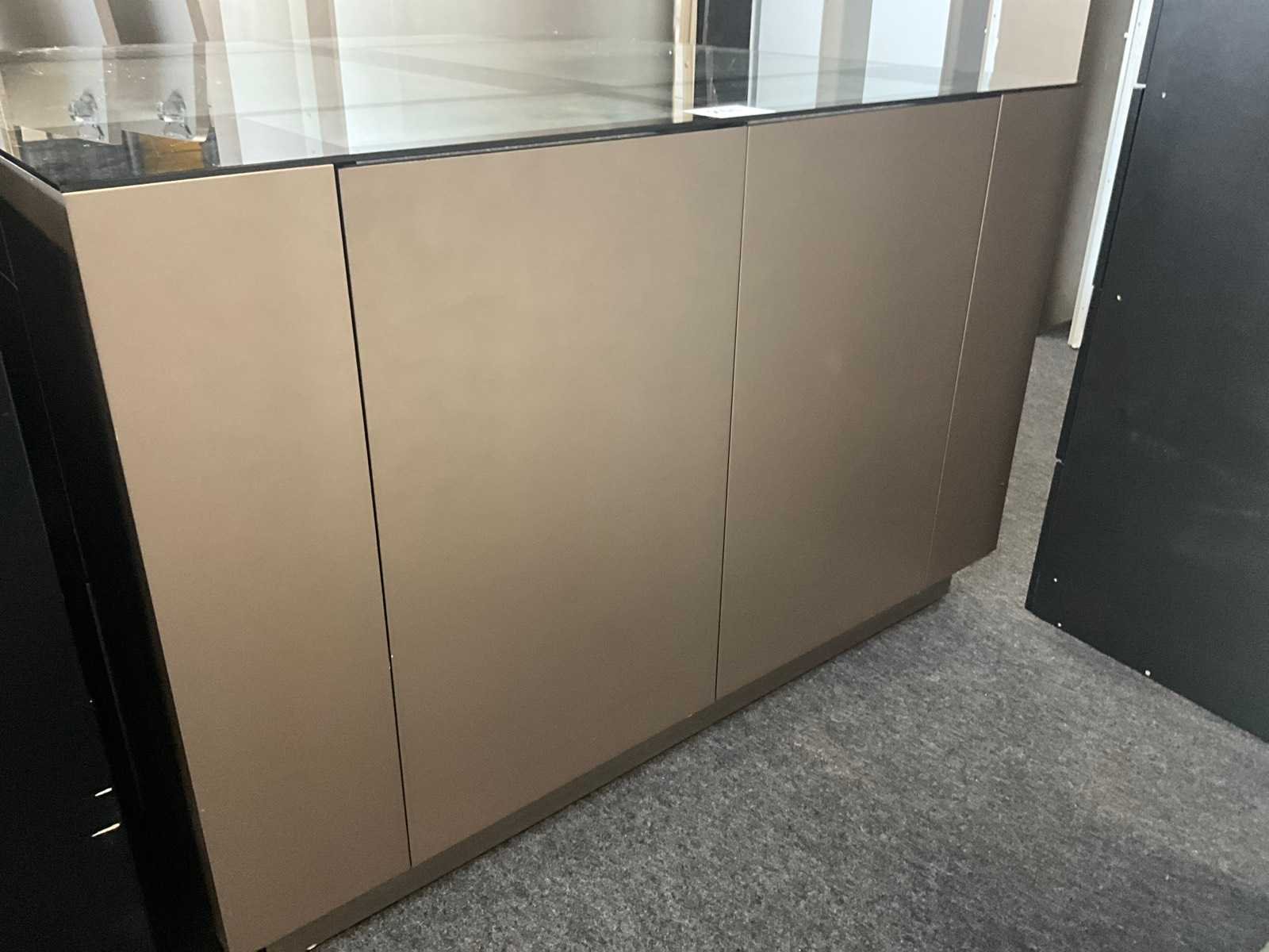 Langs 2 zijden voorzien van telkens 3 schuiven, waarvan bovenaan de 2 laden met glazen bovenblad en telkens 2 deuren langs de korte zijde. Met langs 2 van de 4 zijden ook telkens 2 uitschuifbare plateaus onder het glazen bovenblad. Aantal laden: 16 Totale afmeting L: 1680mm Totale afmeting Breedte: 1650mm Totale afmeting Hoogte: 1070mm