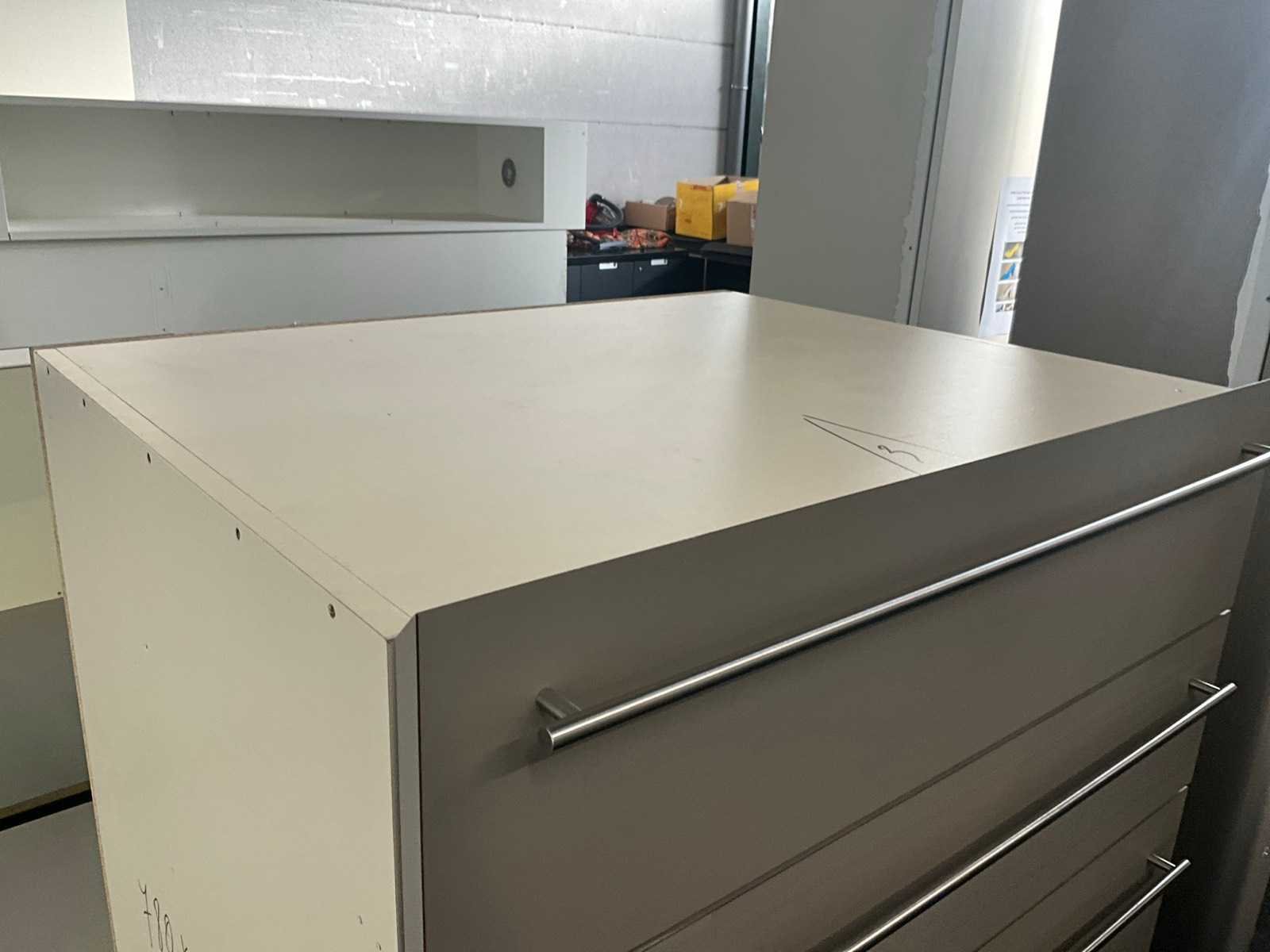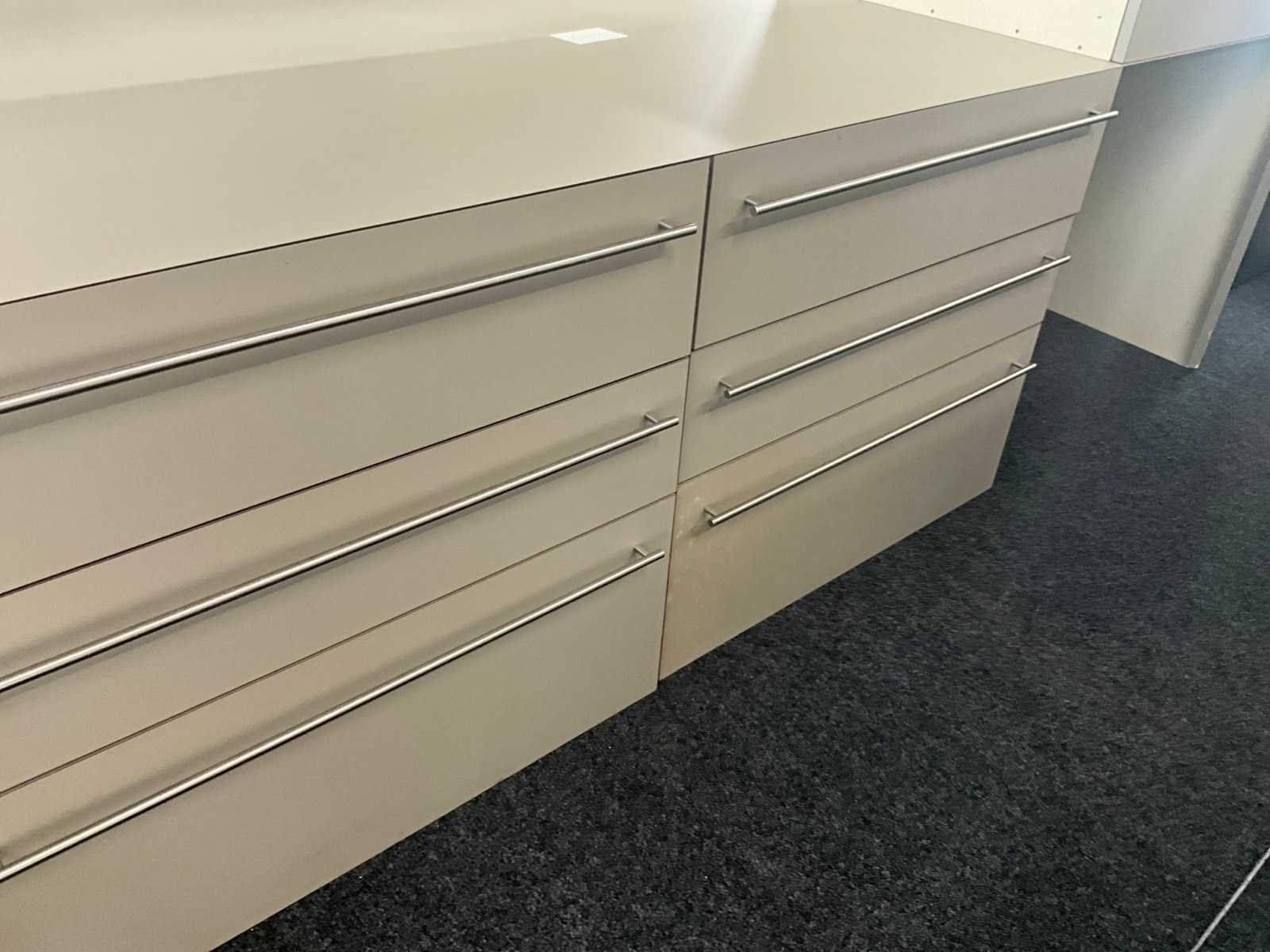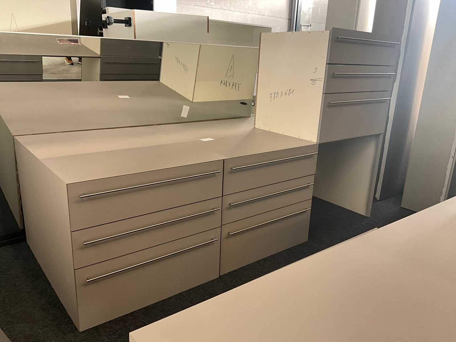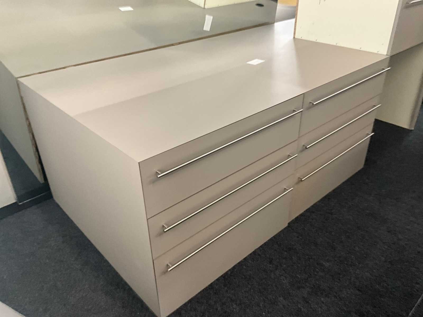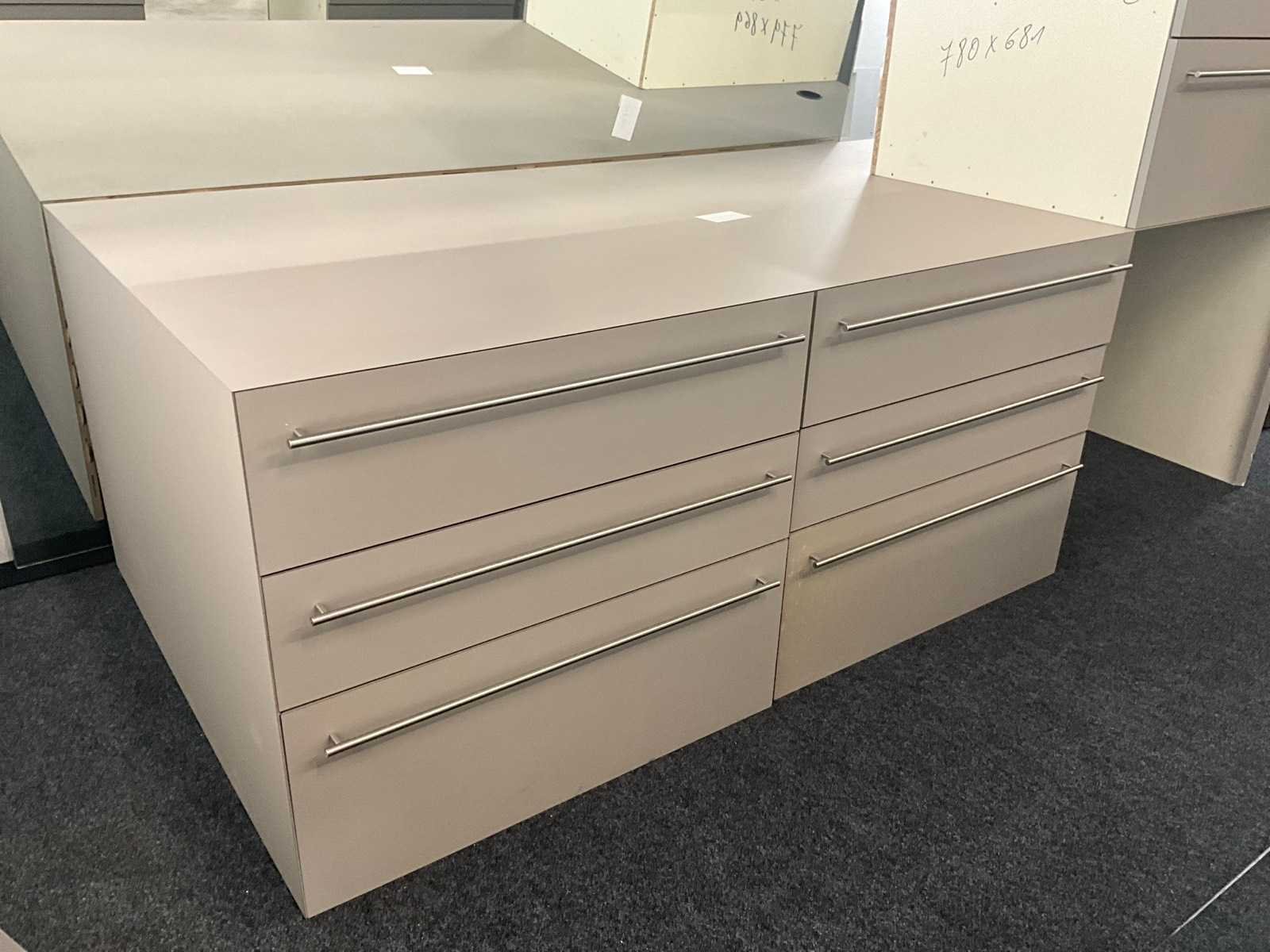 In fineerhouten uitvoering, voorzien van 9 laden langs voorzijde. Met verkorte schuiven van 70 cm diepte. Verdeeld in 3 blokken met telkens 3 schuiven, los van elkaar en modulair met meubel. Totale afmeting L: 2670mm Totale afmeting Breedte: 1200mm Totale afmeting Hoogte: 800mm