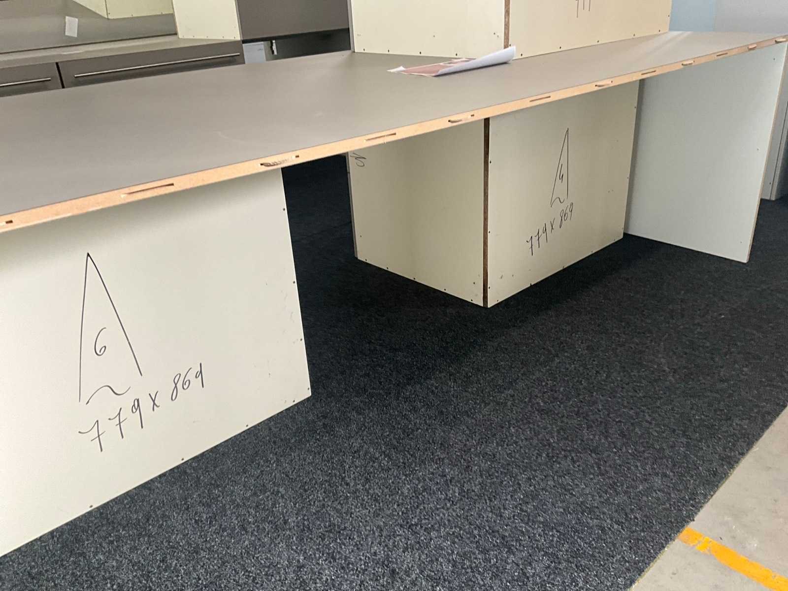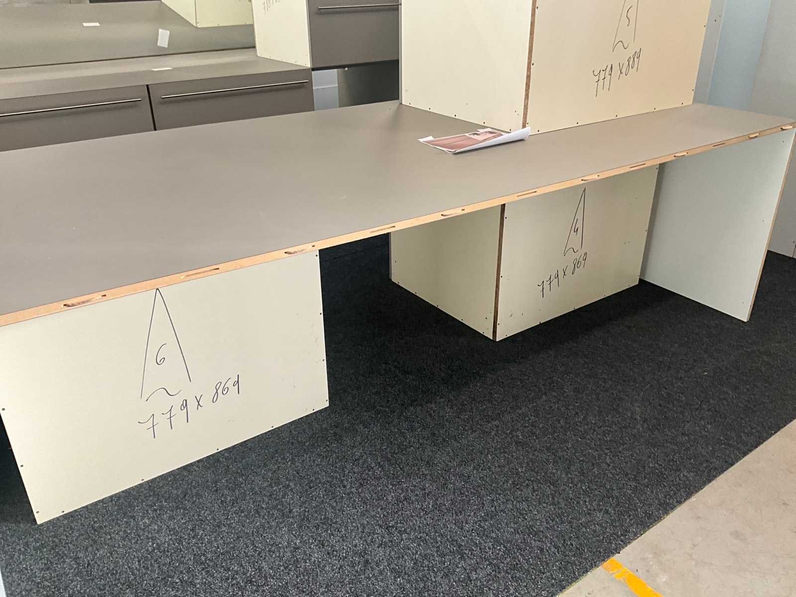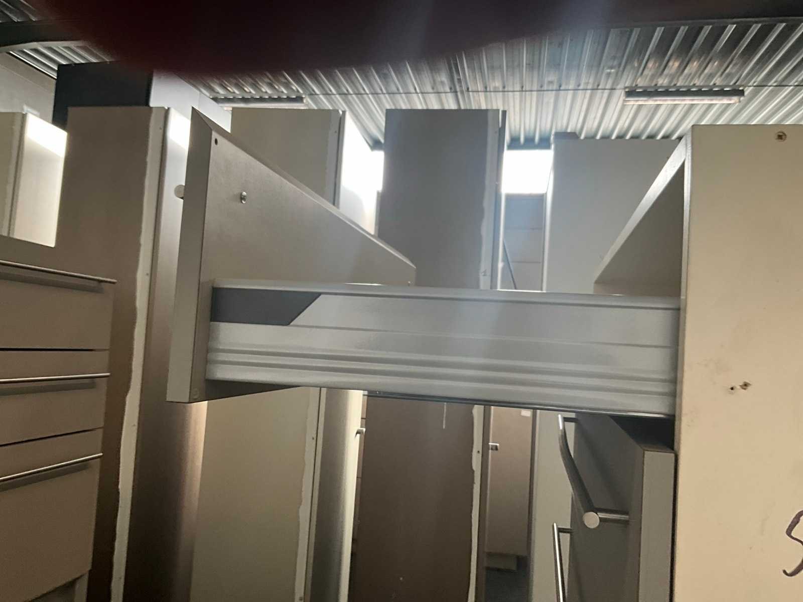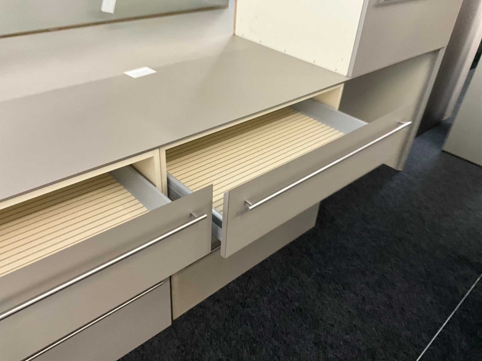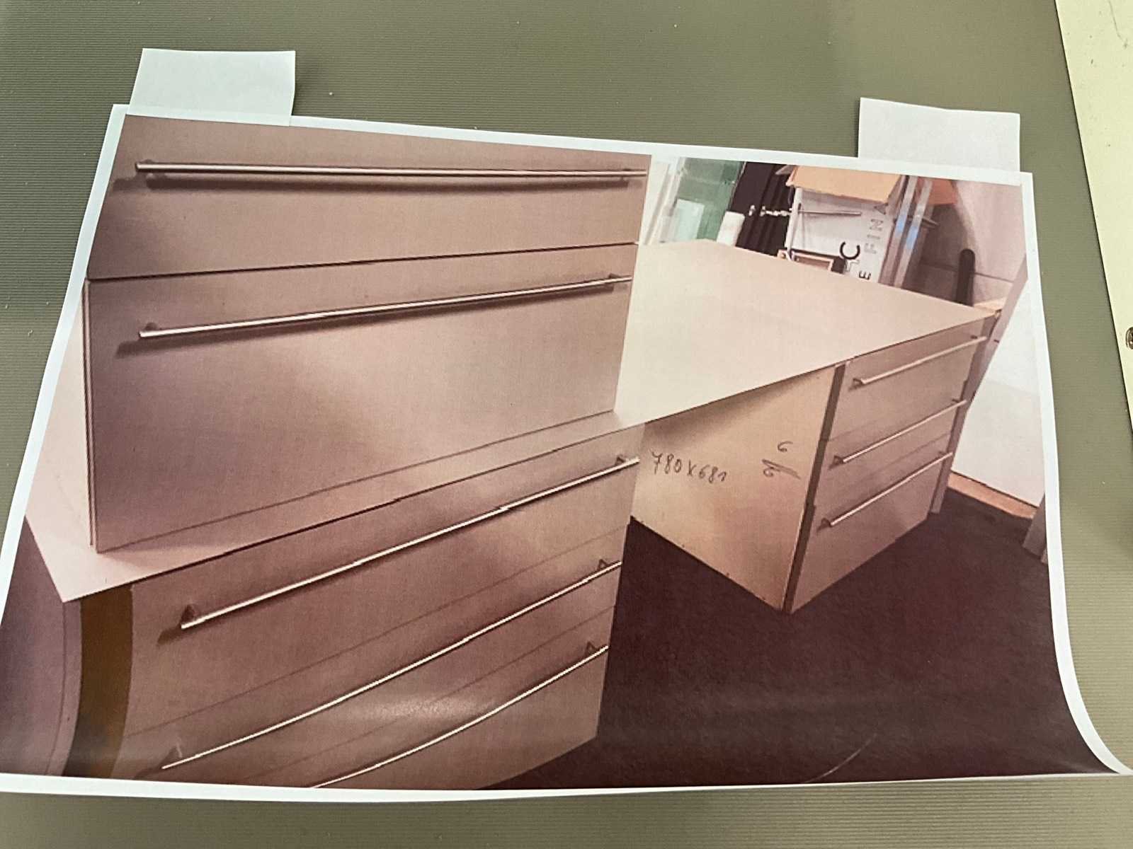 In fineerhouten uitvoering, voorzien van 9 laden langs voorzijde. Met verkorte schuiven van 70 cm diepte. Verdeeld in 3 blokken met telkens 3 schuiven, los van elkaar en modulair met meubel. Totale afmeting L: 2670mm Totale afmeting Breedte: 1200mm Totale afmeting Hoogte: 800mm