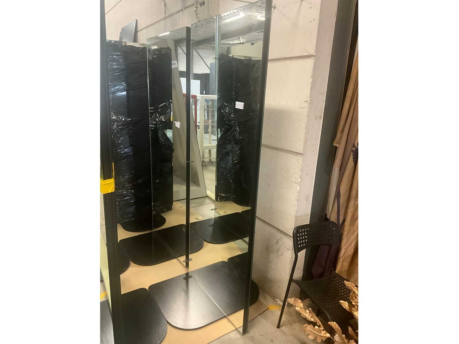 Foto indicatief. Afmetingen voet : 80 x 60 cm. Langs beide zijden voorzien van spiegel en bestaande uit 2 spiegelpanelen, 1x 80 en 1x 60 cm breed, waarvan smal paneel roteerbaar is. Afmeting b: 800mm Totale afmeting Breedte: 1400mm Totale afmeting Hoogte: 2000mm