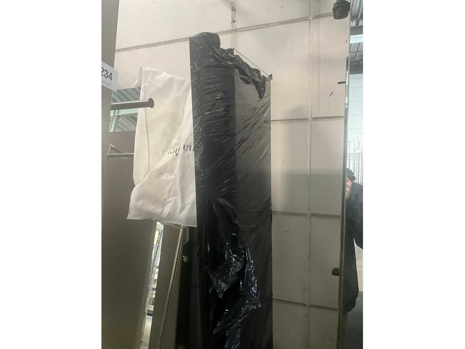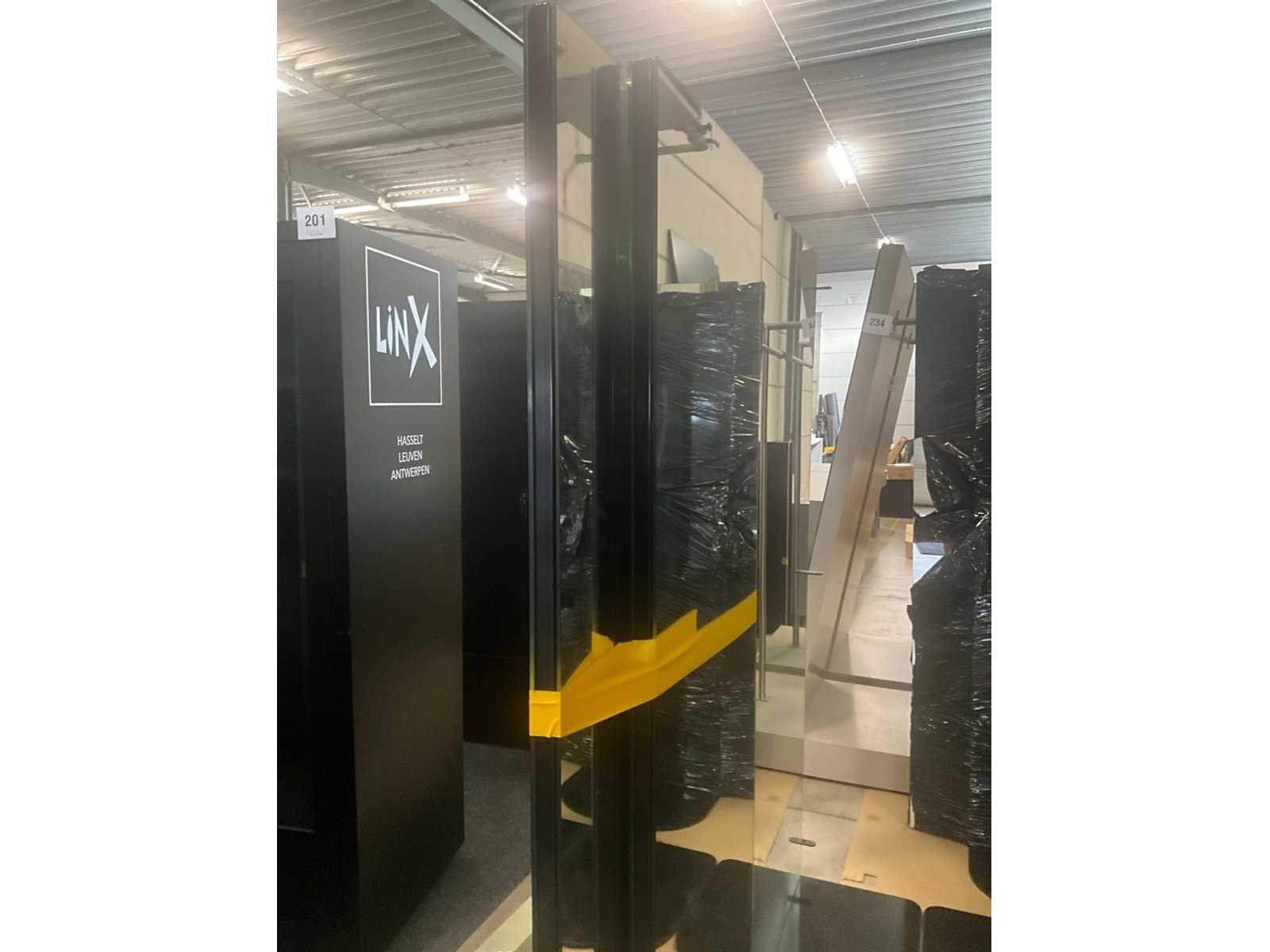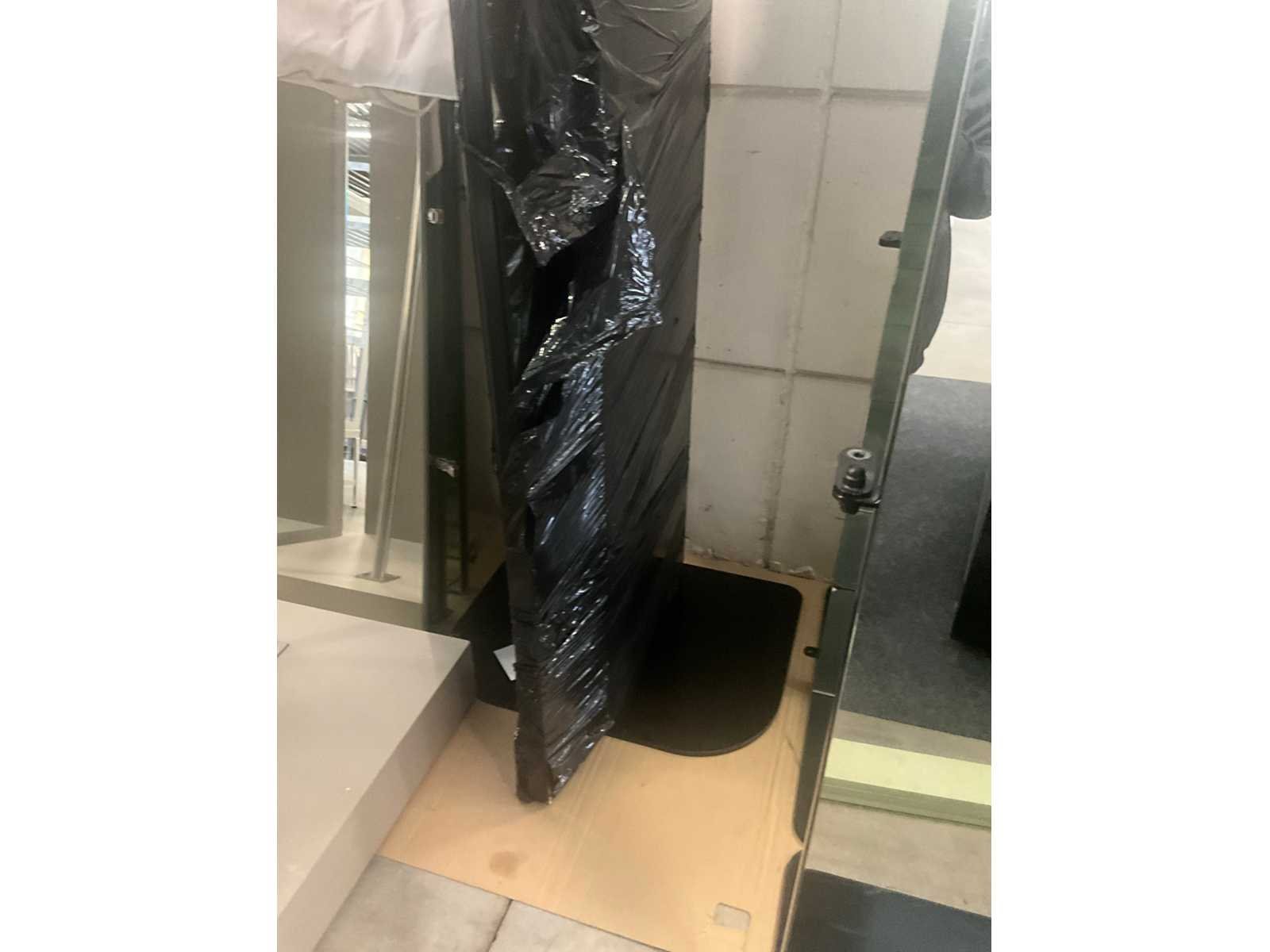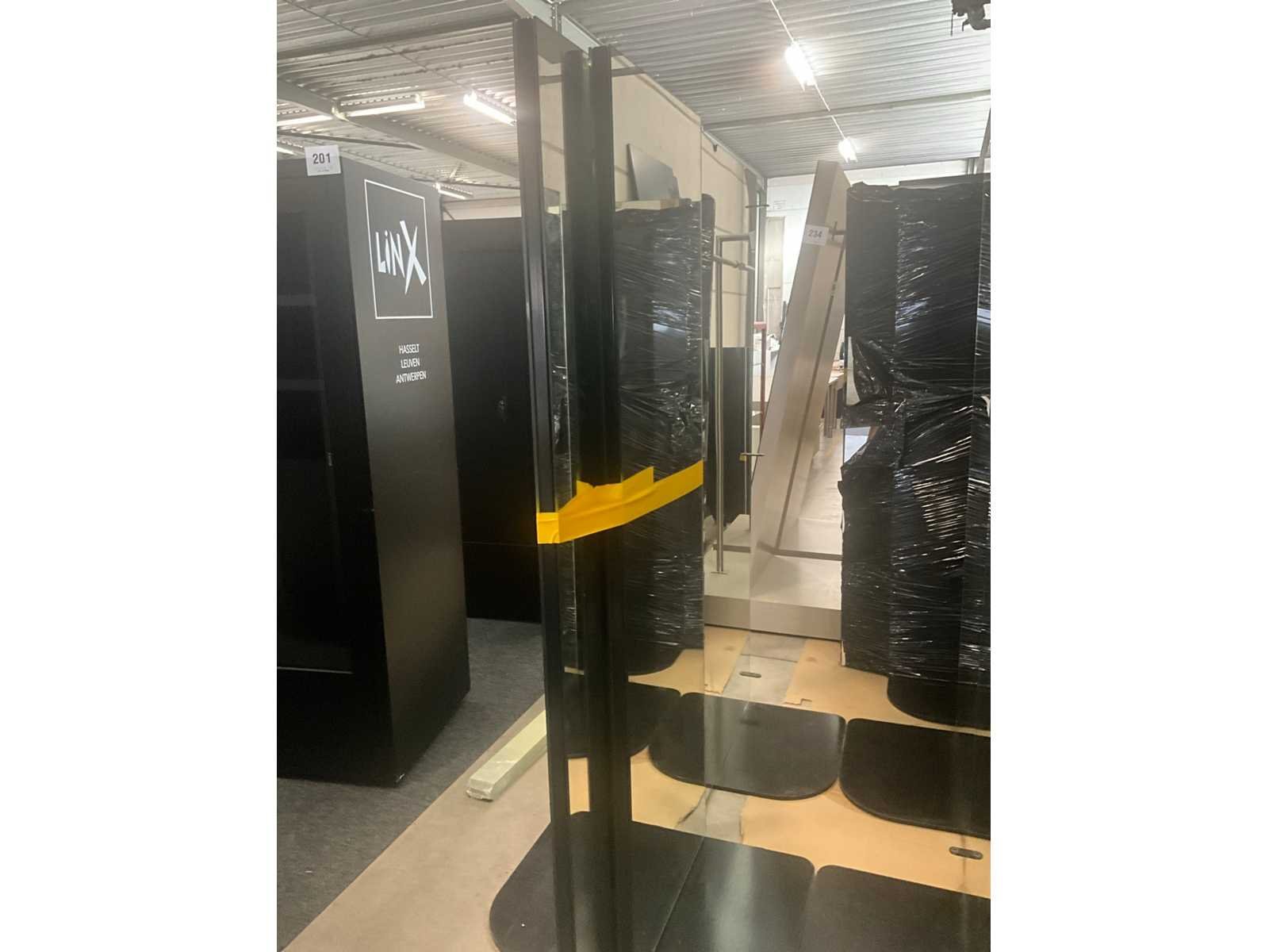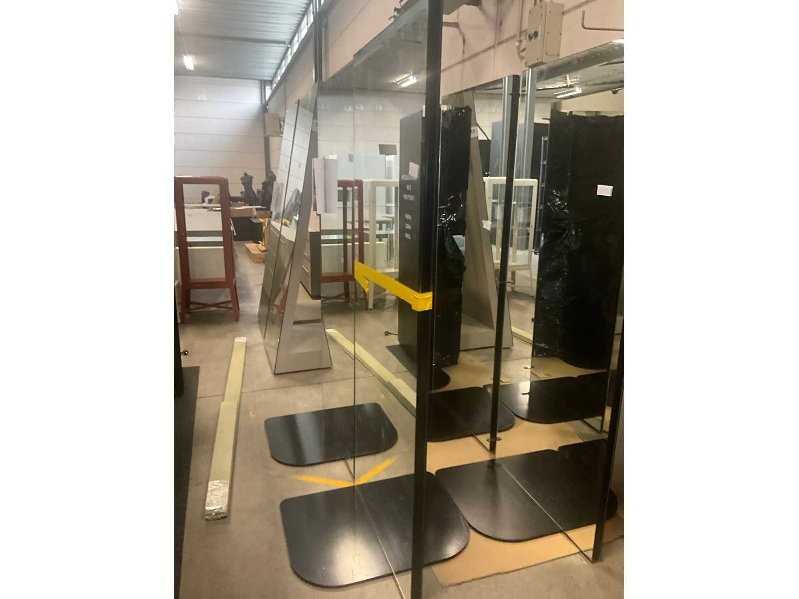 Foto indicatief. Afmetingen voet : 80 x 60 cm. Langs beide zijden voorzien van spiegel en bestaande uit 2 spiegelpanelen, 1x 80 en 1x 60 cm breed, waarvan smal paneel roteerbaar is. Dit exemplaar is met zwarte folie errond. Afmeting b: 800mm Totale afmeting Breedte: 1400mm Totale afmeting Hoogte: 2000mm