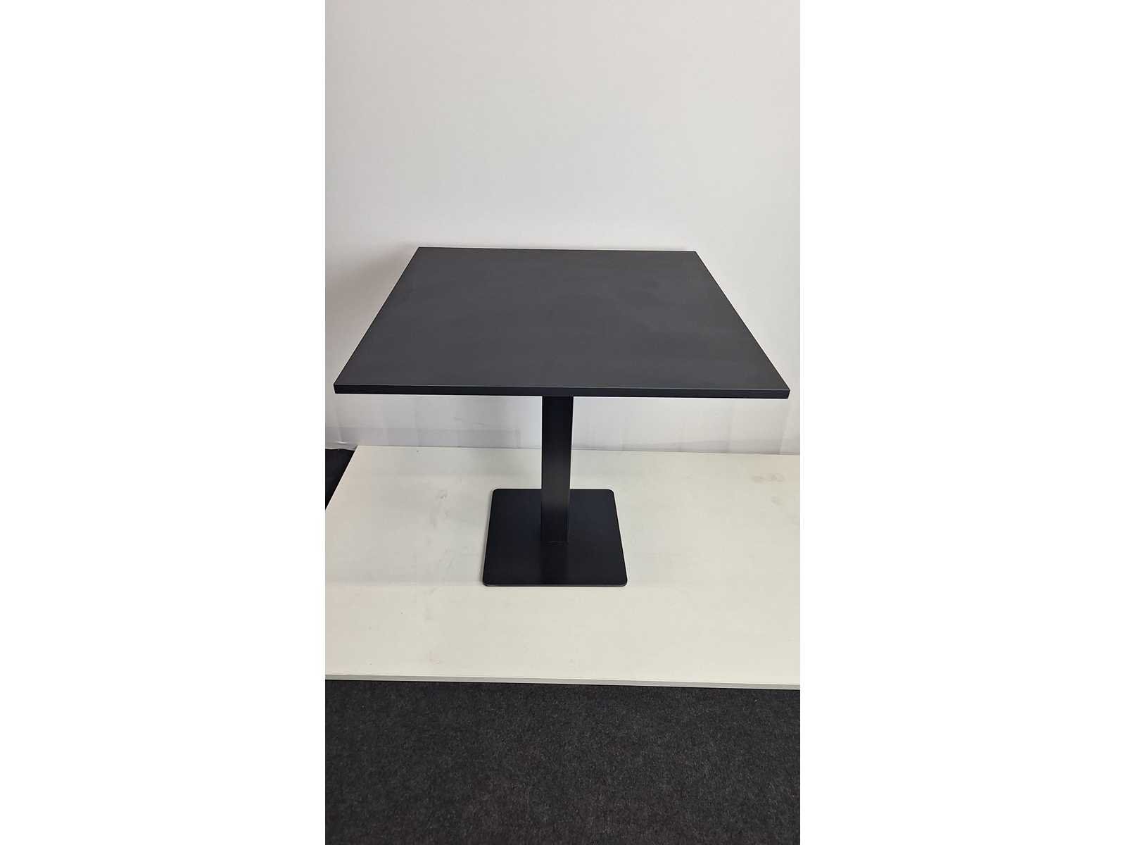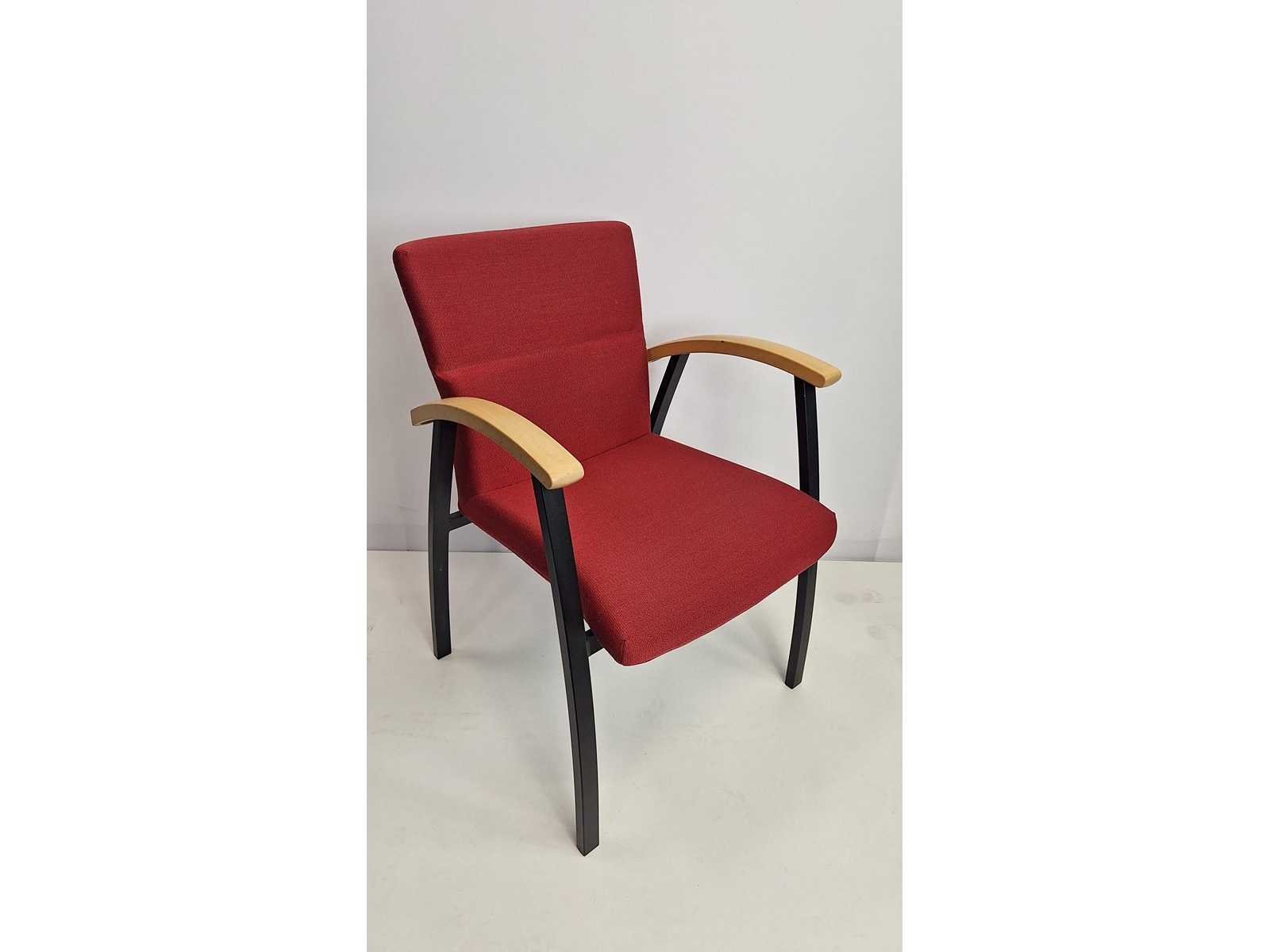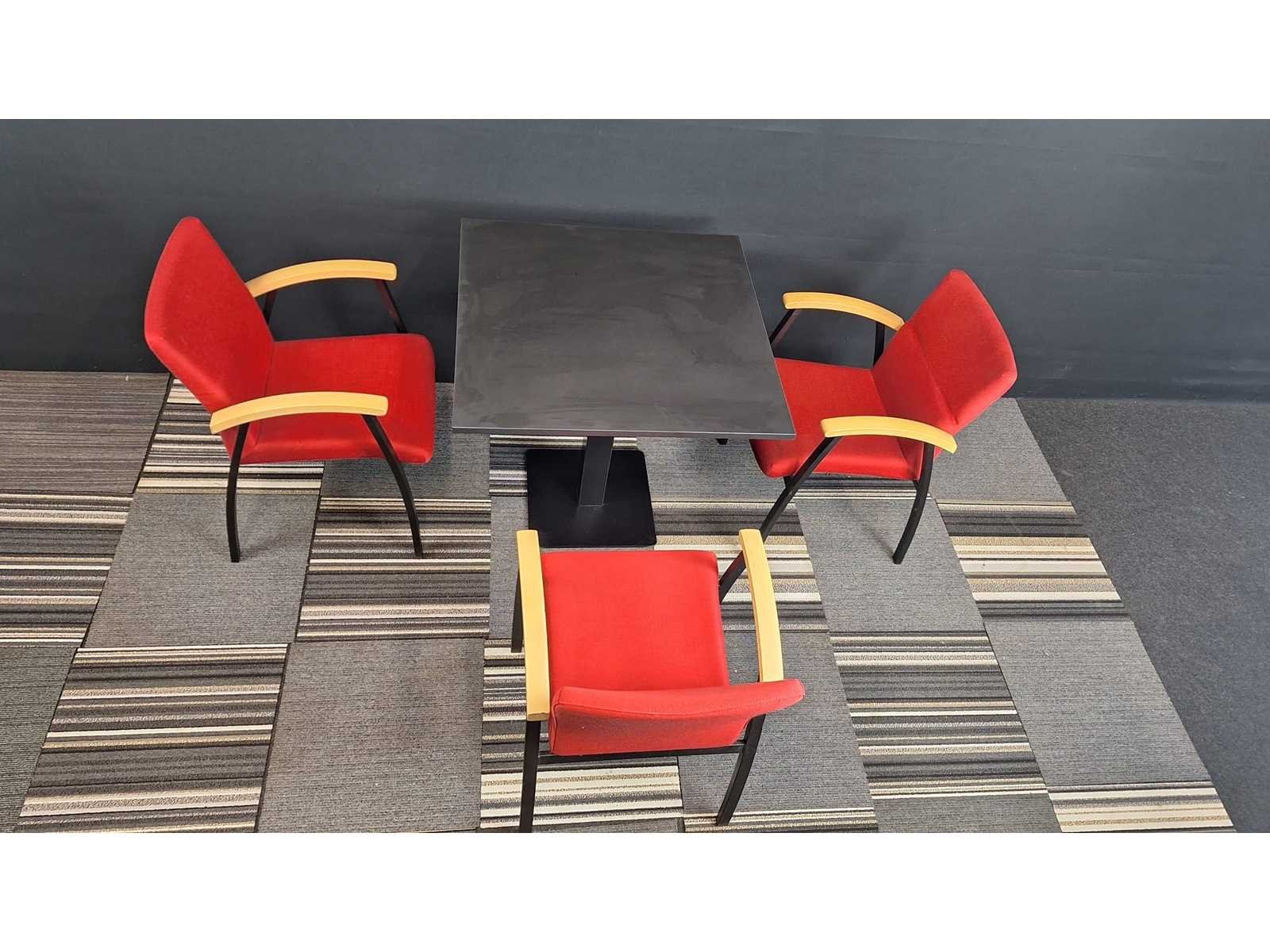 Vergadertafel BENE 800 x 800 x 780 mm, centrale voet in metaal kleur Zwart, blad in melamine kleur Zwart + 3 stuks bezoekersstoelen Kinnarps vierpoots onderstel in metaal kleur Zwart, bekleding in stof kleur Rood, armleuningen in natuurlijk hout, goede staat Merk: Kinnarps Kleur: Zwart - Rood Gewicht: 100kg