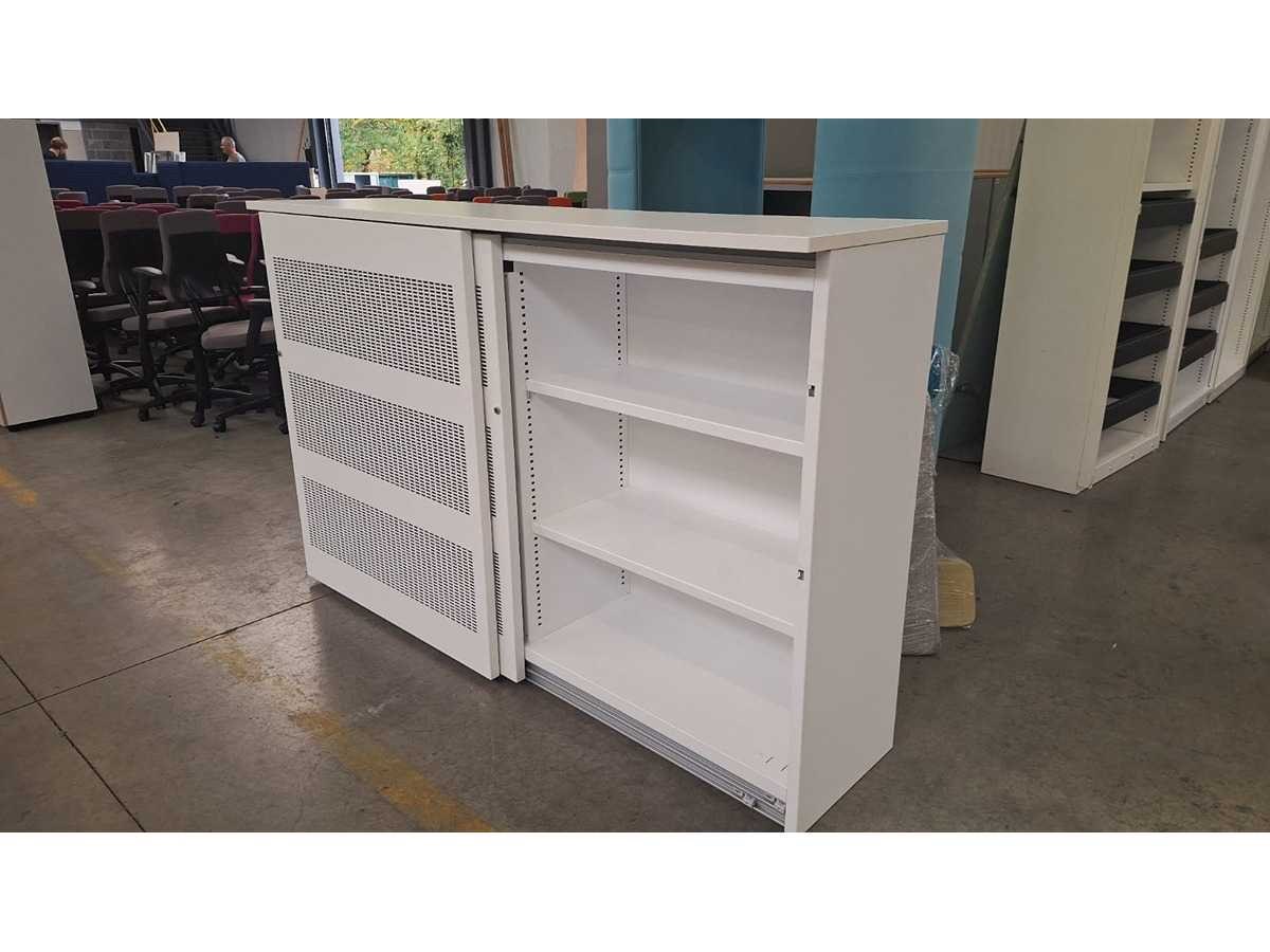 Kast volledig in metaal kleur Wit, schuifdeuren in metaal kleur Wit voorzien van akoestische vulling, beide zijdes voorzien van 2 legplanken in metaal kleur Wit, technisch in orde maar gebruikssporen aanwezig en sleutels ontbreken Merk: Robberechts Kleur: Wit Gewicht: 150kg Breedte: 200cm Hoogte: 125cm Materiaal: Metaal, aluminium, kunststof Diepte: 50cm