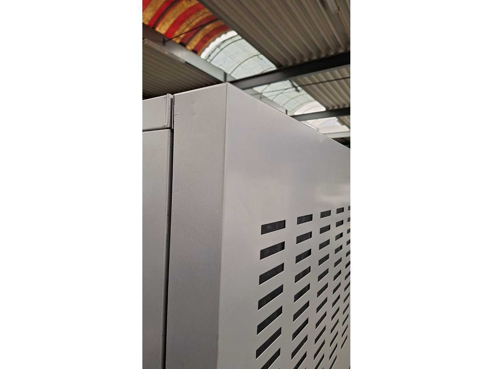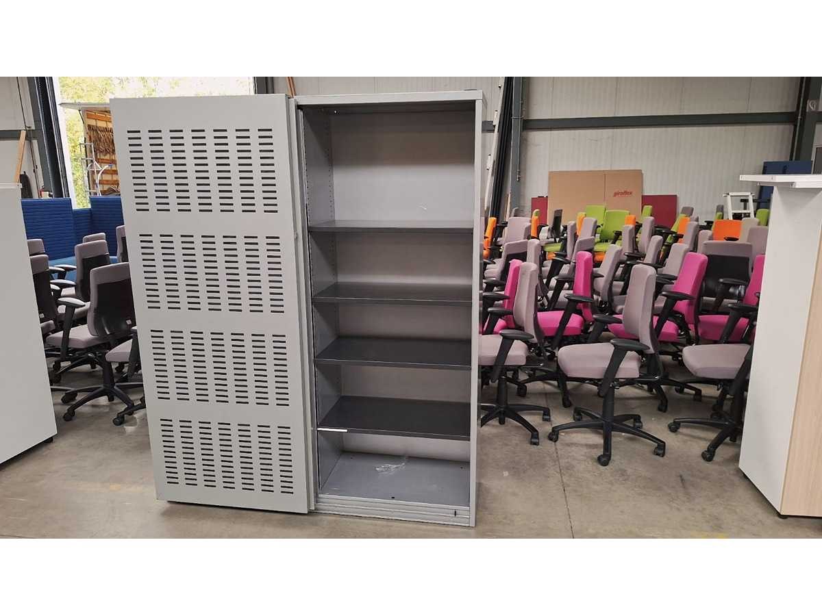 Kast volledig in metaal kleur Alu, schuifdeuren in metaal kleur Alu voorzien van akoestische vulling, beide zijdes voorzien van 4 legplanken in metaal kleur Zwart, technisch in orde maar gebruikssporen aanwezig en sleutels ontbreken Merk: Robberechts Kleur: Alu Gewicht: 150kg Breedte: 160cm Hoogte: 197cm Materiaal: Metaal, aluminium, kunststof Diepte: 50cm