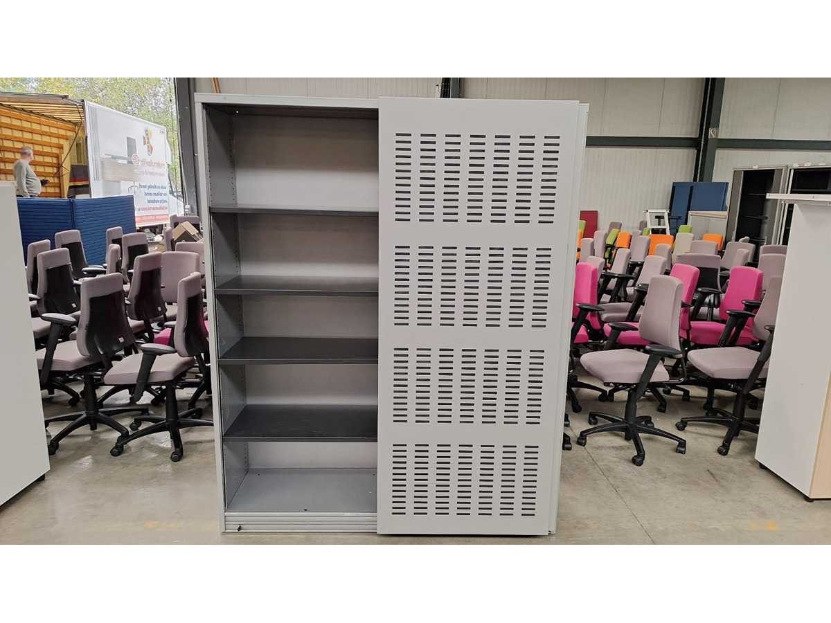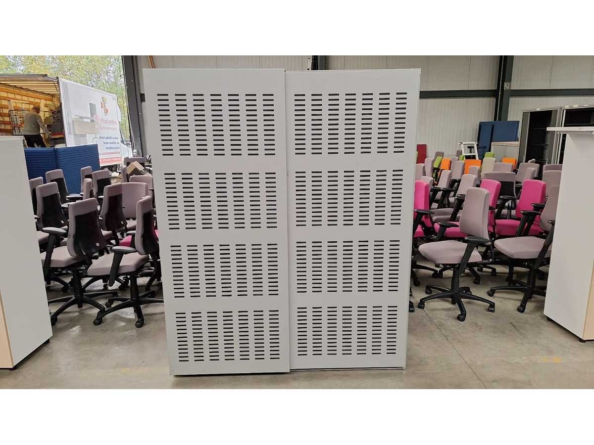 Kast volledig in metaal kleur Alu, schuifdeuren in metaal kleur Alu voorzien van akoestische vulling, beide zijdes voorzien van 4 legplanken in metaal kleur Zwart, technisch in orde maar gebruikssporen aanwezig en sleutels ontbreken Merk: Robberechts Kleur: Alu Gewicht: 150kg Breedte: 160cm Hoogte: 197cm Materiaal: Metaal, aluminium, kunststof Diepte: 50cm