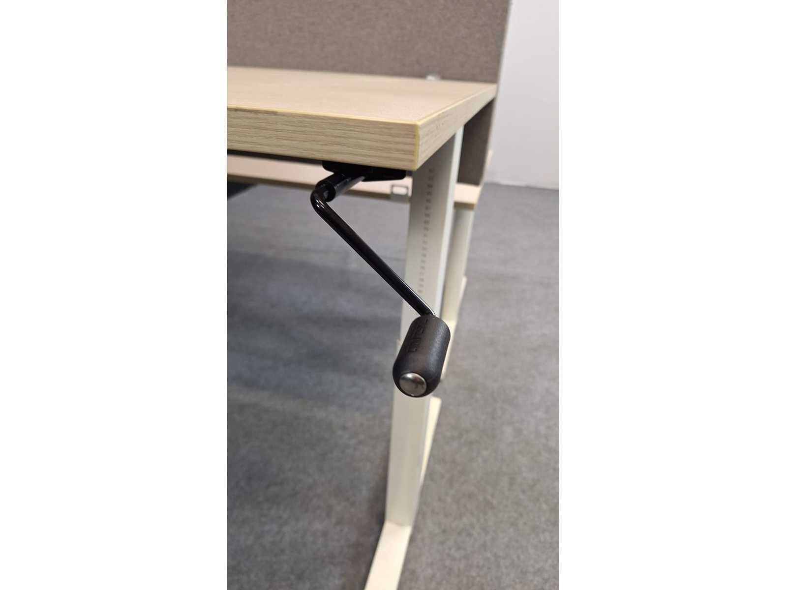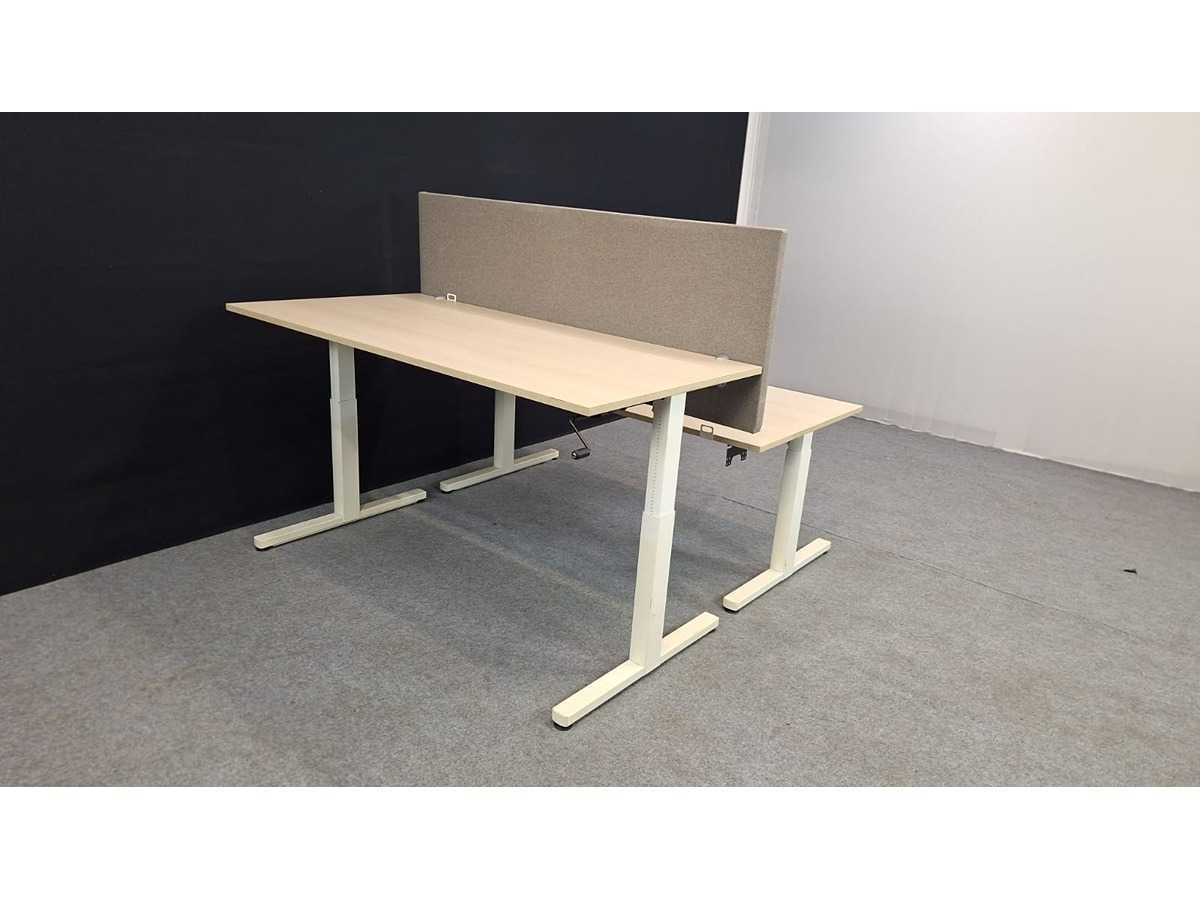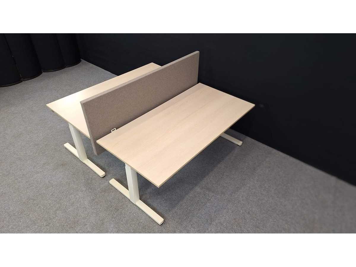 Dubbele werkplaats bestaande uit twee met zwengel in hoogte verstelbare (620 - 900 mm) bureaus, onderstel in metaal kleur Wit, bladen in melamine kleur Lichte Eik, akoestische wand bekleed met stof kleur Beige/Grijs, in goede staat Merk: GDB Kleur: Wit-Lichte Eik Gewicht: 120kg Lengte: 160cm Breedte: 165cm Hoogte: 62-90cm Materiaal: Metaal, aluminium, kunststof, hout, melamine, stof Diepte: 80cm