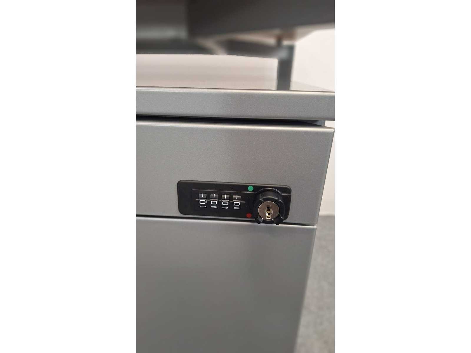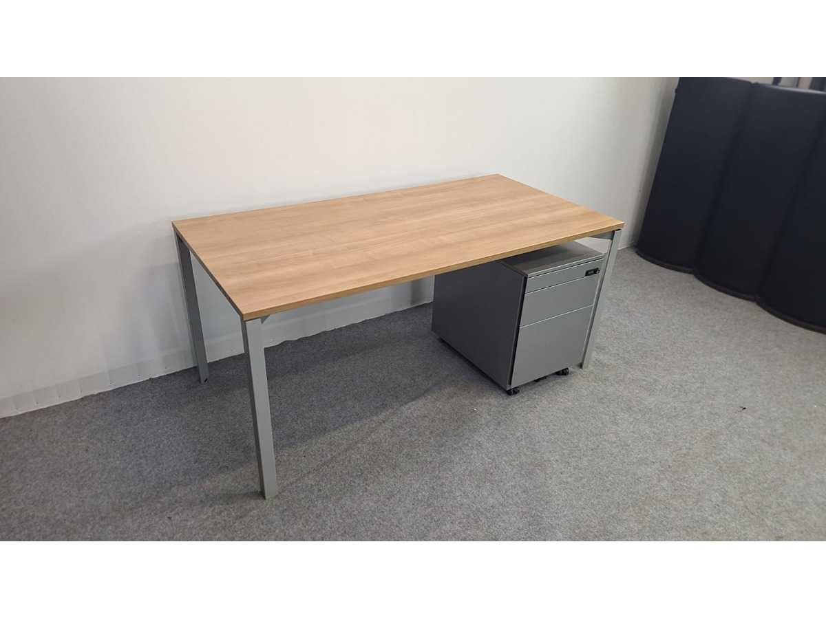 Onderstel in metaal kleur Alu, blad in melamine klaur lichte Havanna, in goede staat, inclusief mobiel ladenblok Drisag in metaal kleur Alu uitgerust met 1 dossierlade + 1 gewone lade + 1 pennelade + codeslot (gereset op 000), goede staat sleutel ontbreekt Merk: BENE Kleur: Alu-Havanna Gewicht: 60kg Lengte: 160cm Hoogte: 73cm Materiaal: Metaal, aluminium, hout, melamine, kunststof Diepte: 80cm