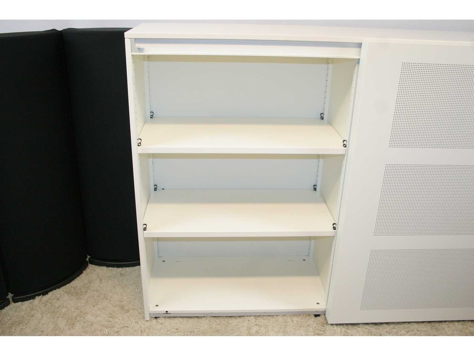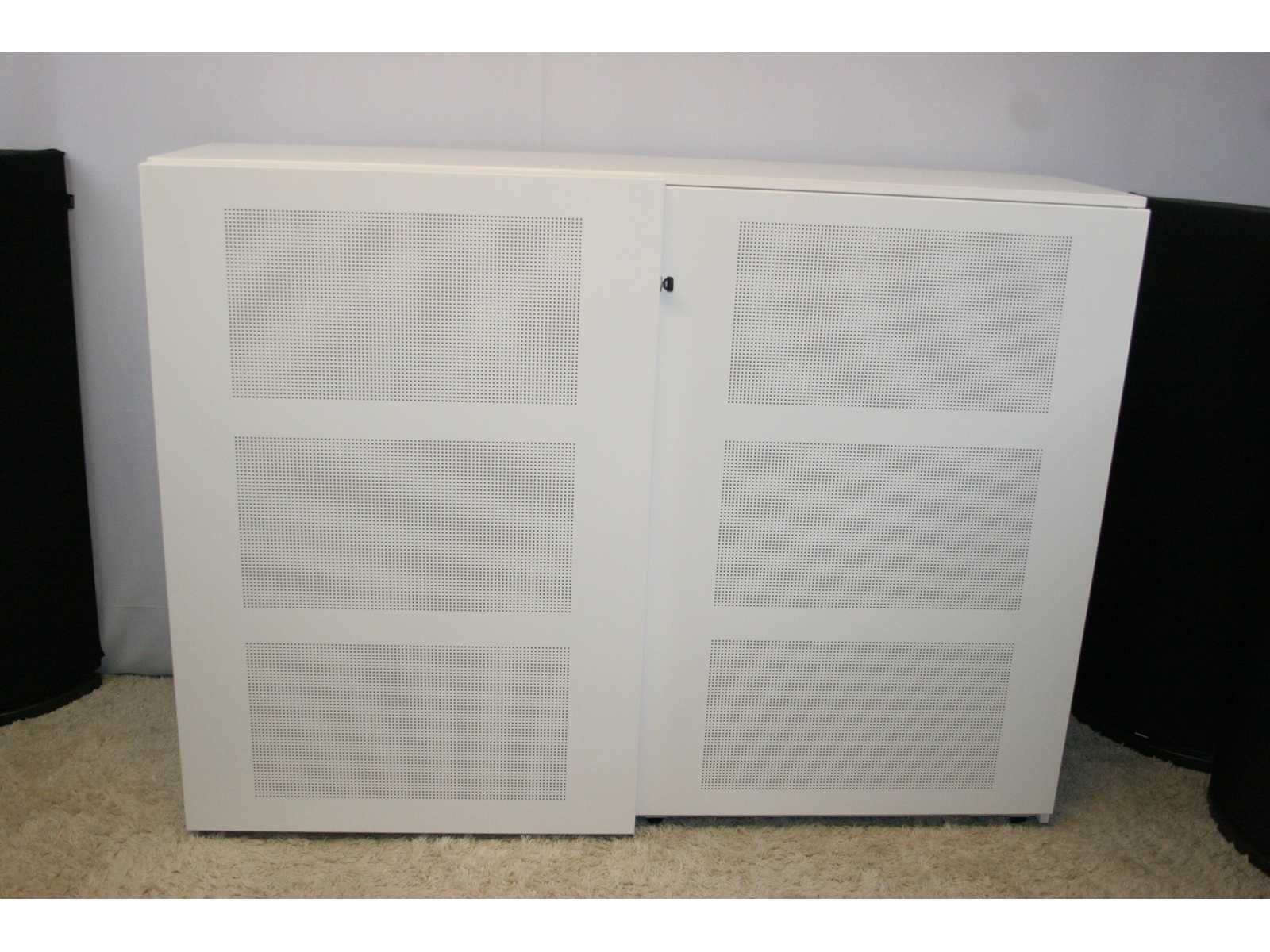 Volledig metalen kader kleur Wit, akoestische schuifeuren in metaal kleur Wit, 2 legplanken in metaal per zijde kleur Wit, top in melamine kleur Wit, afmetingen 1180 x 1600 x 500 mm, in goede staat enkel lichte verkleuring van de zijkant van de top door UV inwerking, foto's indicatief Merk: Ahrend Kleur: Wit Gewicht: 120kg Breedte: 160cm Hoogte: 118cm Materiaal: Metaal, kunststof, aluminium Diepte: 50cm