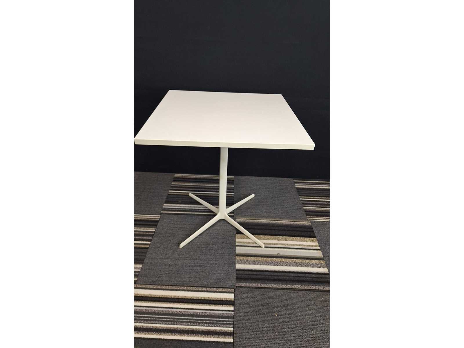 Centrale voet in aluminium kleur Wit, blad in melamine kleur Wit, goede staat Merk: NN Kleur: Wit Gewicht: 60kg Lengte: 70cm Breedte: 70cm Hoogte: 73cm Materiaal: Aluminium, hout, melamine