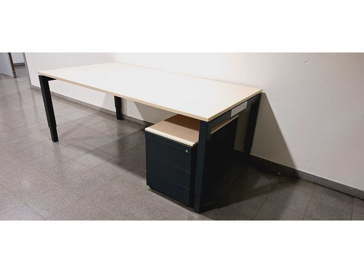 In hoogte verstelbaar onderstel in metaal kleur antraciet, werkblad in melamine kleur Esdoorn, ladenblok uitgerust in metaal kleur antraciet uitgerust met 3 lades + pennenlade, gebruikssporen mogelijk, foto's indicatief. Merk: Pami Kleur: Antraciet - Esdoorn Gewicht: 100kg Lengte: 200cm Hoogte: 62-82cm Materiaal: Metaal, aluminium, kunststof, hout, melamine Diepte: 100cm