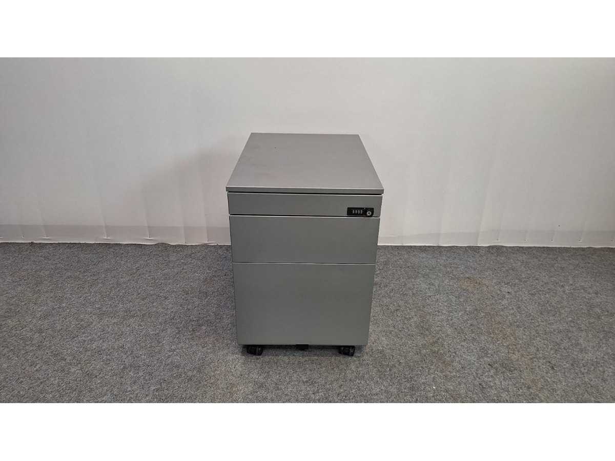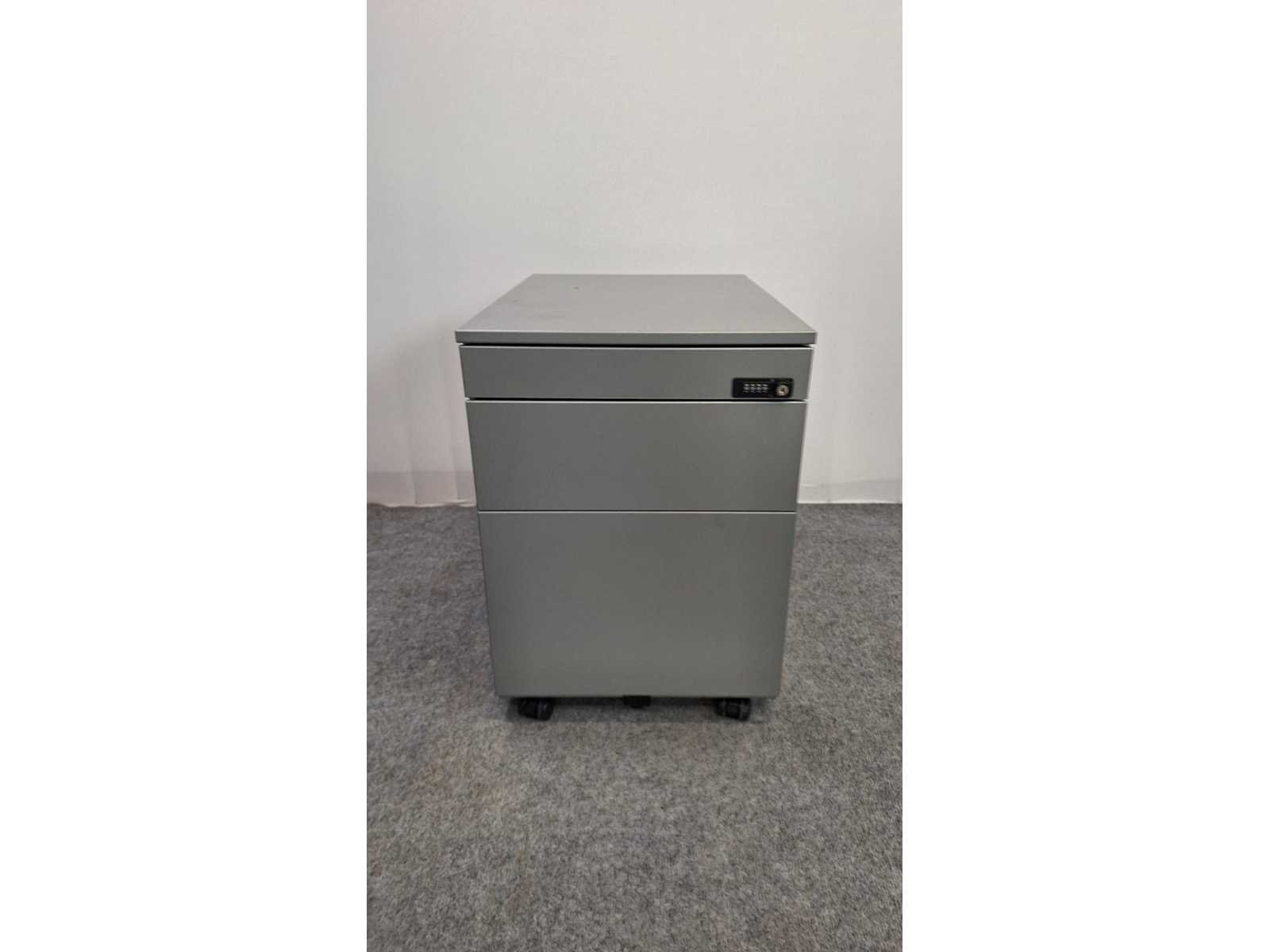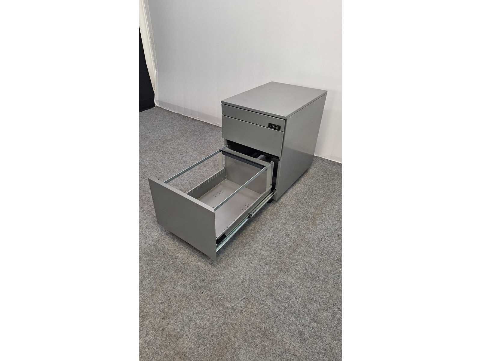 Mobiel ladenblok volledig in metaal kleur Alu, voorzien van 1 dossierlade + 1 gewone lade + 1 pennenlade + cijferslot (code 0000), nieuw in verpakking, geen sleutel Merk: Drisag Kleur: ALu Gewicht: 25kg Breedte: 42cm Hoogte: 61cm Materiaal: Metaal, kunststof Diepte: 62cm
