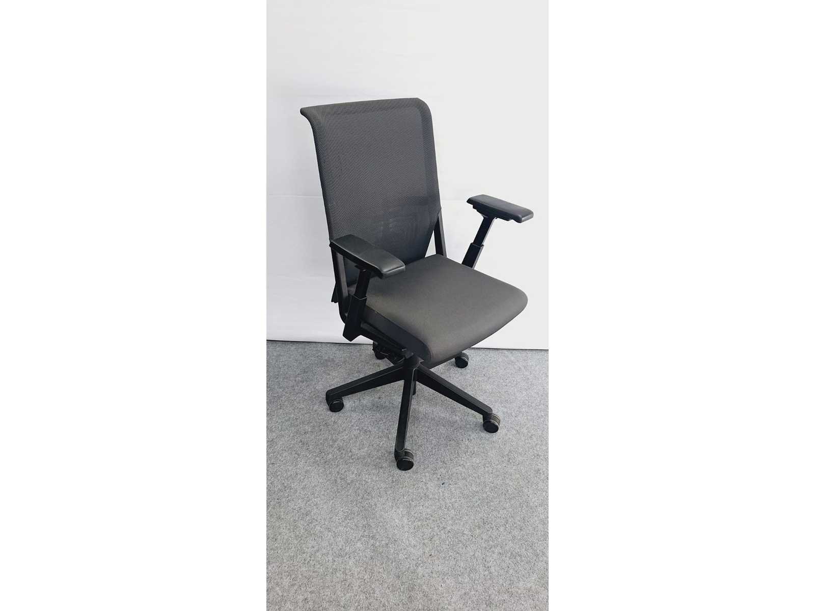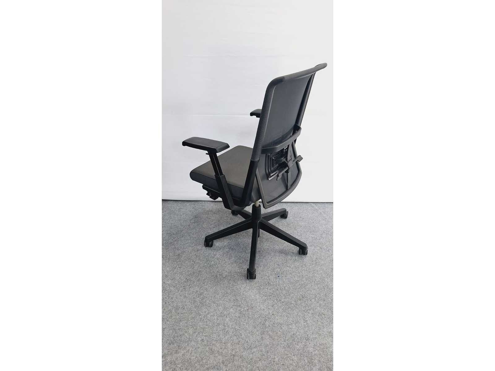 Kruisvoet in kunststof kleur Zwart voorzien van standaard zwenkwielen, zitting bekleed in stof kleur Antraciet, rugleuning in netweave kleur Antraciet, in hoogte verstelbaar, synchromechanisme met gewichtsinstelling, instelbare zitdiepte, verstelbare lende steun, in goede staat maar kleine beschadiging aan netweave (zie foto) Merk: Haworth Type: System 59 Kleur: Antraciet Gewicht: 30kg Breedte: 70cm Hoogte: 100cm Diepte: 70cm Materiaal: Metaal, kunststof, aluminium, stof