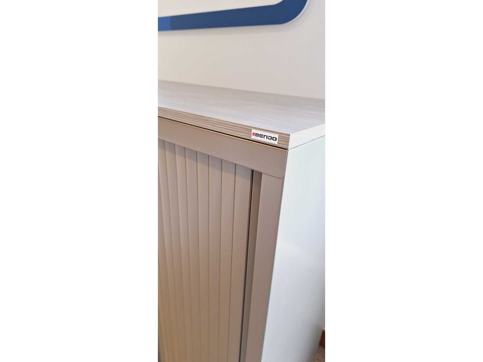 Tweedelige kast in metaal kleur licht Antraciet, roldeuren in kunststof kleur licht licht Antraciet, top in melamine kleur Robson EIk, 2 legplanken per kant, goede staat maar sleutels kunnen ontbreken, afm. 1600 x 1200 , foto's indicatief. Merk: Benjo Kleur: Antraciet-Robson Eik Gewicht: 80kg Lengte: 160cm Hoogte: 120cm Materiaal: Metaal, kunststof Diepte: 45cm Aantal laden: 2